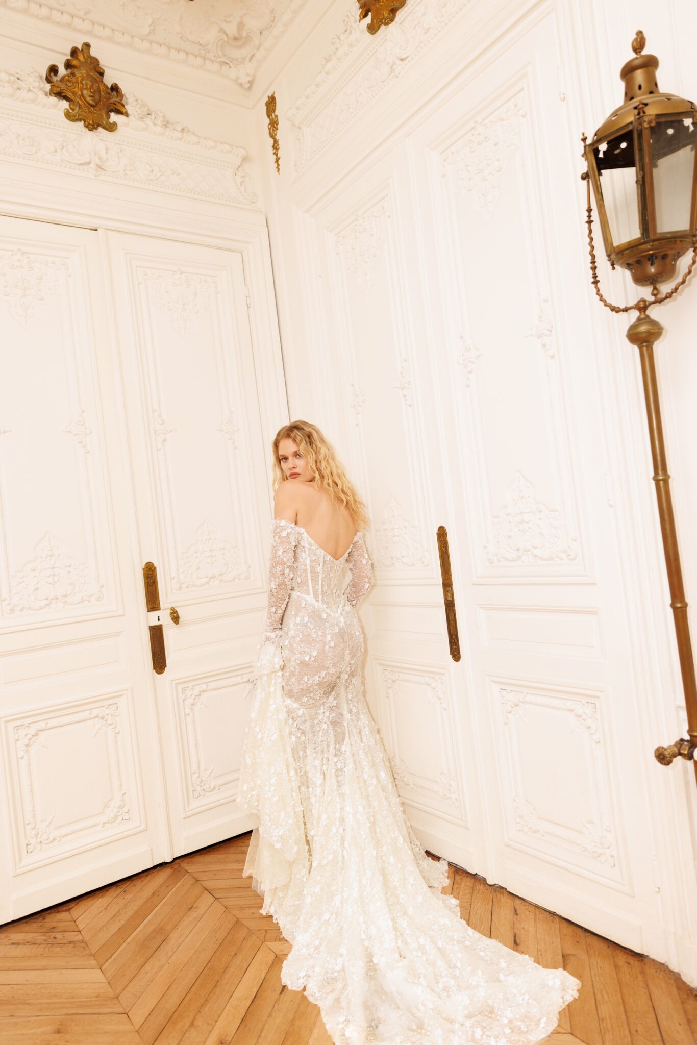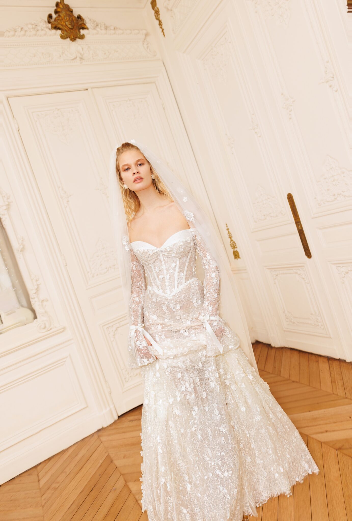 Один з найбільш продуманих дизайнів: квіткові аплікації ручної роботи прикрашають всю сукню – від декольте у формі серця з відкритими плечима до самого краю шлейфу. Довгі рукави з воланами на манжетах надають додаткової ніжності цій ретельно продуманій та жіночній сукні. До сукні також пропонується фата, прикрашена такими ж квітковими аплікаціями.