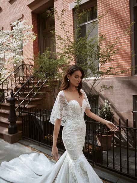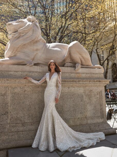 Bellini – фантастична сукня А-силуету виконана з глянцевого атласу. Верх сукні вирізняється глибоким V-подібним вирізом і об’ємними рукавами. Ніжний поясок з цієї ж тканини підкреслює лінію талії, а спинка сукні відкривається V-подібним вирізом. Спідниця вільно спадає, має високий розріз на одній ніжці та довгий королівський шлейф.