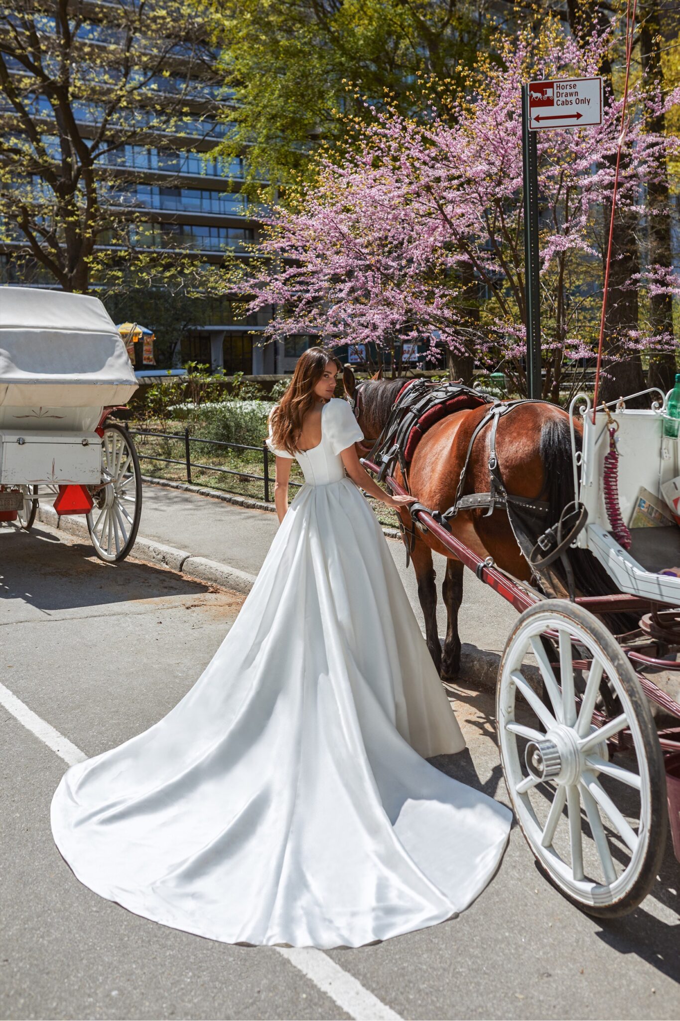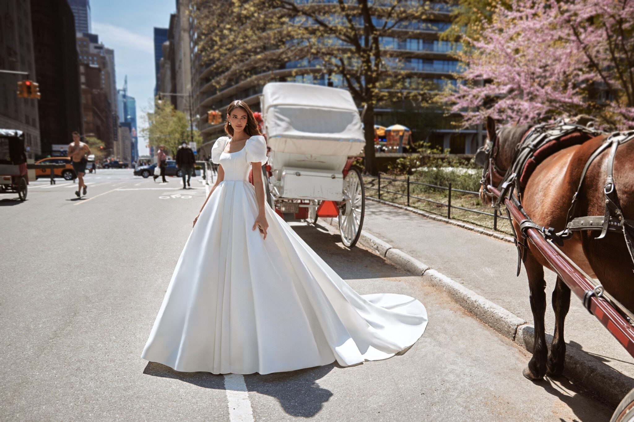 Bronte – сукня, яка чудово підійде для створення весільного образу принцеси. Пишна сукня створена з сяючої тканини і не має додаткового декору. Корсет прикрашений ніжним вирізом і об’ємними рукавами довжини до ліктя з воланами в зоні плечей. Пишна спідниця силуету “Ball Gown” прямо спадає і має довгий шлейф.