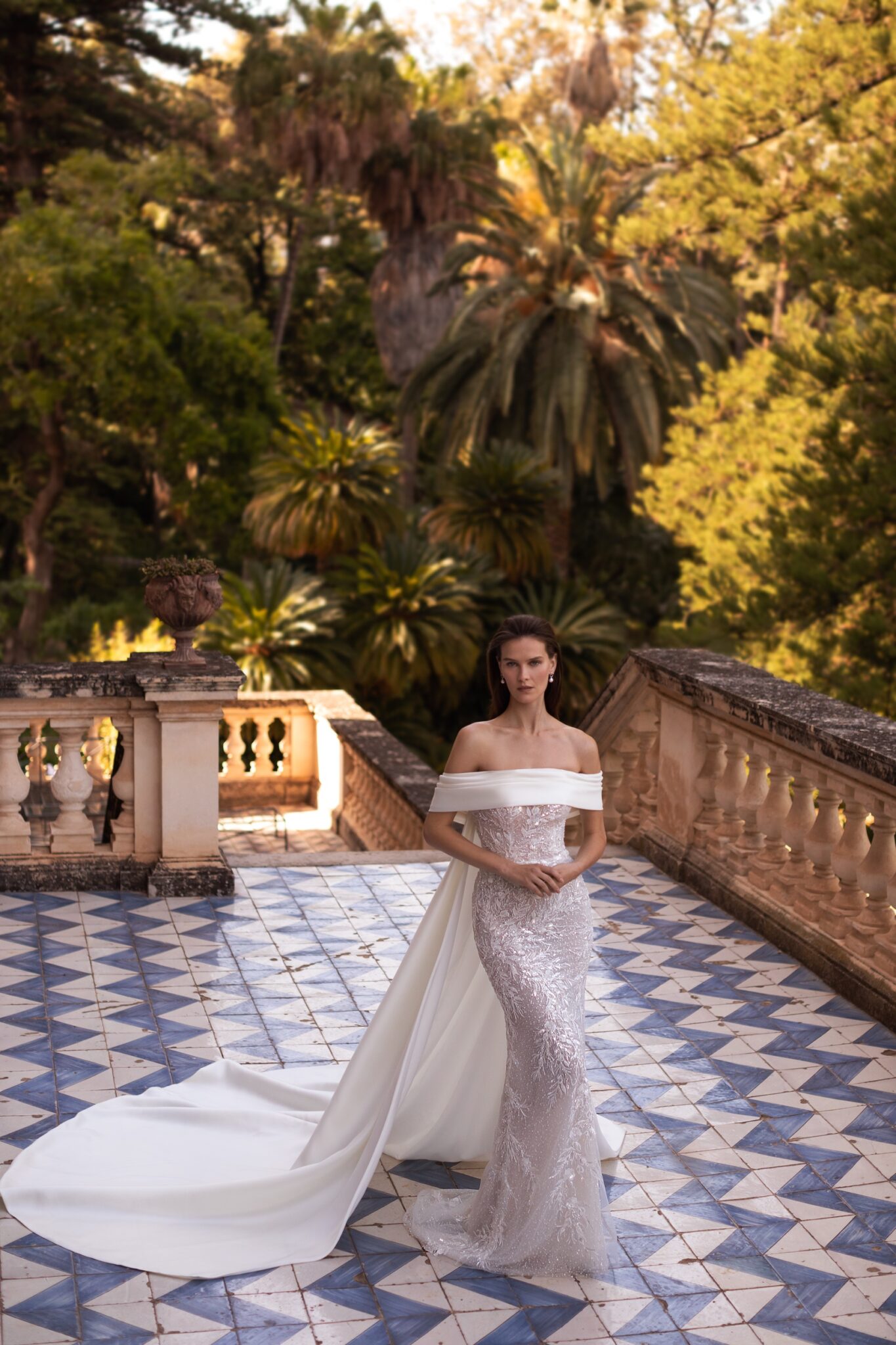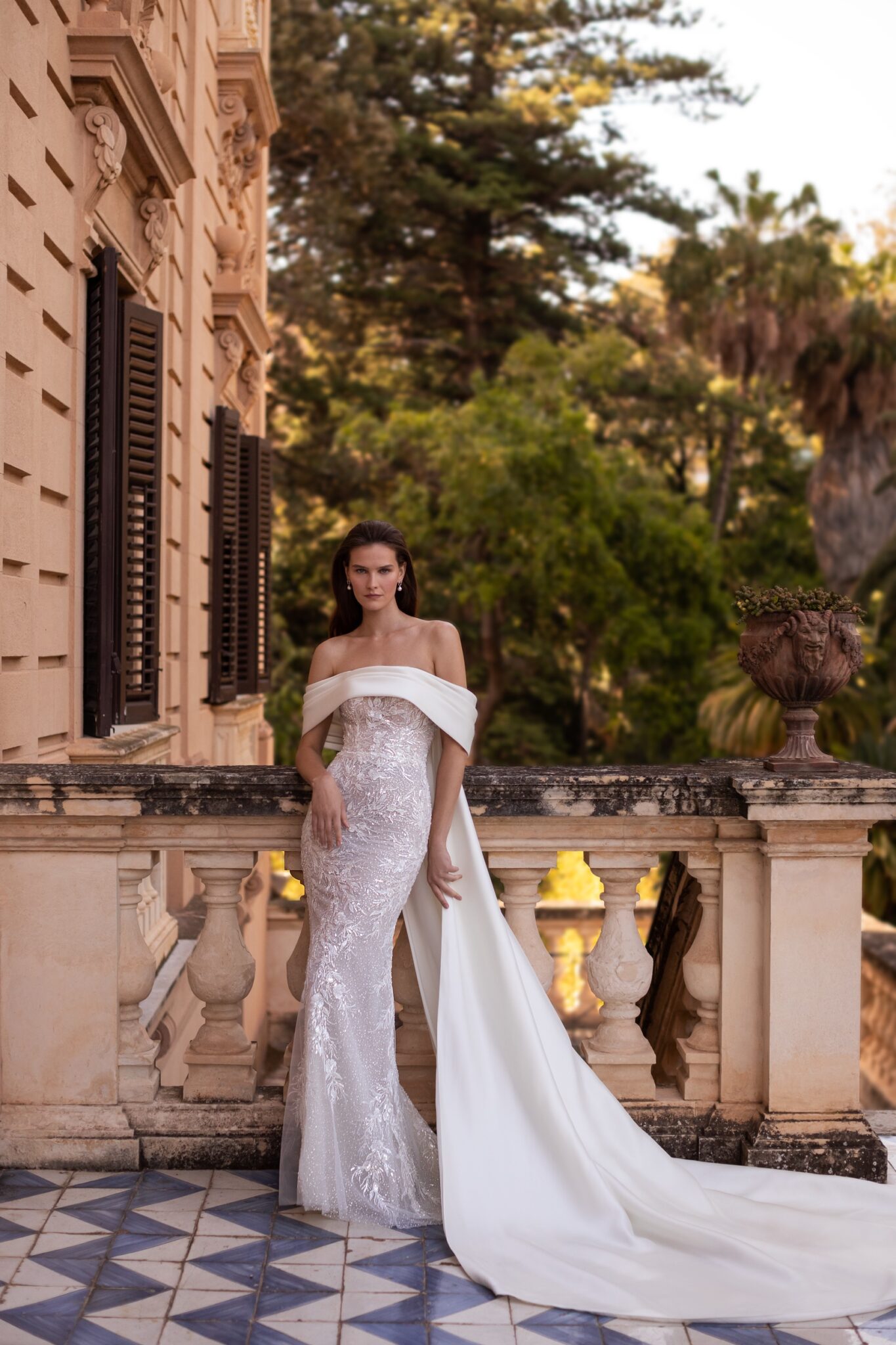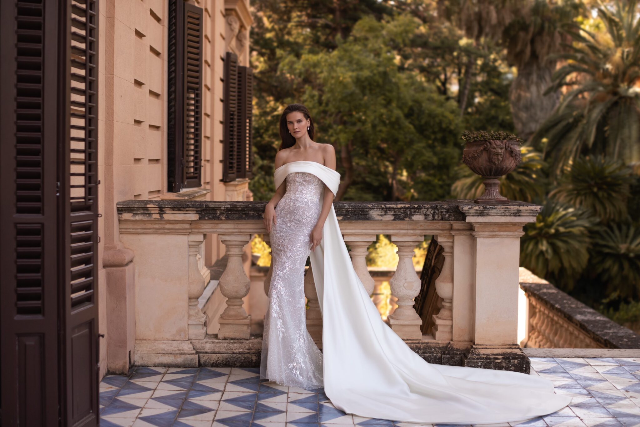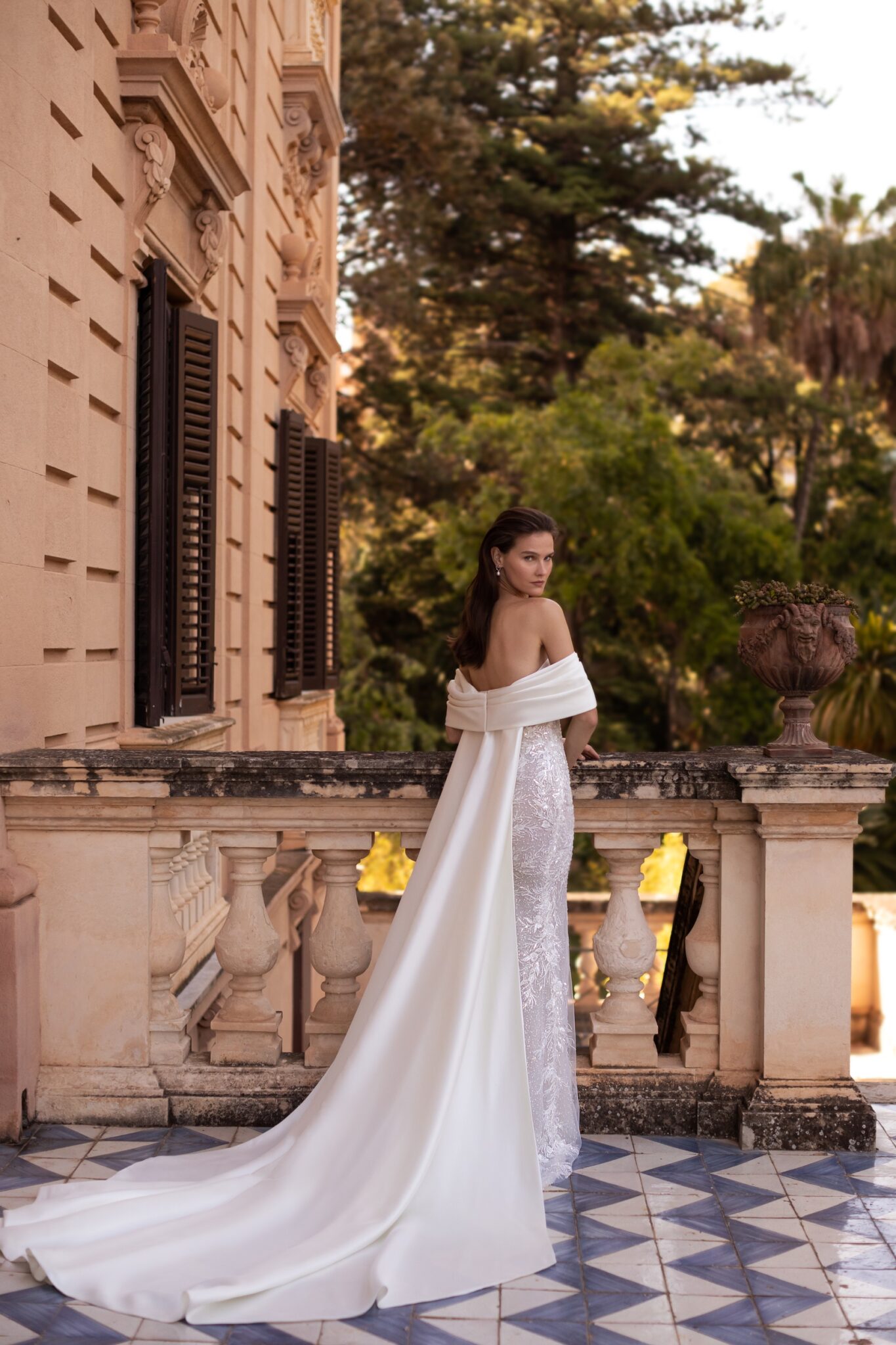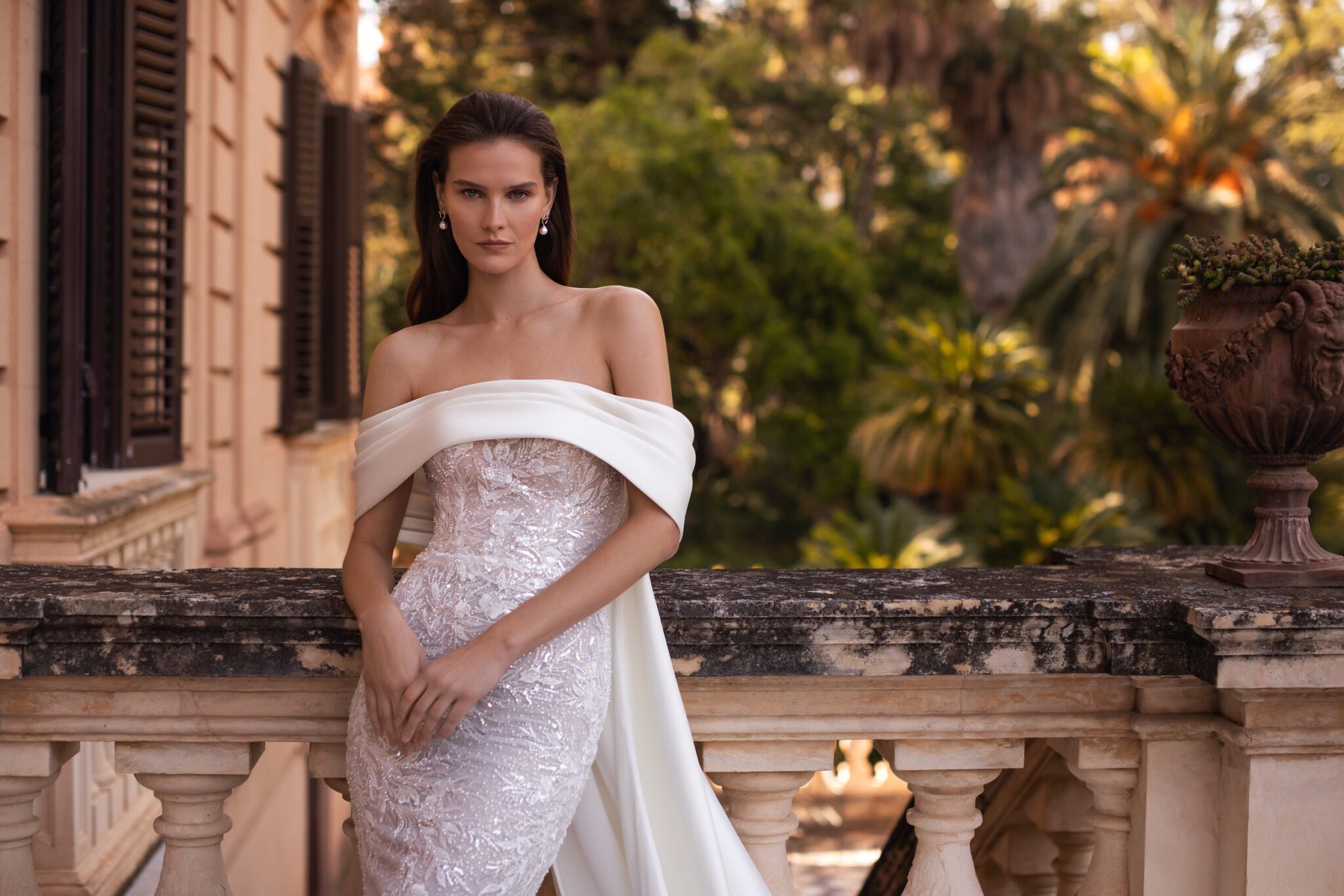 Ця сукня, повністю прикрита паєтками, ідеально облягає фігуру, її образ виразний та вишуканий. Прозорий безтрішник на корсеті і органічний малюнок вишивки на спеціальній сітці відповідає зібраній накидці з відкритими плечима та переходить у неперевершений плащ з великим шлейфом.