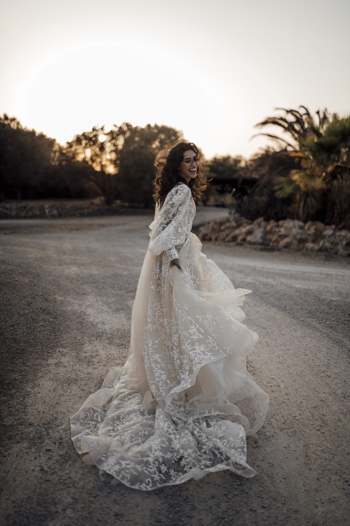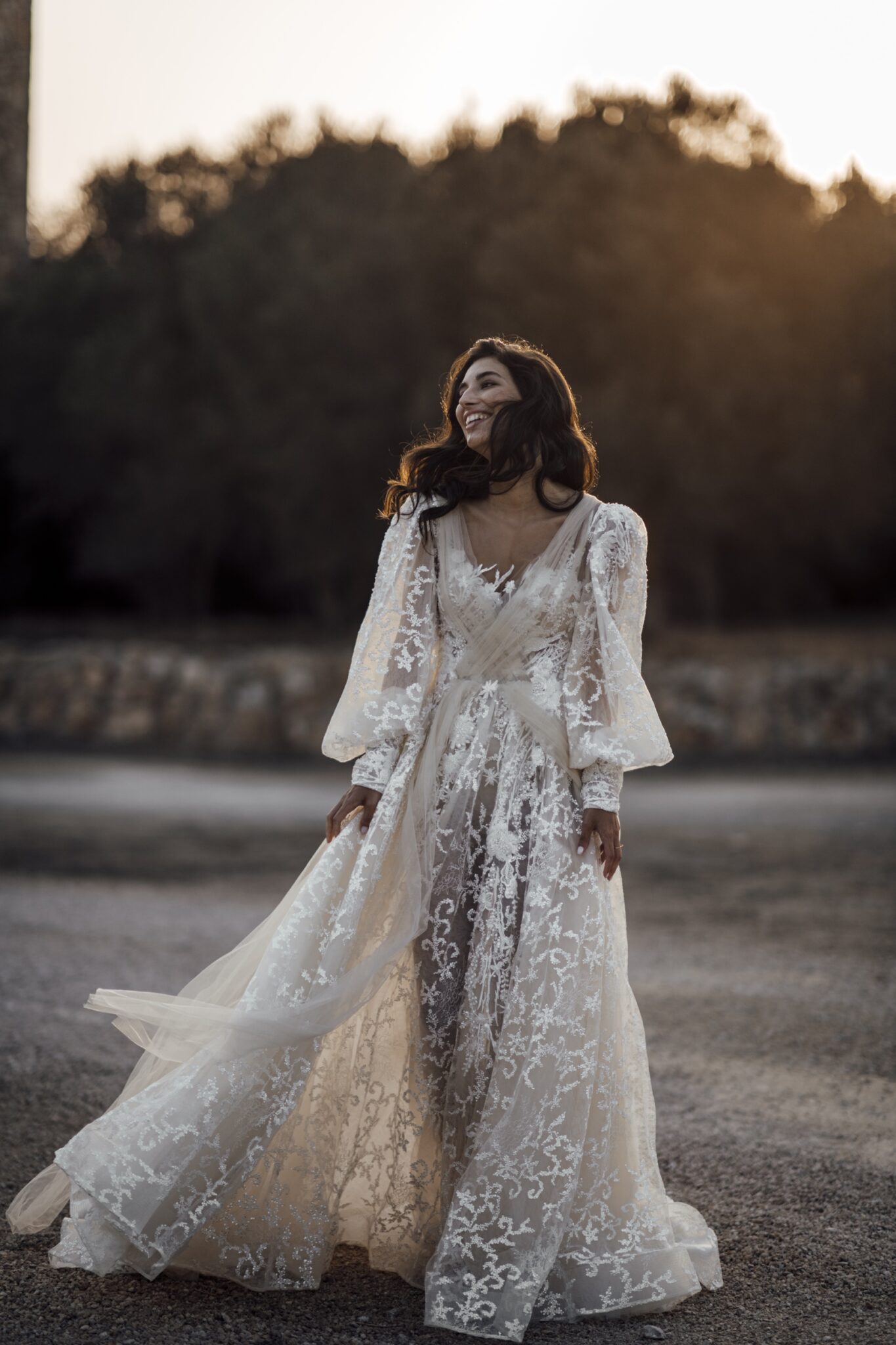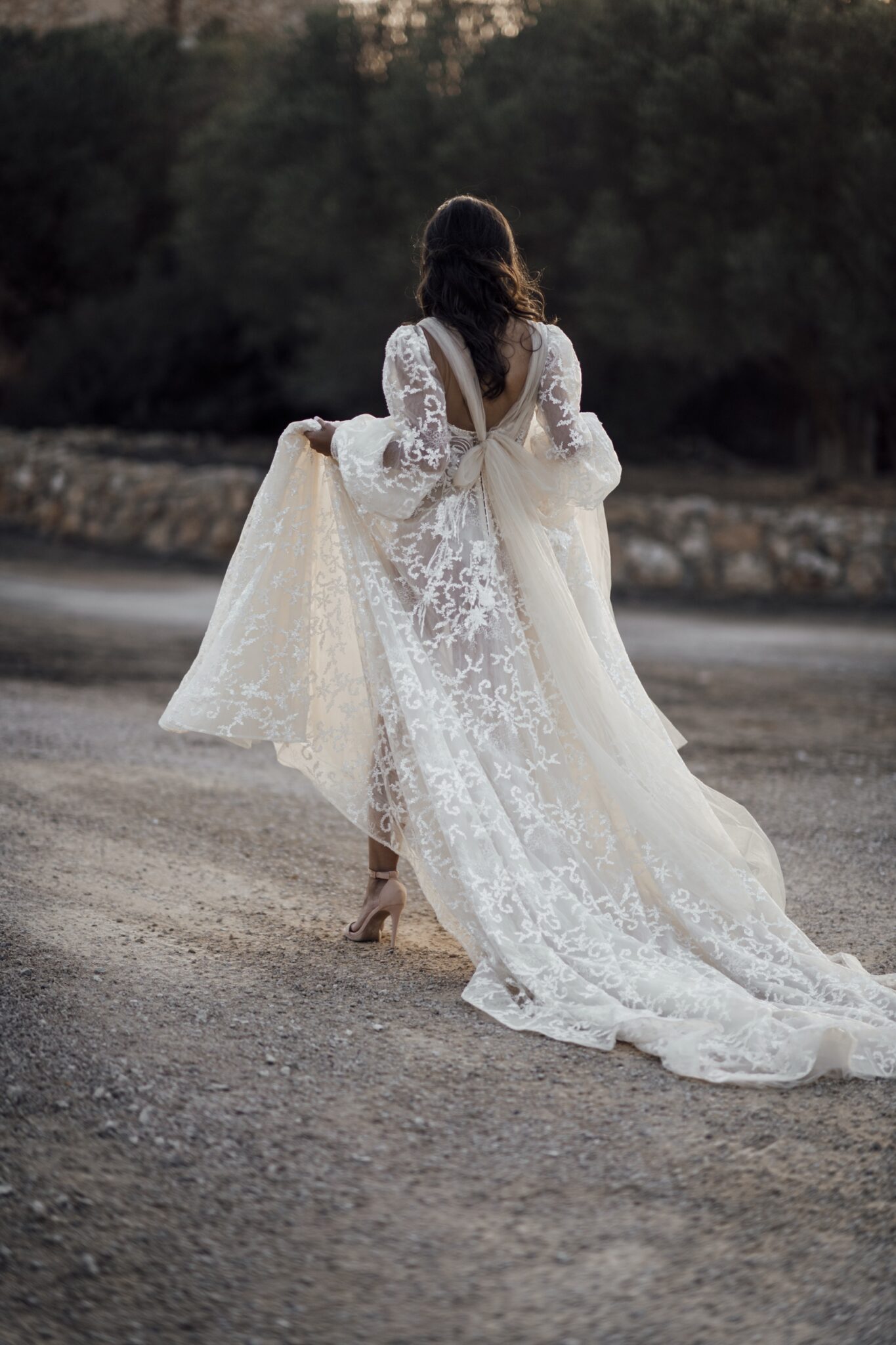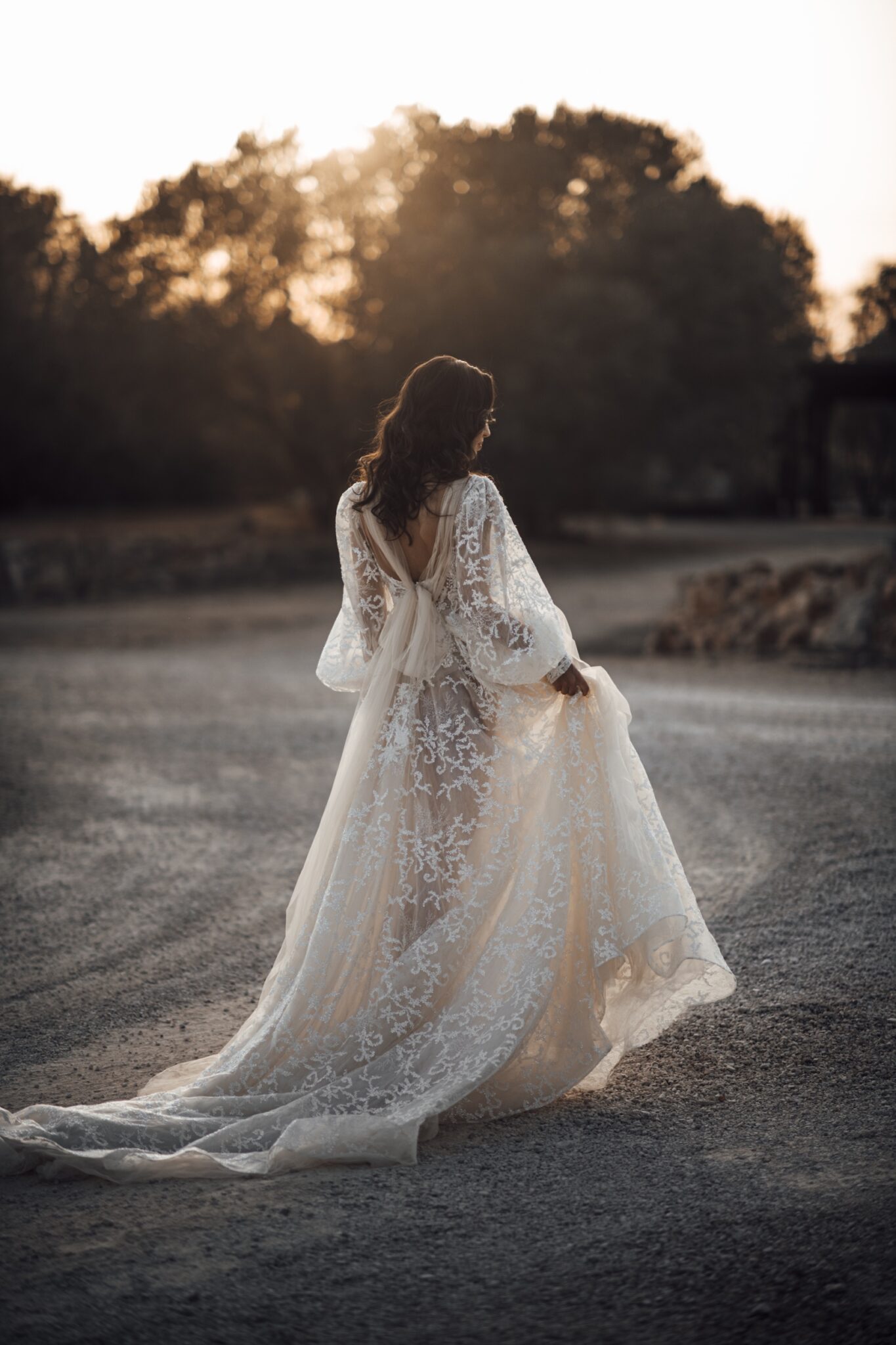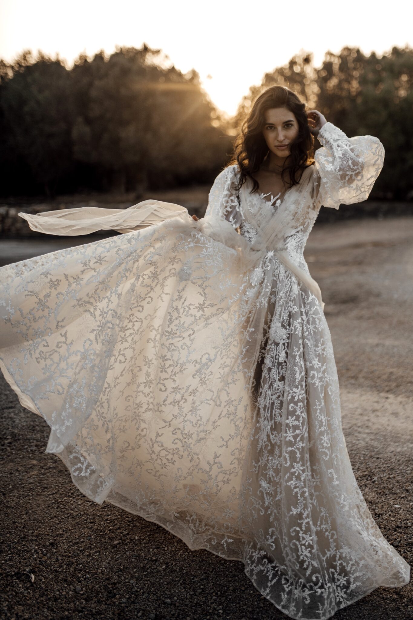Вражаюче весільне плаття Candice захоплює подих. Поєднання різних матеріалів створює легкий і повітряний образ. Весільна сукня виконана з прозорої тканини з квітковим візерунком. Довгі, легкі рукава виглядають фантастично. Вуалеві вставки спереду і ззаду сукні зав’язані в бант.