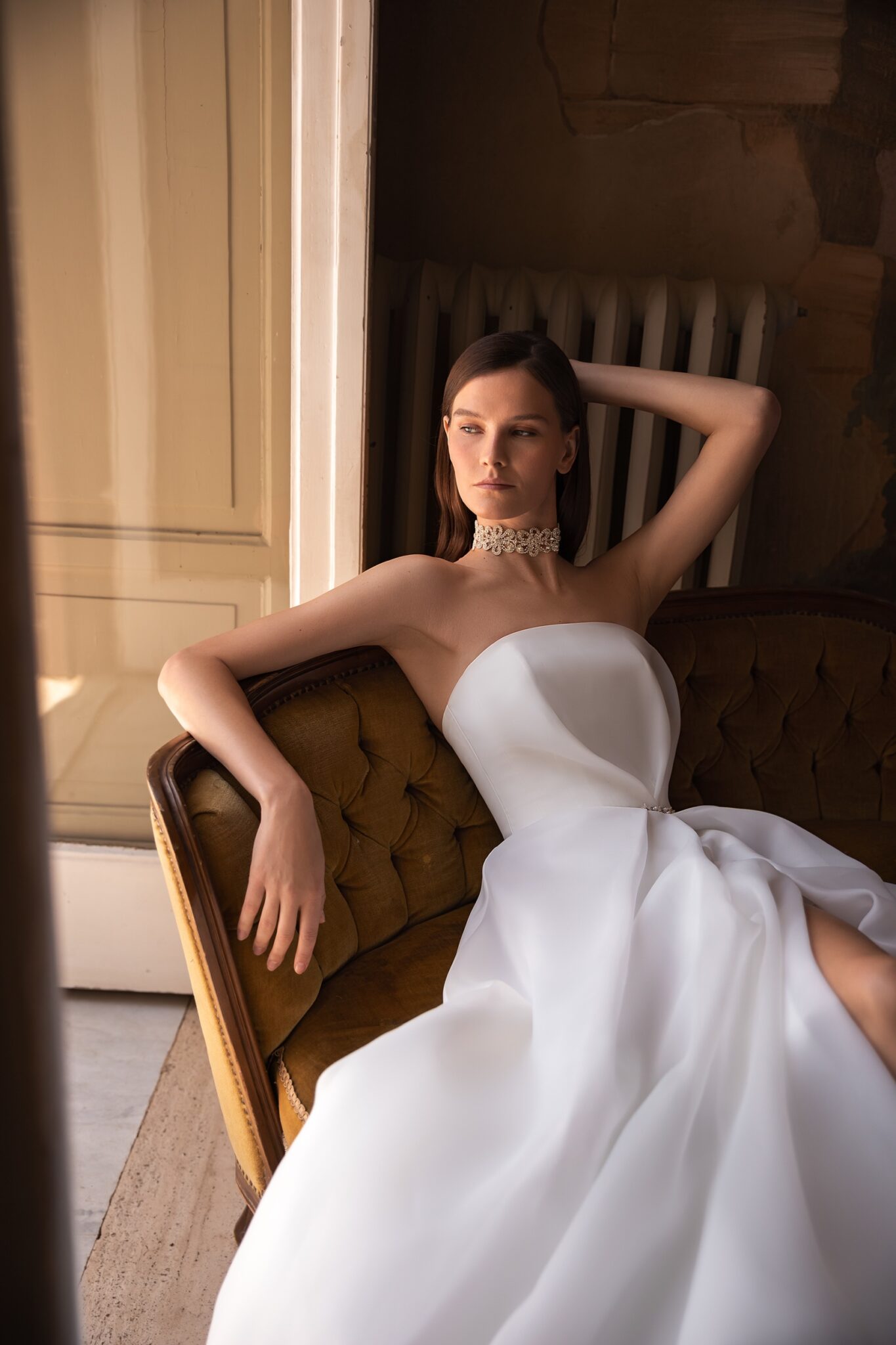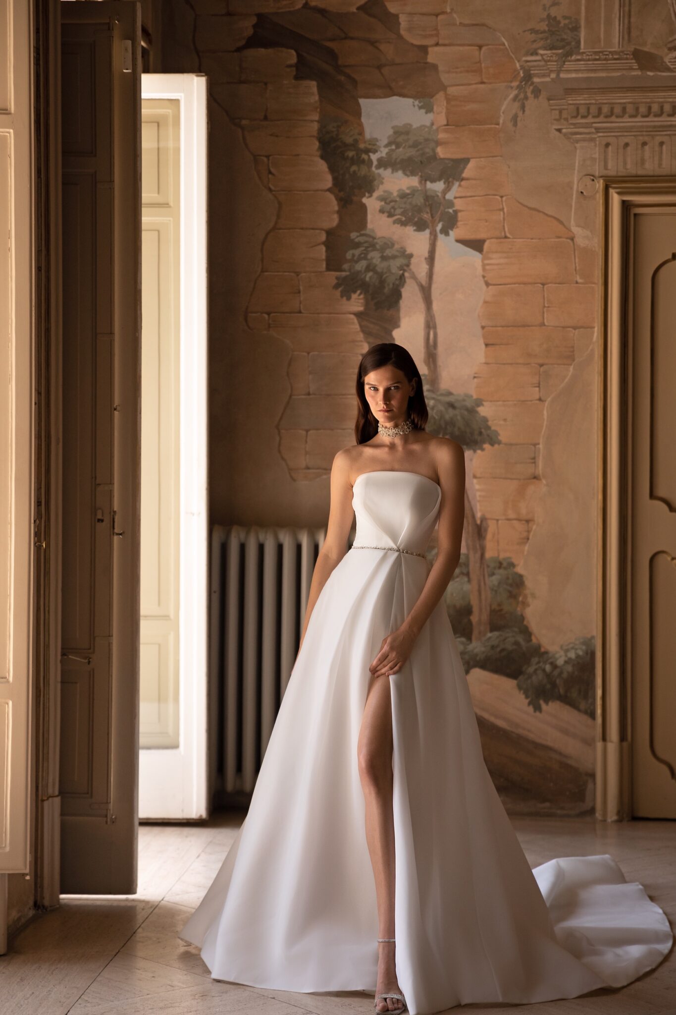 Ця класична бальна сукня виконана з легкої органзи і має безплічевий корсет з прямим вирізом і м’якими складками. Блискучий пояс з кристалами підкреслює фігуру нареченої, а м’яка об’ємна спідниці з розрізом до стегна спадає в довгий шлейф, який творить розкішний катедральний шлейф.