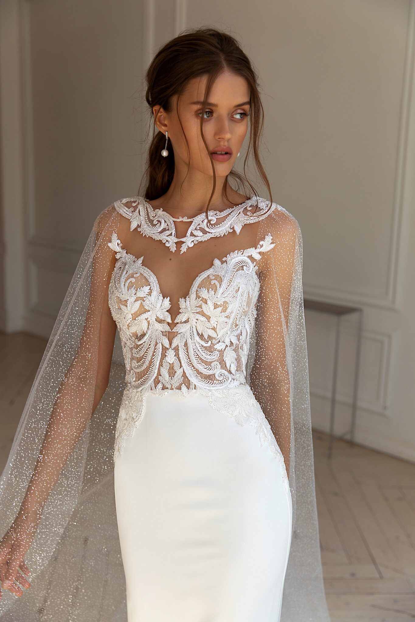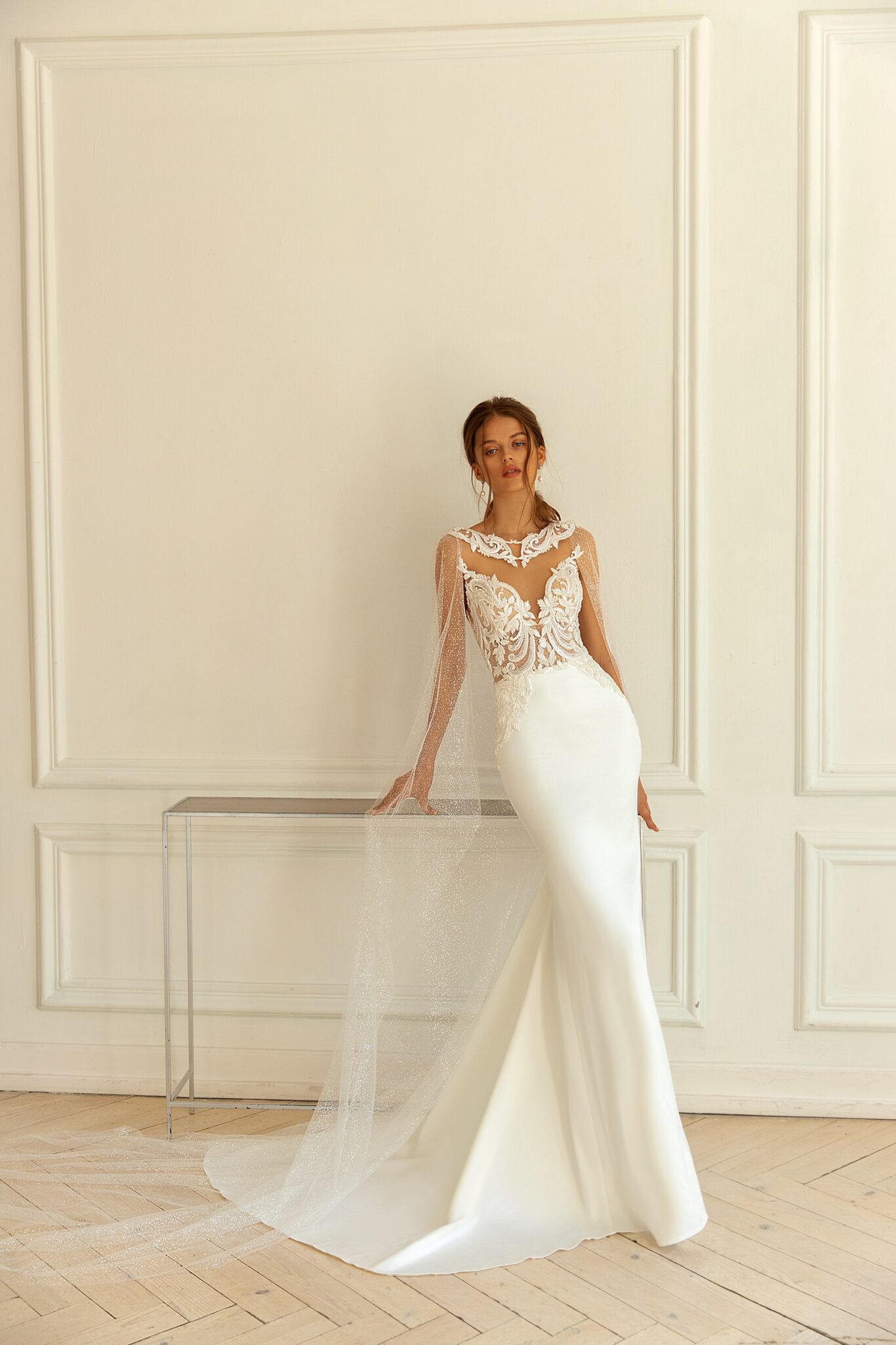 Dayana – це лаконічна та вишукана весільна сукня у стилі A-line. Верхня частина сукні прикрашена V-подібним вирізом. Корсет повністю вишитий розкидистими квітами, намистинами, пайєтками та кристалами. Відлітаюча спідниця переходить в довгий шлейф.