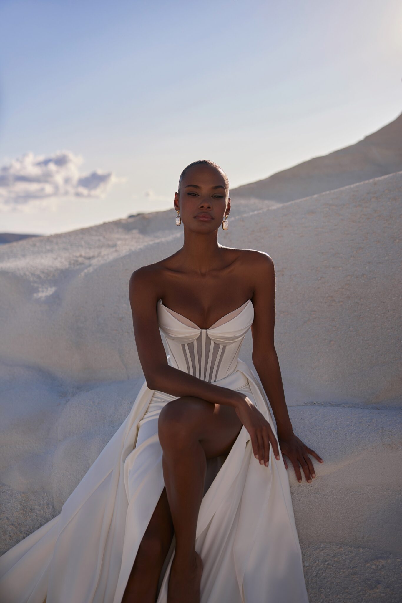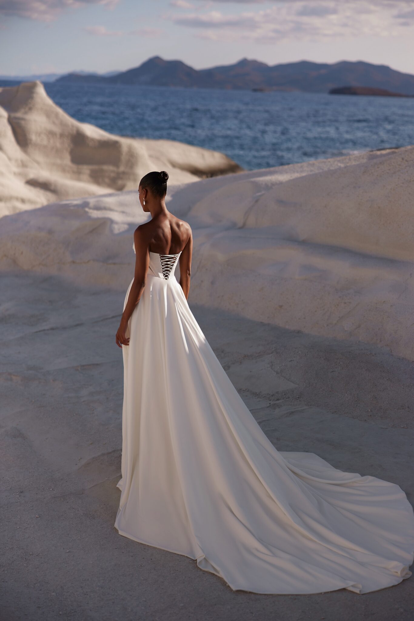 Корсетна сукня з посиленим ліфом та витонченим силуетом. Спідниця м’яко облягає стегна та має розріз з лівого боку. Верхня спідниця кріпиться ззаду, спускаючись у шлейф.