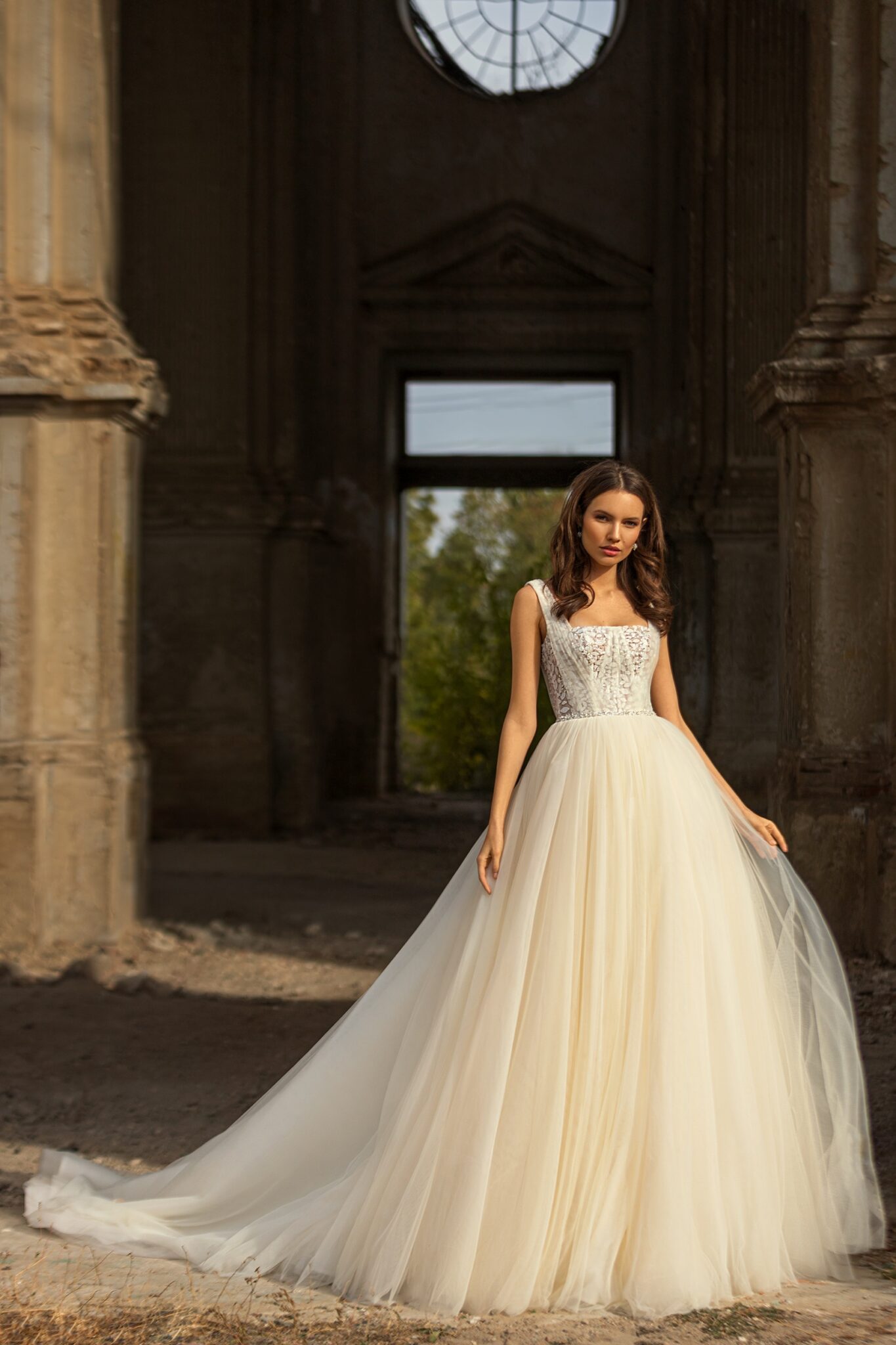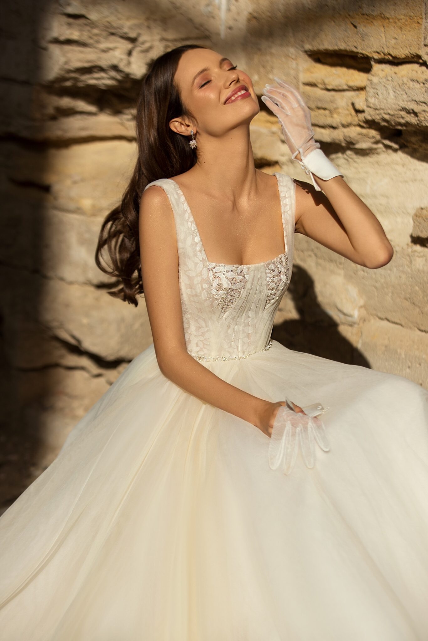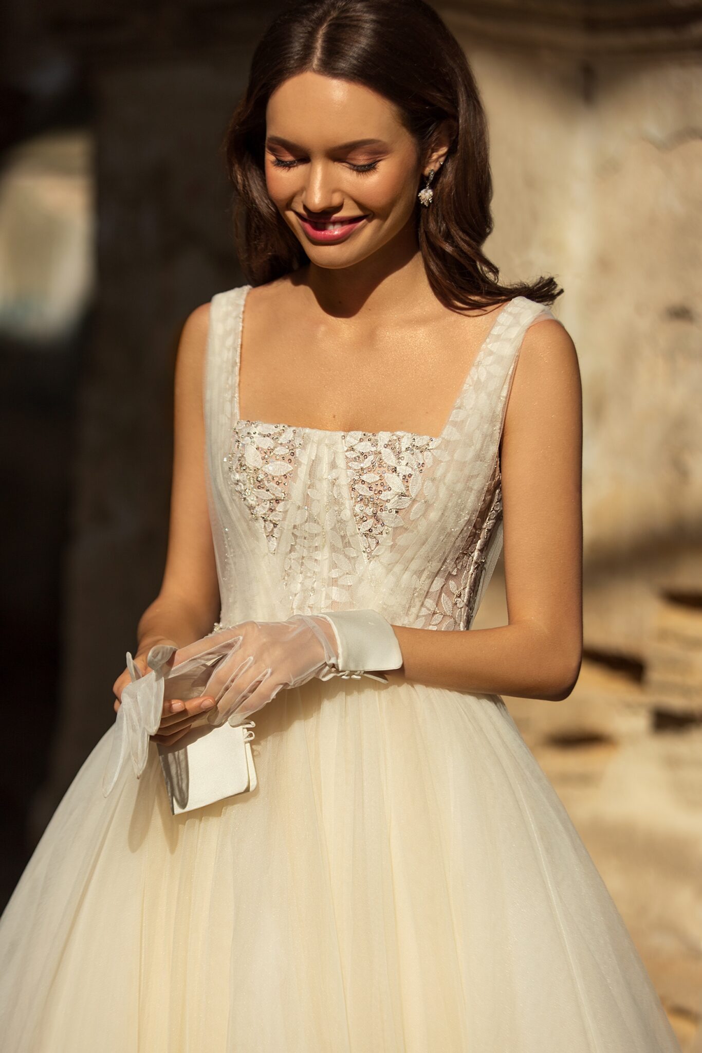 Dixie – це поєднання модного квадратного вирізу і унікального мережива з малюнком листя. Сукня виготовлена з тюлю і прикрашена витонченим блискучим поясом.