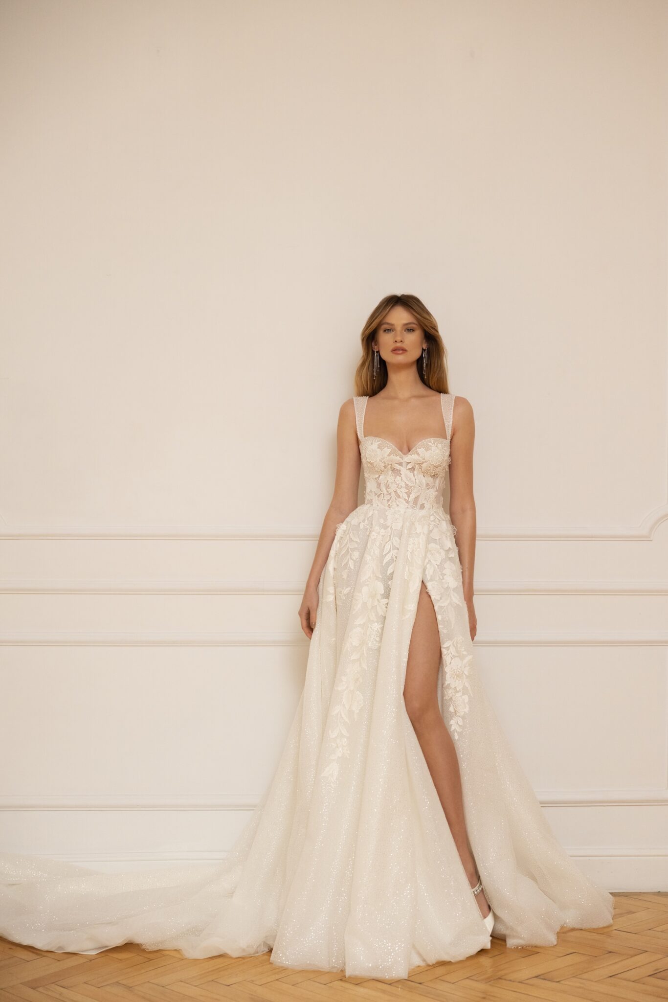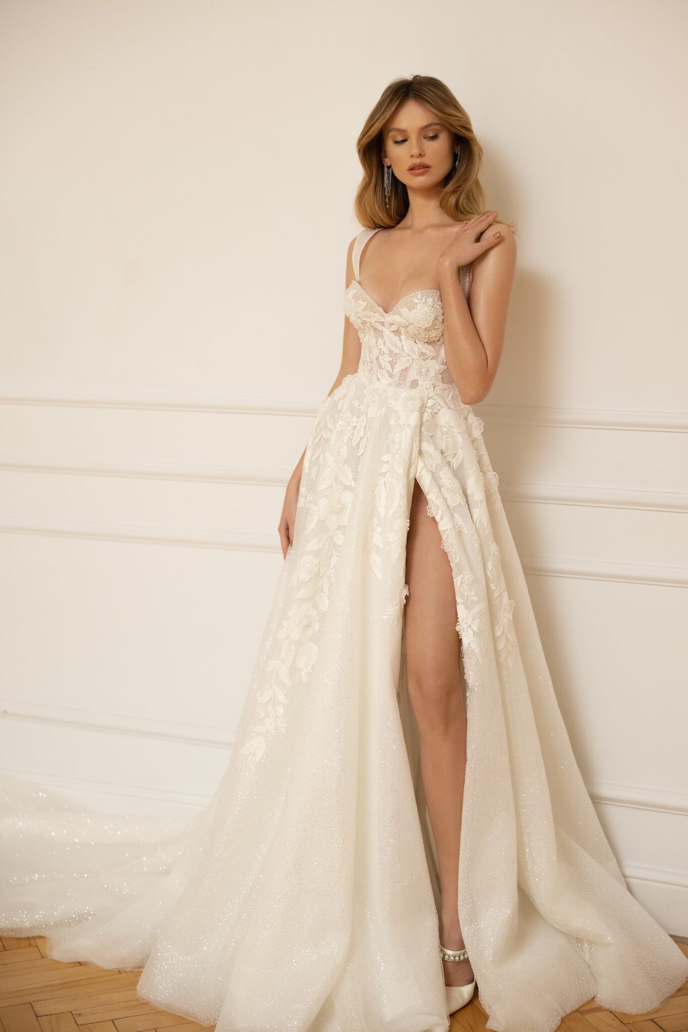 Мереживо Шантильї, прикрашене витонченими тривимірними квітковими аплікаціями, і повна шарована спідниця створюють найкращий образ королівської сукні. Мереживний корсет із глибоким вирізом у формі серця і широкими ремінцями залишають скромне, але сексуальне враження. Розкішна вишивка на спідниці, прикрашена розрізом до стегон, витягує силует і створює надзвичайно романтичний вигляд.