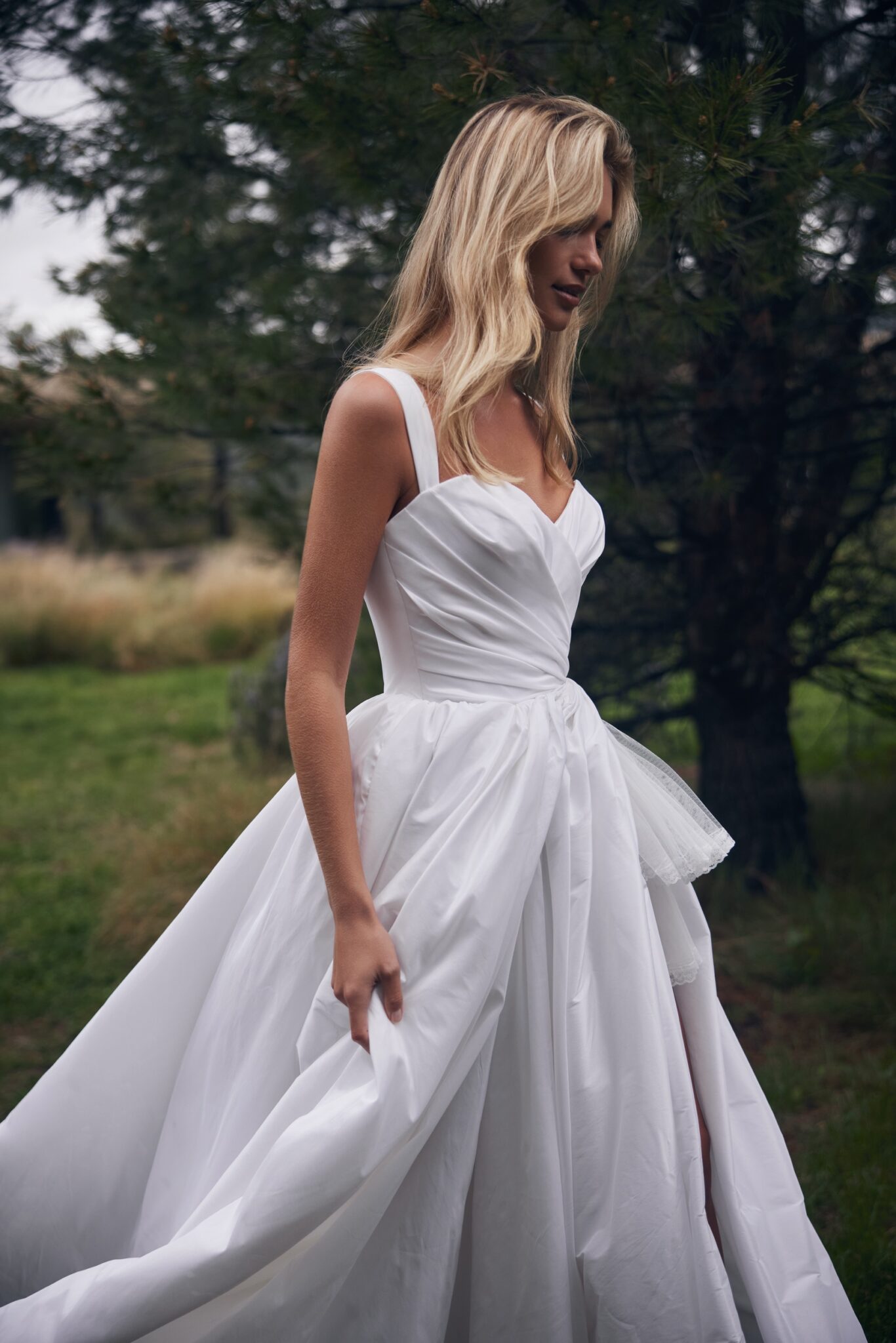 Драпірований корсет має романтичний виріз “сердечком” з делікатними бретелями, що підкреслює жіночу привабливість. Високий розріз на спідниці додає сміливого штриху, дозволяючи рухатись без зусиль і додаючи нотку драматизму.