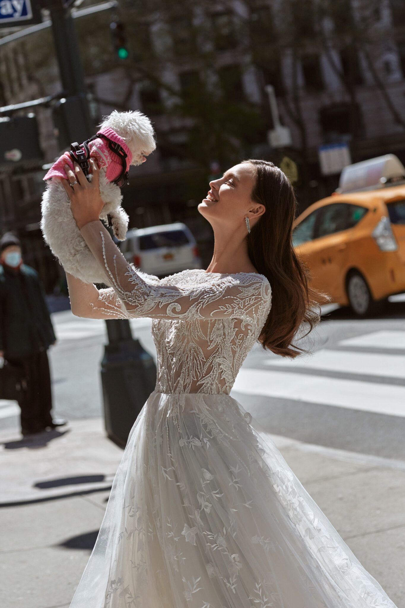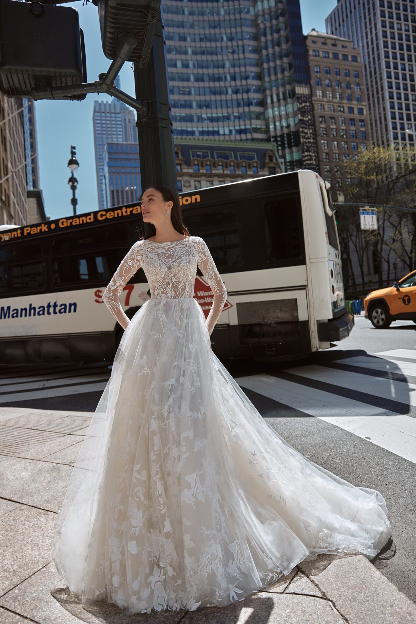Чудова весільна сукня у формі літери A. Верх сукні зроблений з прозорого мережива, яке прикрашене бісером і квітковим візерунком. Декольте, а також спина закриті, і рукави довгі. Спідниця виготовлена з численних шарів тюлю з квітковим візерунком і закінчується шлейфом.