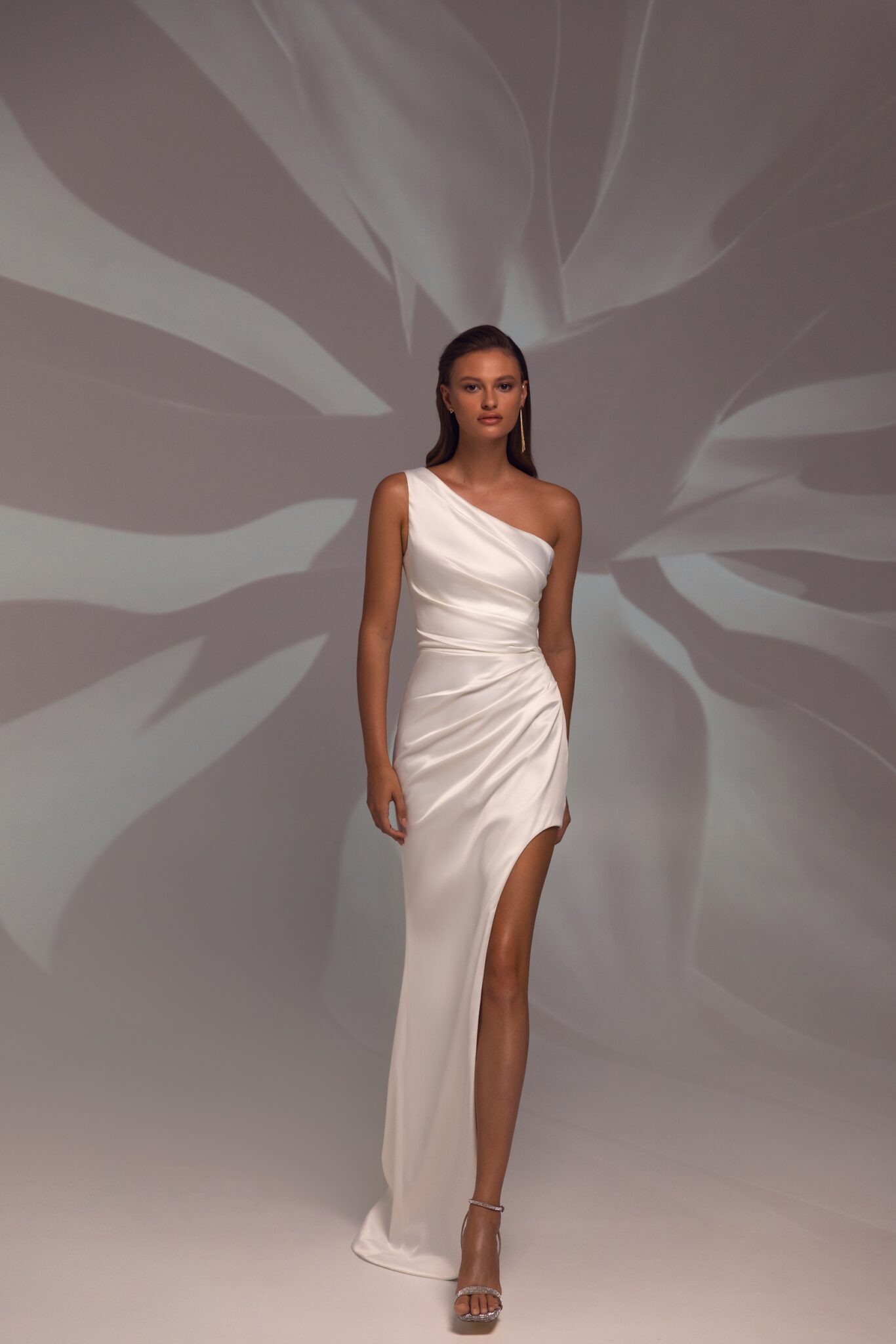 Спокуслива весільна сукня з високим розрізом. Топ має асиметричне декольте з лямкою на одне плече. Корсет і спідниця прикрашені драпіруванням і складками. Спідниця міні довжини з одного боку спадає на всю довжину з іншого, створюючи акуратний силует.