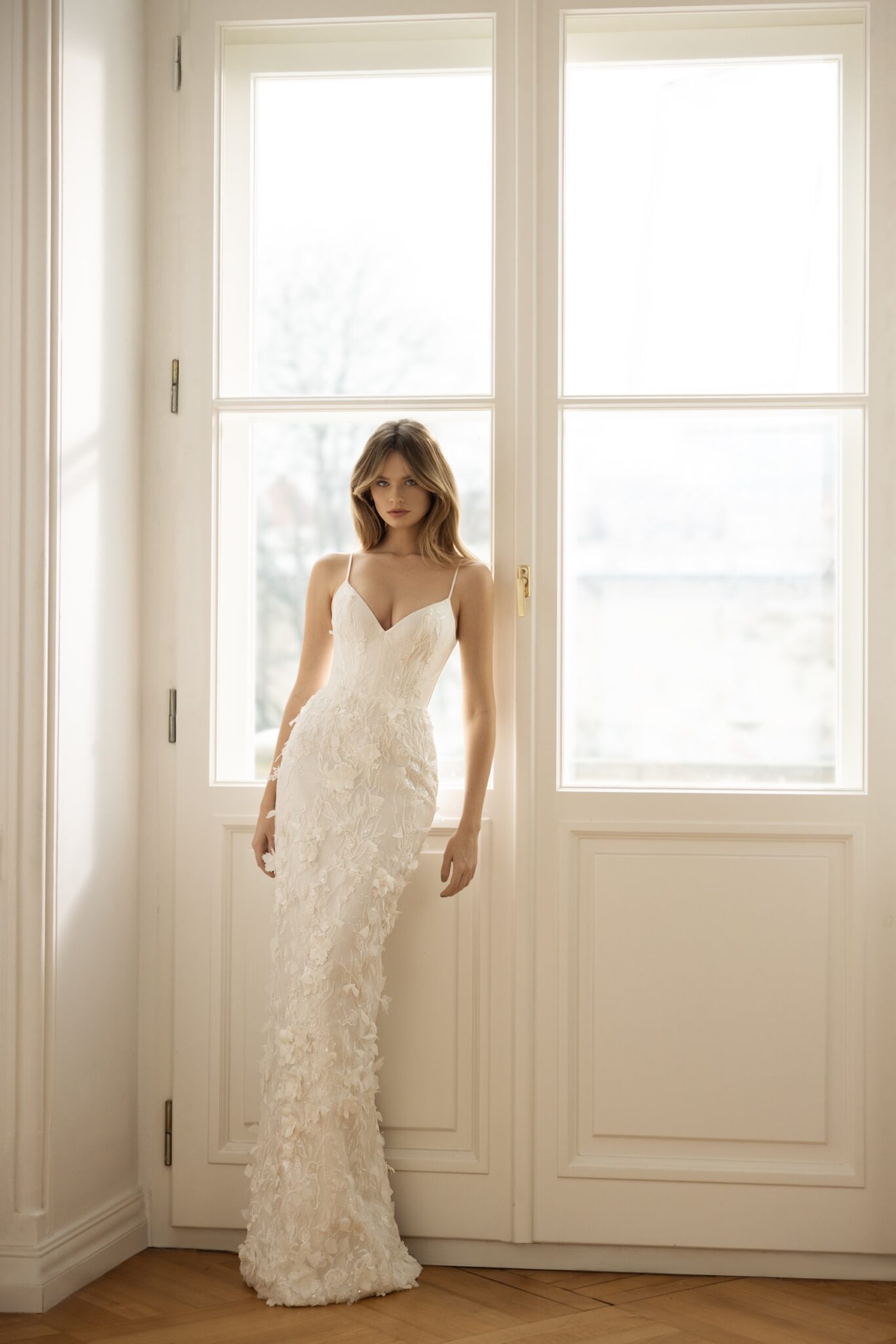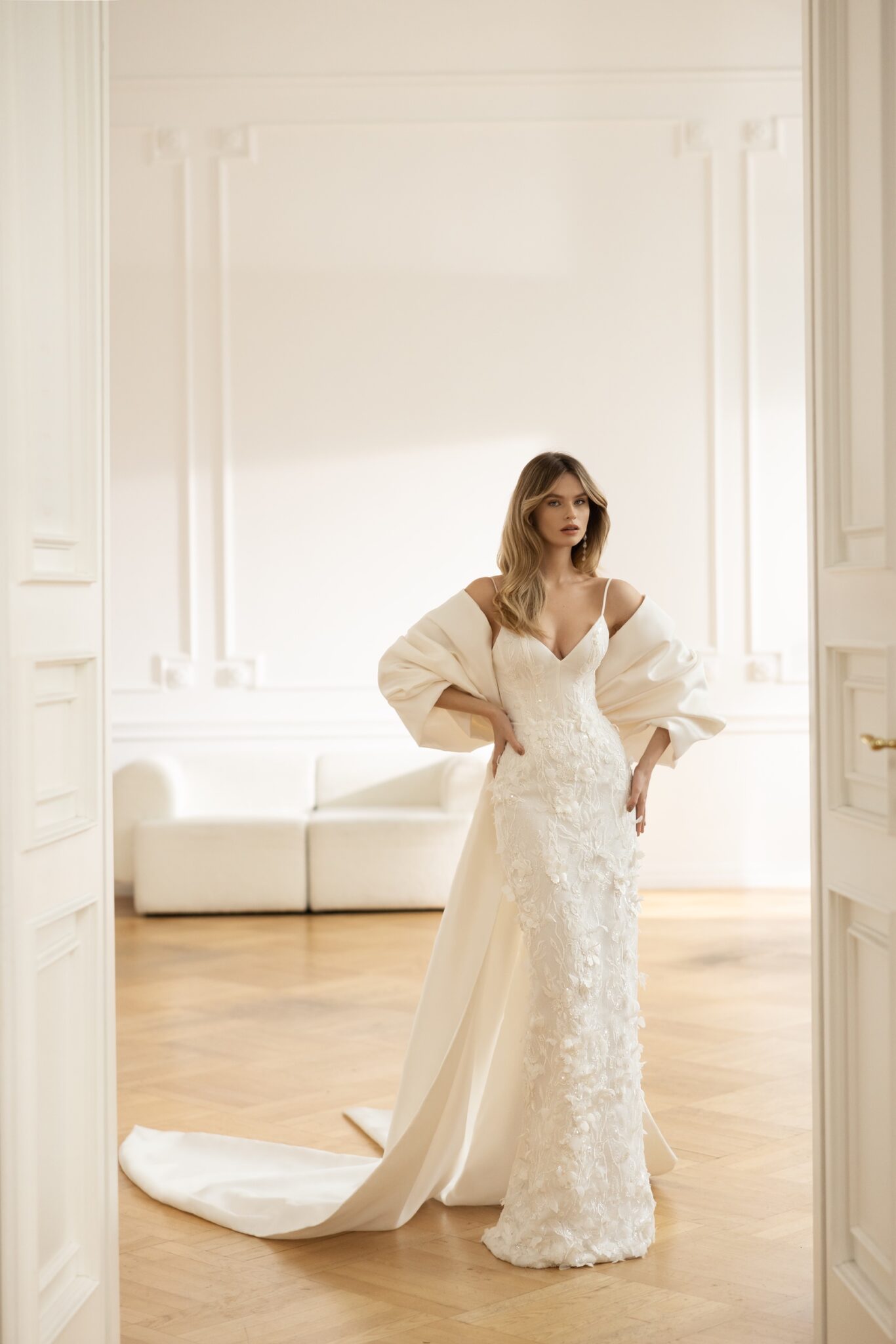 Сукня Genevieve створена для впевненої в собі та витонченої нареченої. Розкішне 3D-мереживо з квітковим візерунком, сяючими блискітками та перлами підкреслює приталений силует та створює справді унікальний образ нареченої. Ніжний V-подібний виріз на тонких бретельках робить корсет ще більш жіночним. Знімна накидка з шовку Mikado створює неймовірні об’ємні рукави, які опускаються з пліч та формують бант на спинці, що додає нотку розкоші остаточному образу