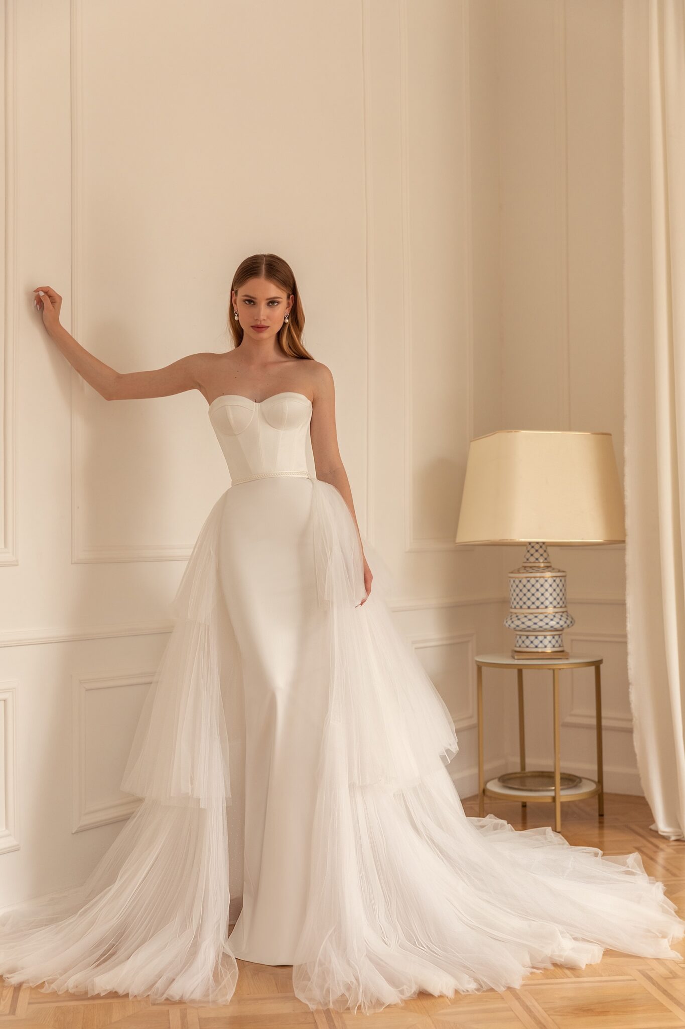 Glam – унікальний дизайн сукні нареченої. Сукня-футляр виконана з глянцевого атласу з корсетом без бретелей і гарним виріз у формі серця. Спідниця прямо спадає, підкреслюючи фігуру нареченої. Казкова об’ємна верхня спідниця складається з численних шарів фатину, зібраних у складки. Верхня спідниця знімна і фіксується на лінії талії.