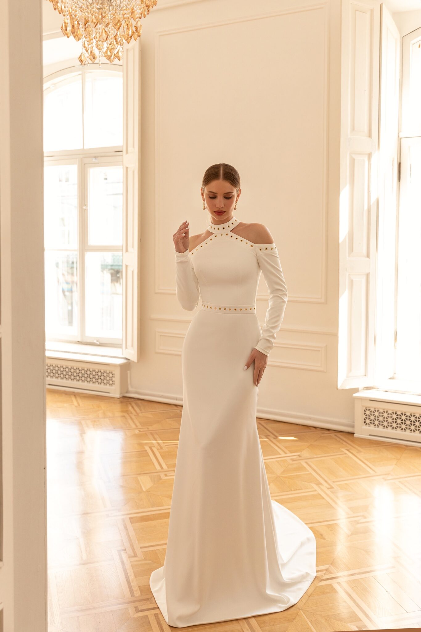 Сукня для весілля Hardy – це ідеальний варіант для створення впевненого образу нареченої. Сукня з прямим силуетом виконана з м’якої тканини. Верх сукні прикрашений металевими деталями з довгими рукавами, які опускаються на плечі. Талію підкреслює пояс з такими ж прикрасами. Спідниця падає легко і закінчується невеликим шлейфом.