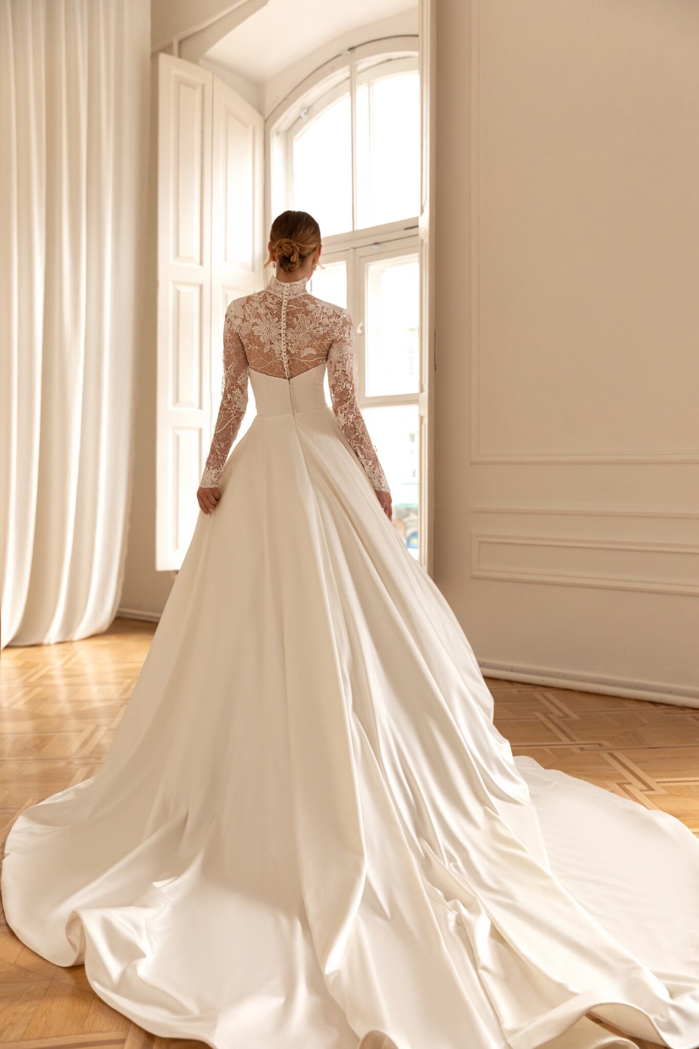 Весільна сукня А-силуету Helly виконана з атласу. Корсет основної сукні має V-подібний виріз з загостреними елементами на вирізі та без бретелей. Спідниця пишного силуету спадає шарами сяючої тканини. Мереживний ліф надягається під основну сукню. Квіткове мереживо прикрашене блискітками, має довгі приталені рукави та високий виріз коміра.