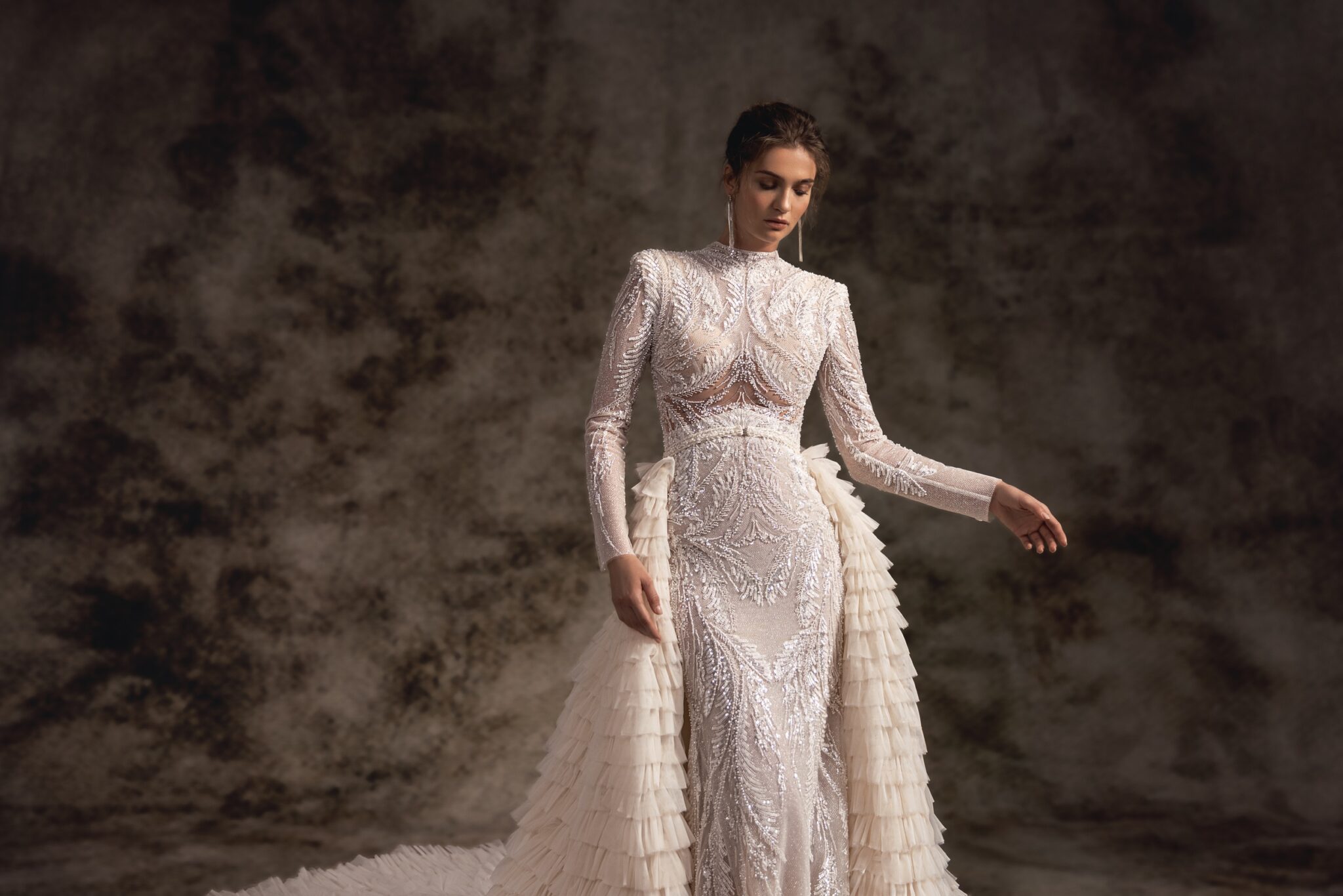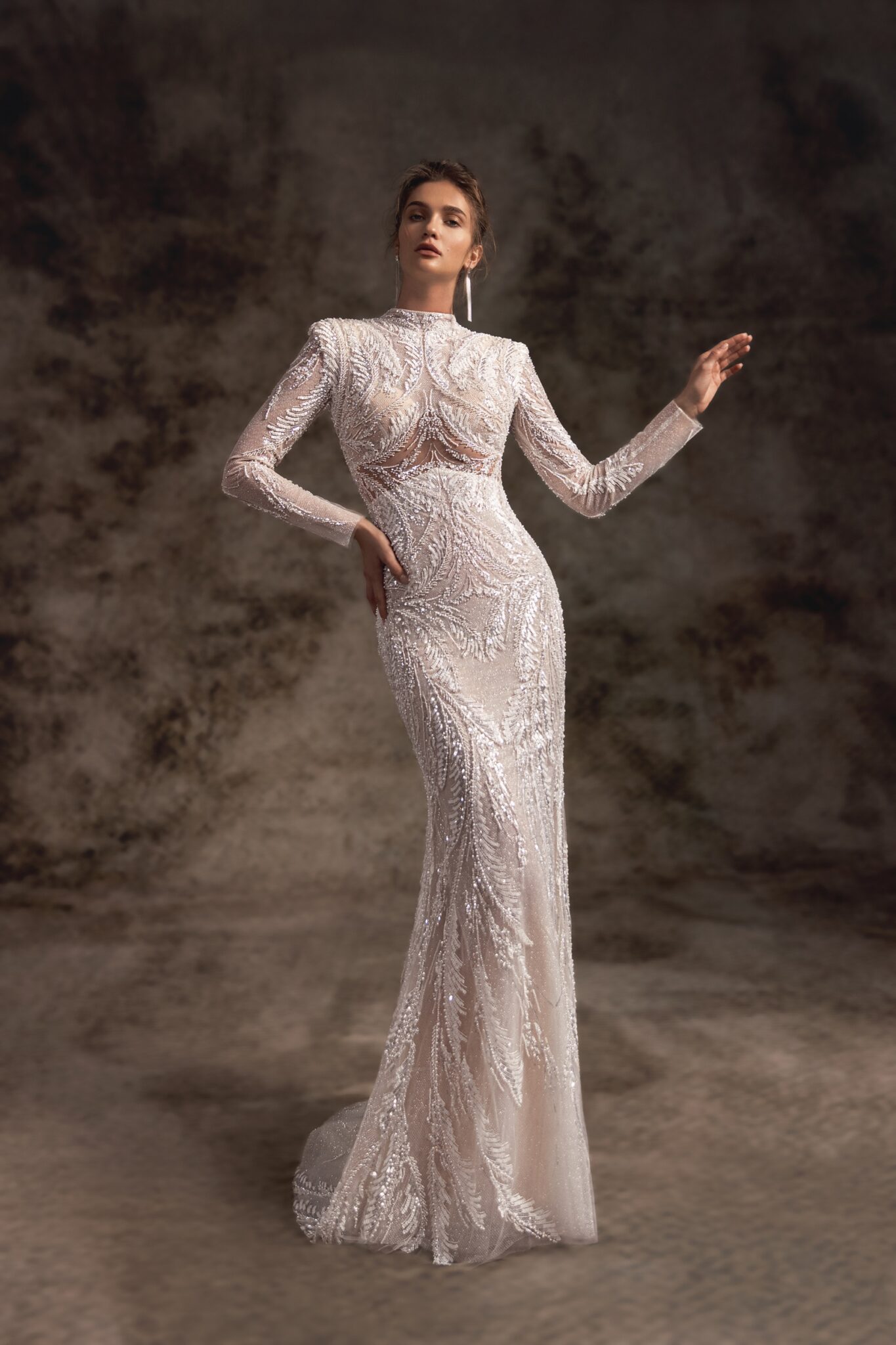 Ця жіночно структурована сукня у стилі русалки прикрашена витонченою ручною вишивкою з декоративними прозорими панелями з нюдового матеріалу по боках. Корсет прикрашений високим коміром, довгими прилеглими рукавами та набивками на плечах, що додають урочистості. Трикотажна спідниця прилягаючого фасону так само захоплююча, як і сексуальна, поступається гарно заметеному величезному шлейфу, який закінчується до капличних дверей. Для більш розкішного вигляду, до сукні можна додати зйомний додатковий подовжуючий спідницю, зроблений з каскадних шарів тюлю рюшів.