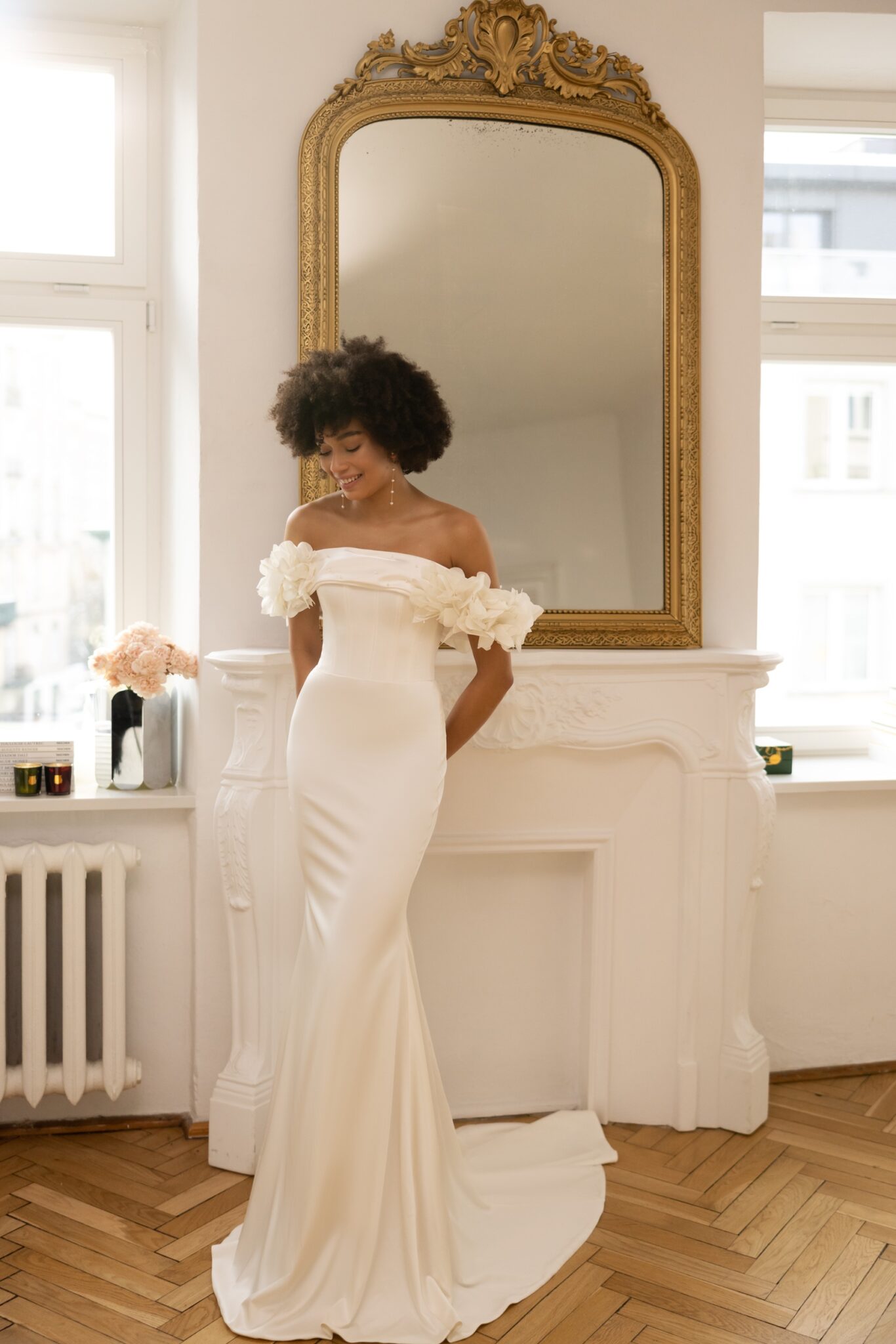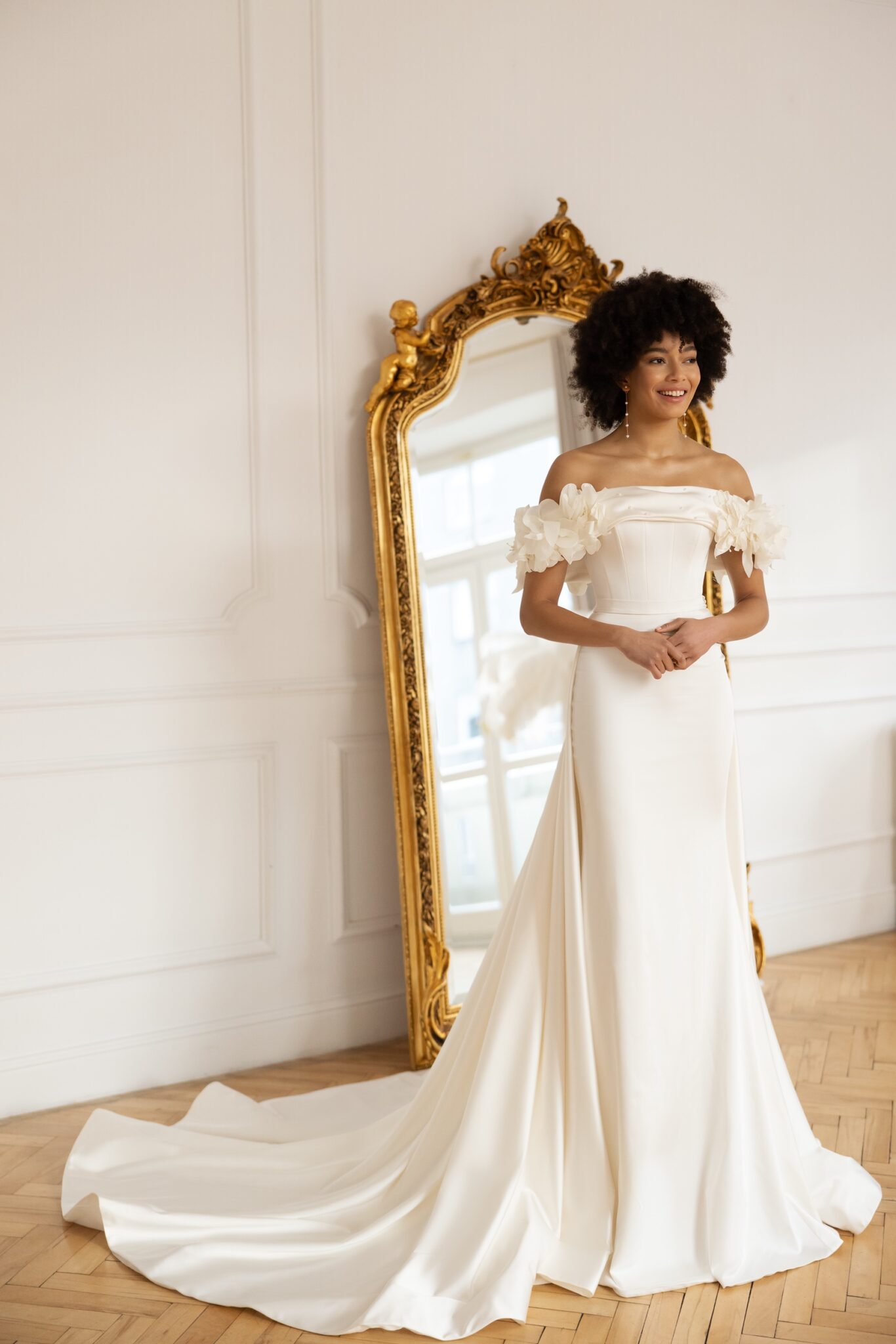 Класична та витончена сукня Jador типу “фіт і флер” спеціально створена для любителів мінімалізму. Виготовлена з чистого атласного матеріалу, вона чудово вигідно підкреслює фігуру. Ніжний прямий оборочний виріз з перлинами та багатими квітами з 3D-ефектом підкреслює лінію плечей. Стиль поєднаний із зйомною накидкою на спинці, яка додає несподівану нотку. Кафедральний шлейф красиво подовжує силует.