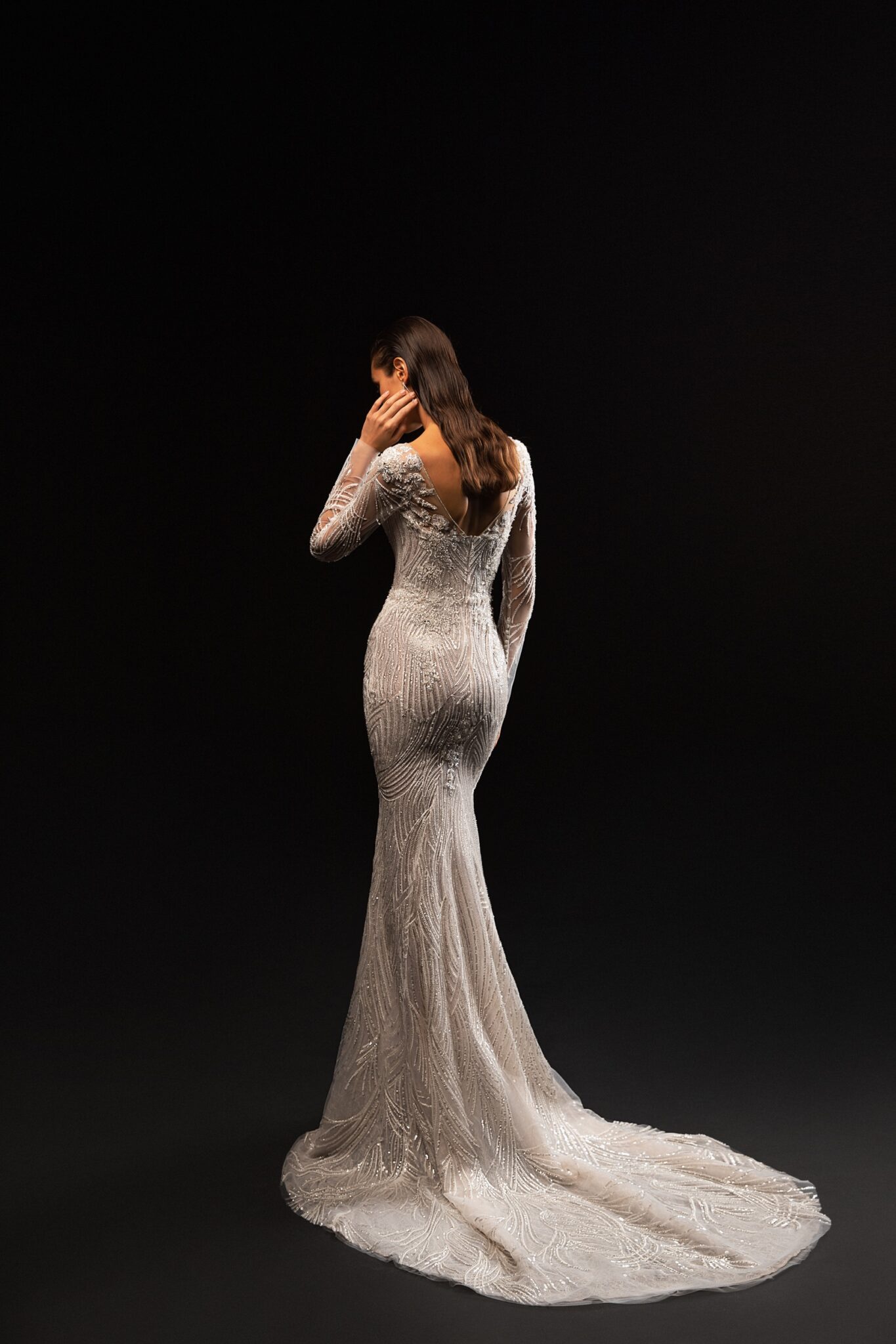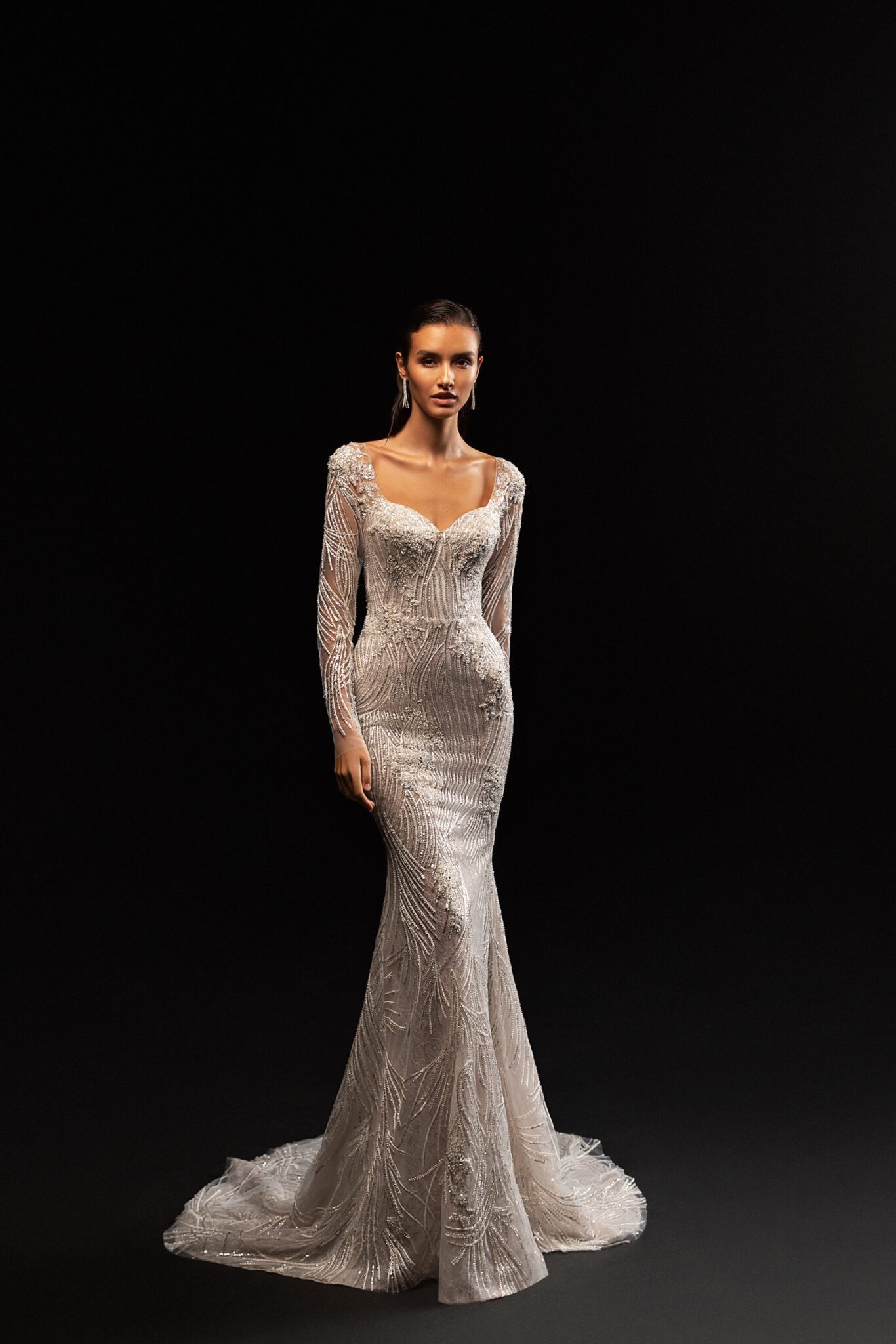 Кендалл – ніжна та жіночна весільна сукня у формі сорочки з вражаючими мереживними рукавами. Весільна сукня з вирізом у стилі “серце”. Рукава та сукня зроблені з унікального мережива і прикрашені намистинами.