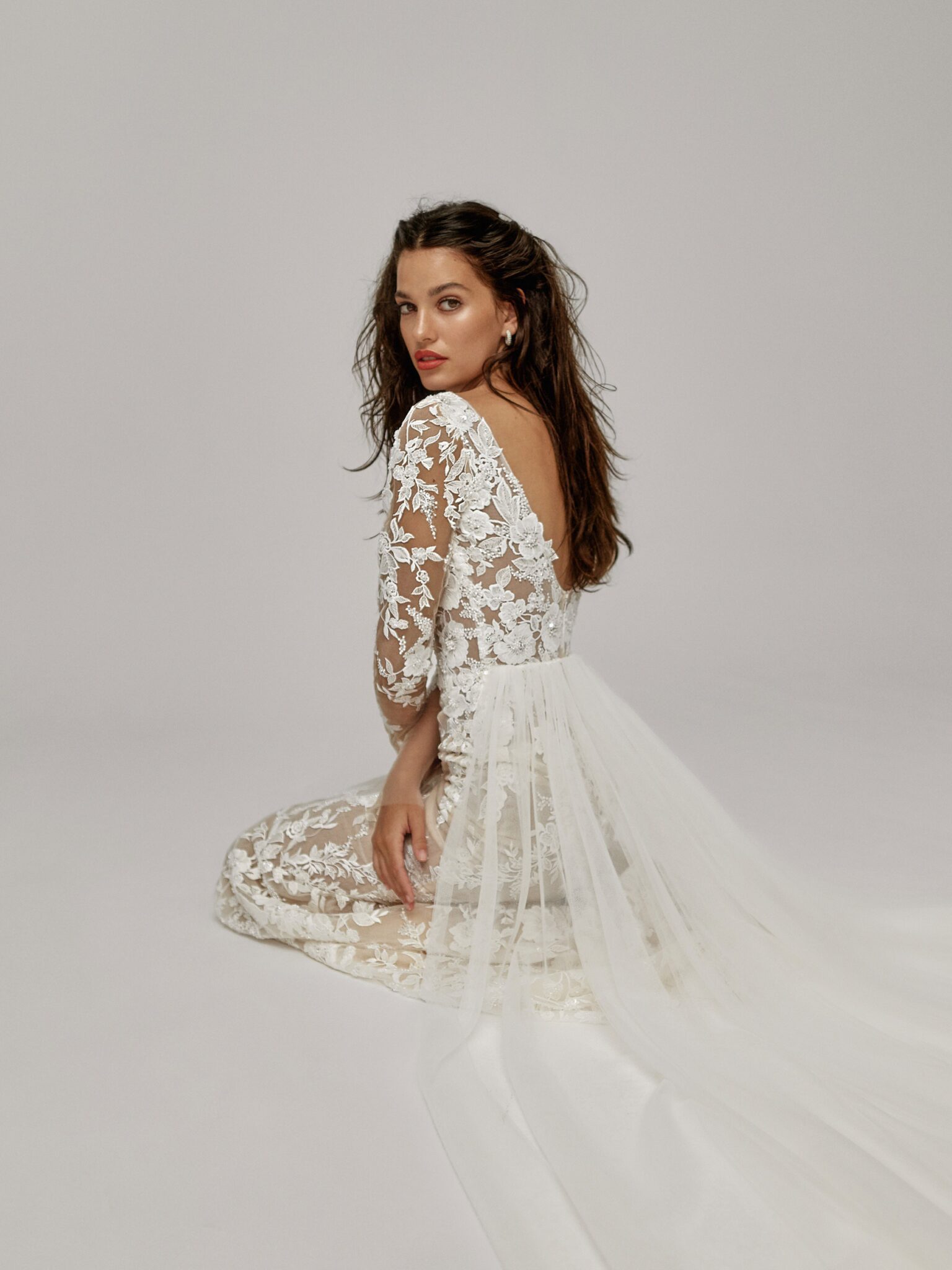 Сукня Kerrigan вирізняється ефектним силуетом «русалка» та повністю виконана з об’ємного мережива.