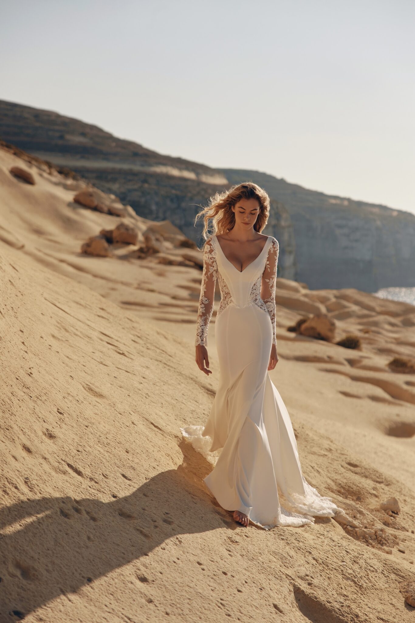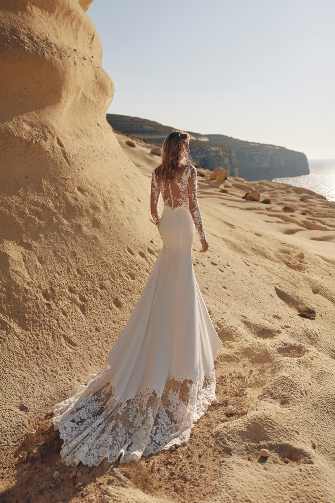 Ілюзійна сітка продовжується в рукавах, завершених складним 3D-мереживом і рядом обтягнутих ґудзиків. Спинка – прозора, повністю декорована мереживом, із виразною лінією ґудзиків, що драматично спускається крізь увесь розкішний шлейф.