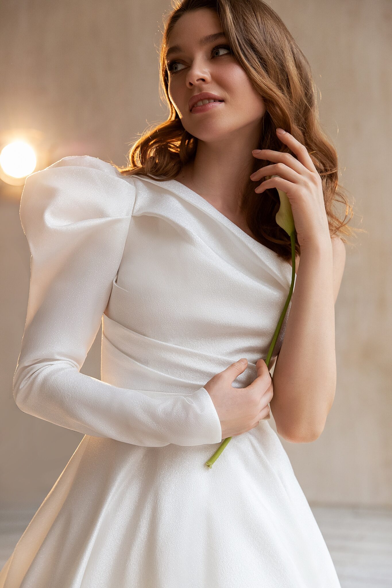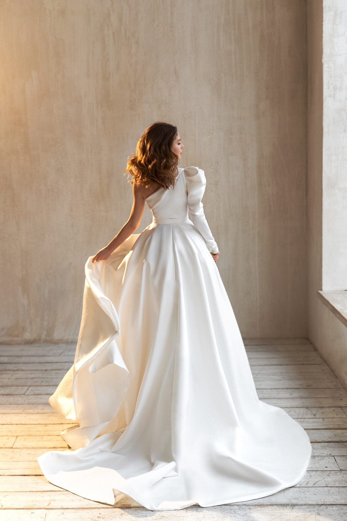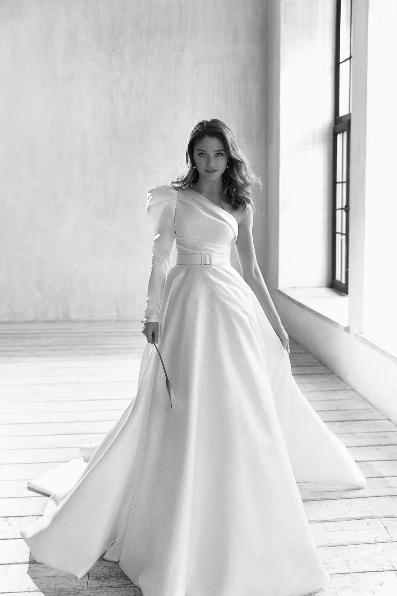 Весільна сукня з привабливим дизайном. Ця сукня у стилі “А-силует” прикрашена асиметричним вирізом і одним довгим рукавом. Цей вільний зібраний рукав створює вражаючий та шикарний весільний образ. Лаконічний пояс підкреслює талію. Фантастична спідниця переходить у довгий шлейф.