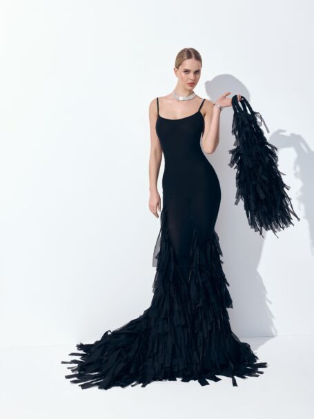 Костюм з приталеним корсетом, обʼємною міні-спідницею та прозорими довгими рукавичками. Доступний в монохромі чорного кольору або в 2-колірному варіанті – чорний-рожевий.