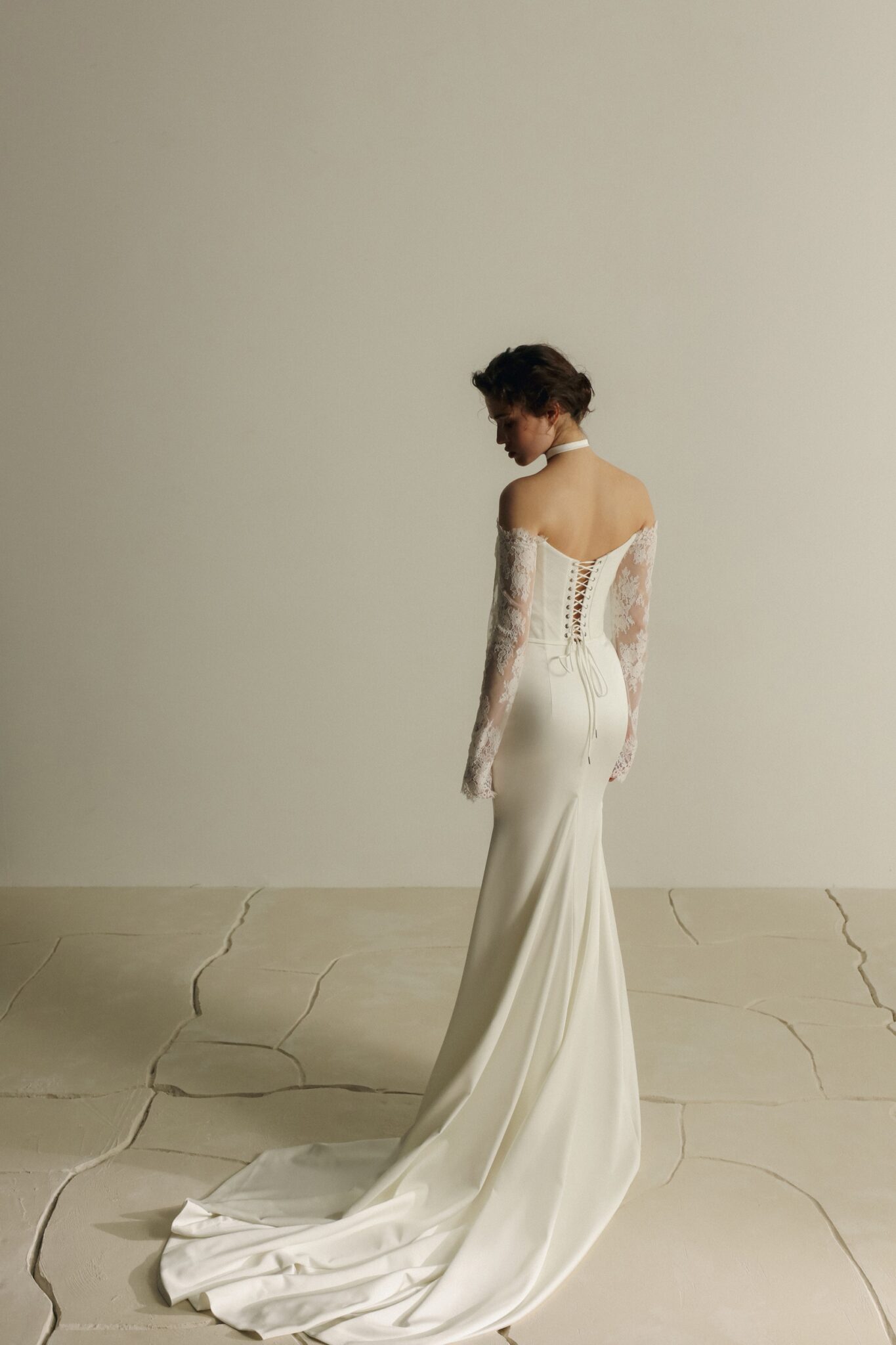 Мінімалістична сукня-русалка з відкритими плечима та довгими рукавами, виготовлена з розкішного атласу. Корсет має м’яке драпірування з фатину, що додає ніжної текстури, а корсет та рукава прикрашені вишуканим мереживом шантільї, що додає романтичного відтінку. Сукня завершується тонким, елегантним шлейфом – ідеальний варіант для наречених, які цінують стриману красу з відтінком класичного шарму.
