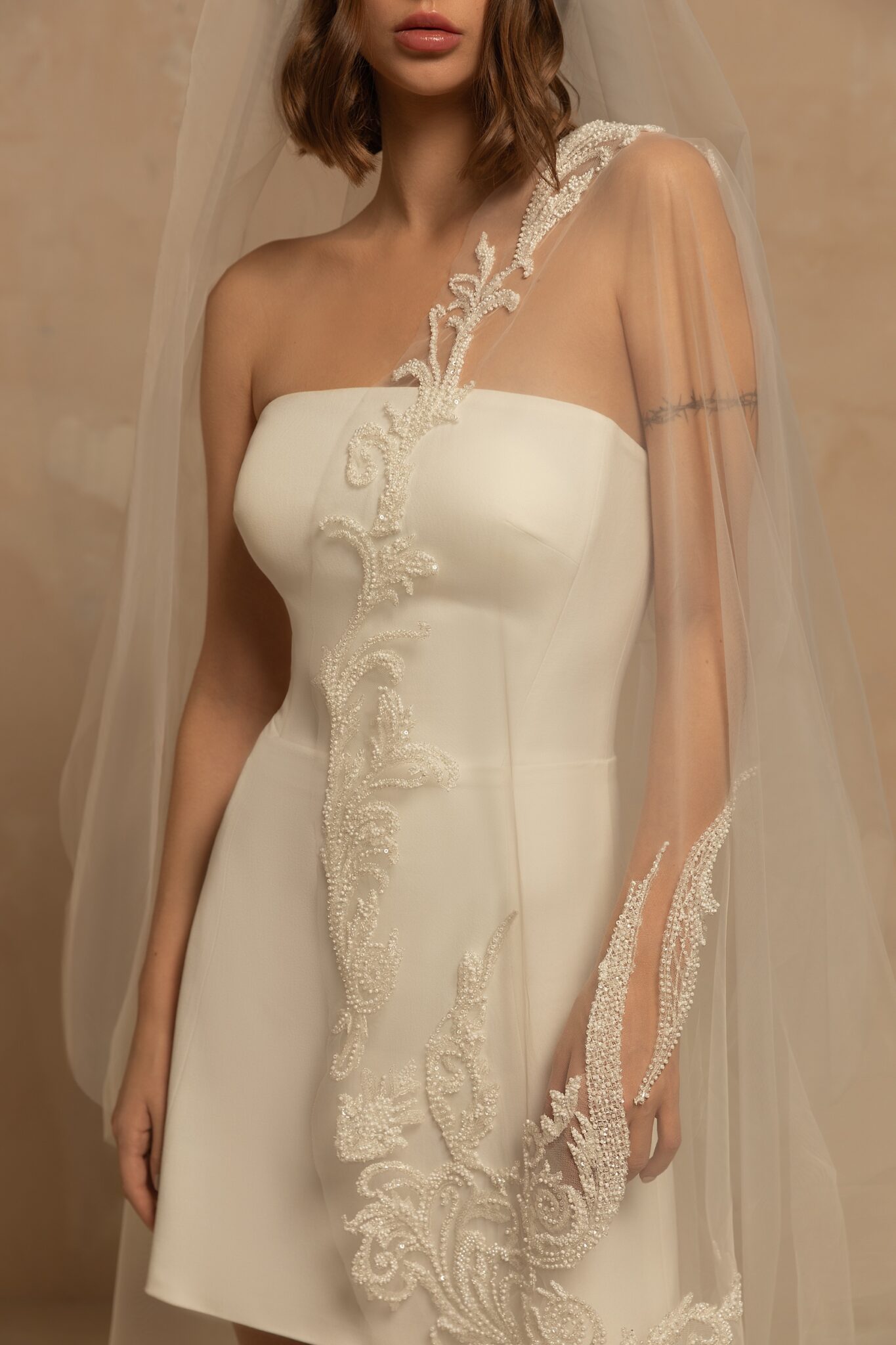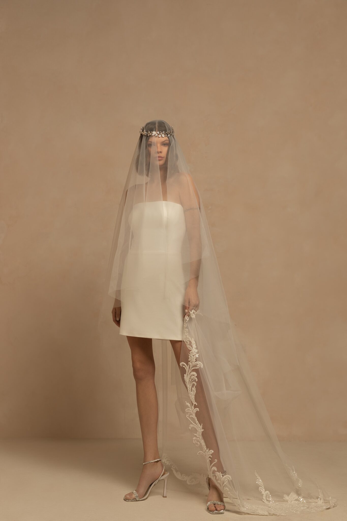 Надзвичайно розкішна одношарова весільна фата з тюлю, прикрашена вишуканим мереживом з бісером на краях. Може бути носитись як вуаль мантилья. Доступна в катедральній довжині 3 метри. Завдяки згорнутому назад виглядає як дві шари.