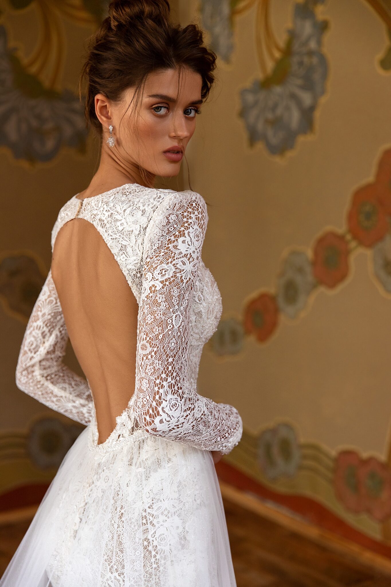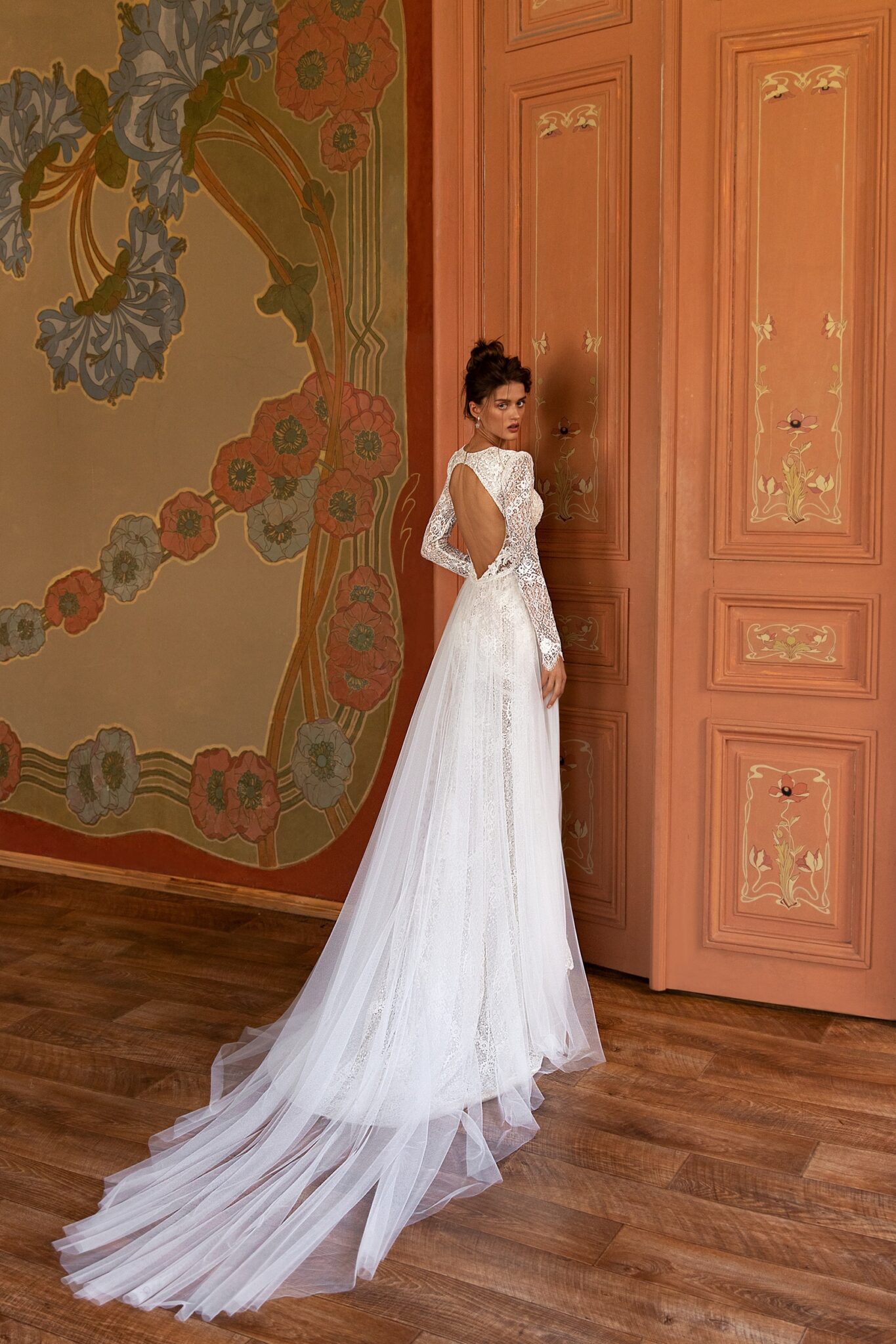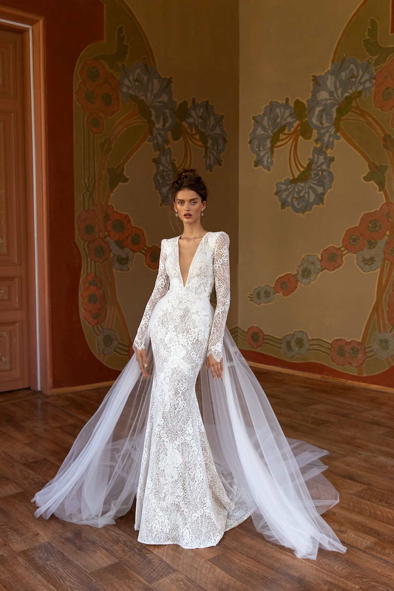 Весільна сукня “Mermaid Pillar” підкреслює фігуру нареченої. Вона зроблена з мережива та прозорої тканини. Гарний довгий шлейф робить весільну сукню величним. Сукню можна доповнити весільним плащем. Ця весільна сукня – ідеальне рішення для наречених, які хочуть змінити кілька образів під час святкування. Вона має силует у стилі “чайка”, зроблений з мережива та прикрашений квітковим візерунком, а також намистинами та бісером. Високий комір зі зворотним замком та довгі прозорі рукава роблять цю сукню загадковою. Вражаючою деталлю є круглий виріз на спинці сукні. Додаткова вільна спідниця з застібками зроблена з блискучої тканини. Ця додаткова спідниця закріплена на талії та прикрашена поясом. Також присутній величезний шлейф.