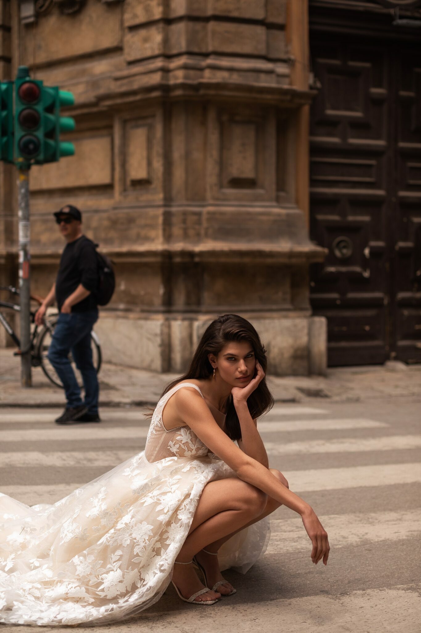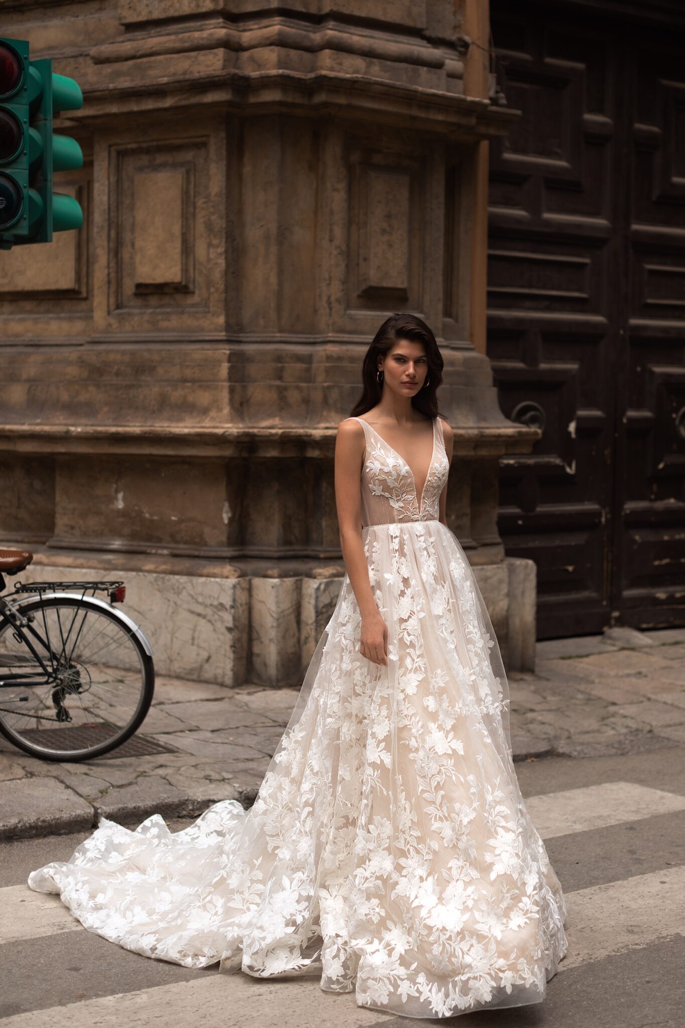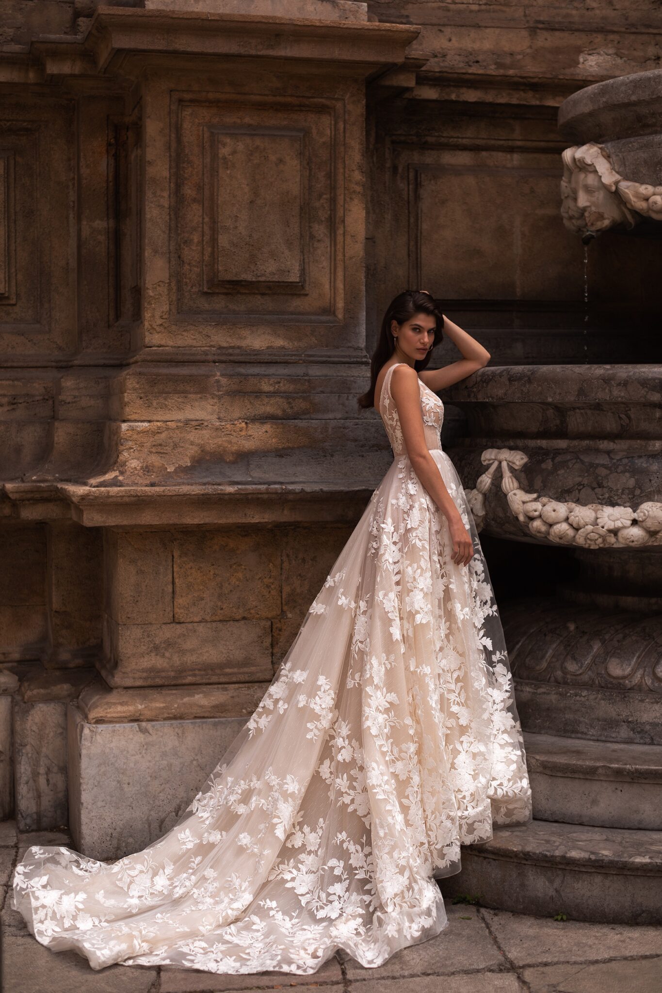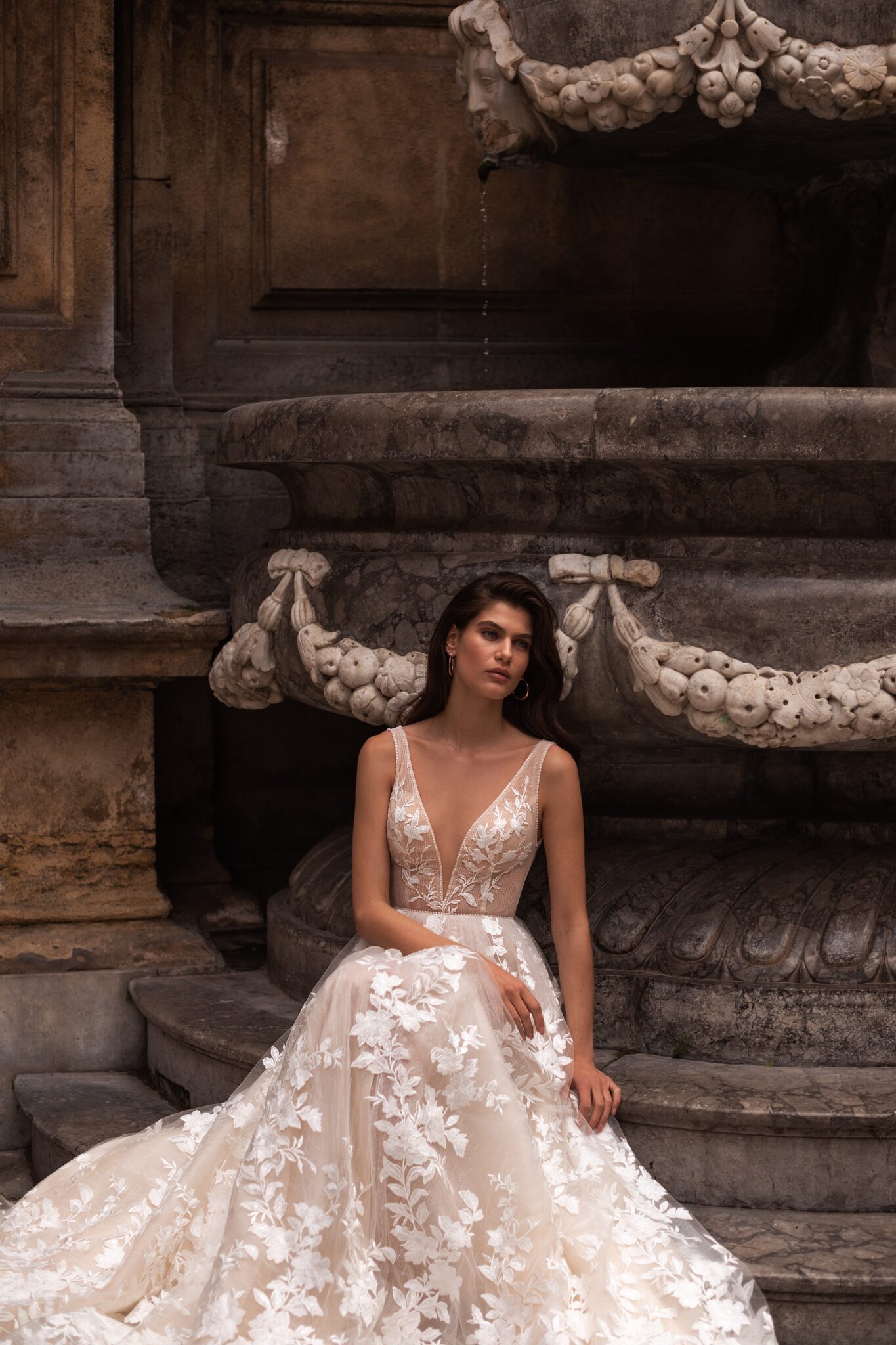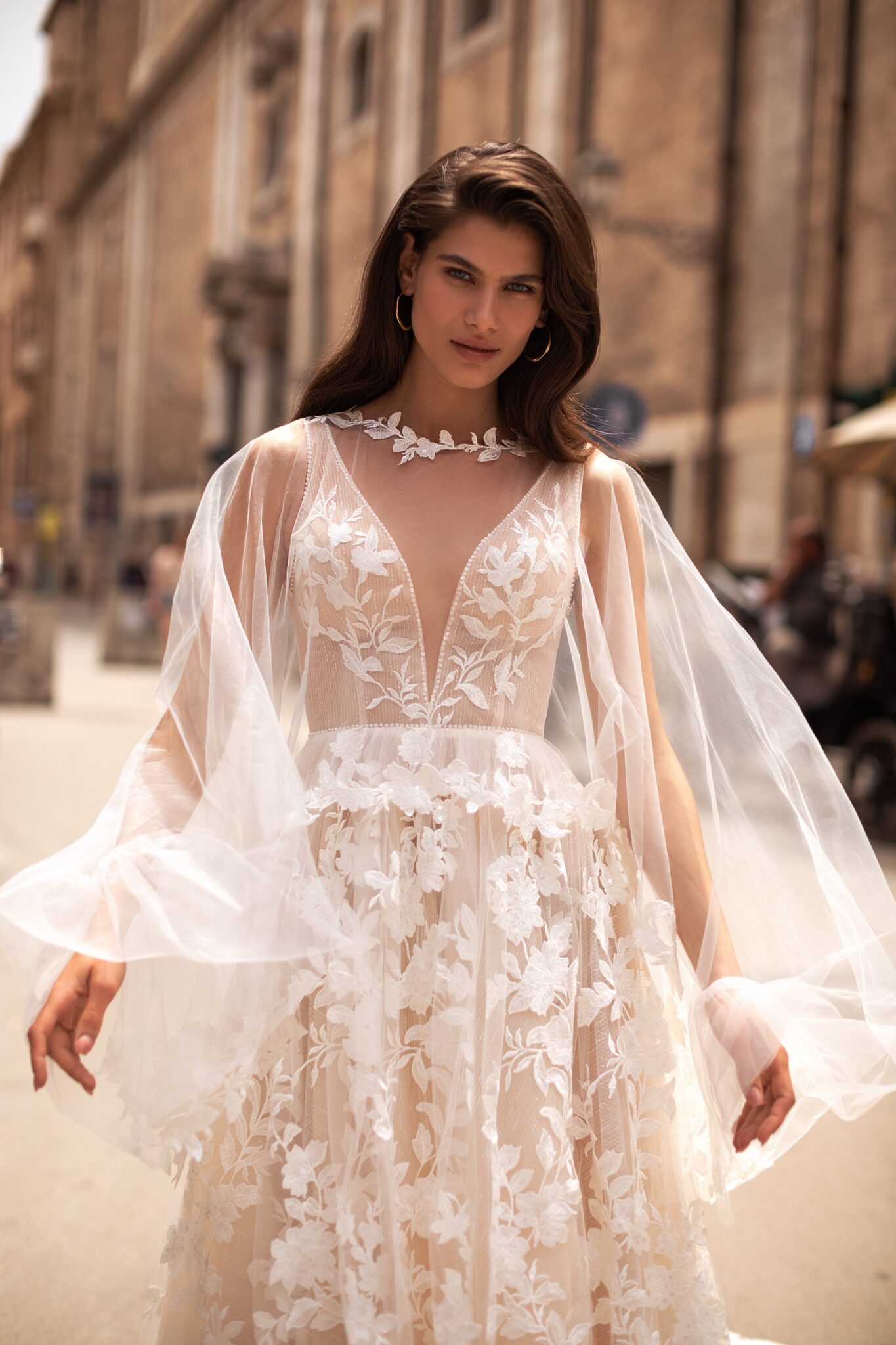 Primrose – романтична весільна сукня у стилі ” A-line” виготовлена з чарівного ivory Тюлю з великими квітами з мережива, має напівпрозорий корсет з глибоким V-подібним вирізом і поступово стоншуються дрібними бретелями. З широкими збірками та ліхтариками рукавами, сукня може бути доповнена вишуканим прозорим болеро. Корсет зустрічається з об’ємною спідницею з Тюлю з тими ж квітковими аплікаціями, яка завершується з виразним шлейфом у вигляді стрічки.