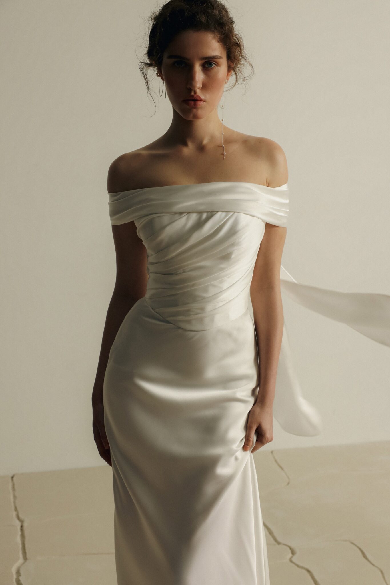 Сукня Reef – це мінімалістичний силует русалки, виготовлений з легкого атласу м’якого відтінку слонової кістки.