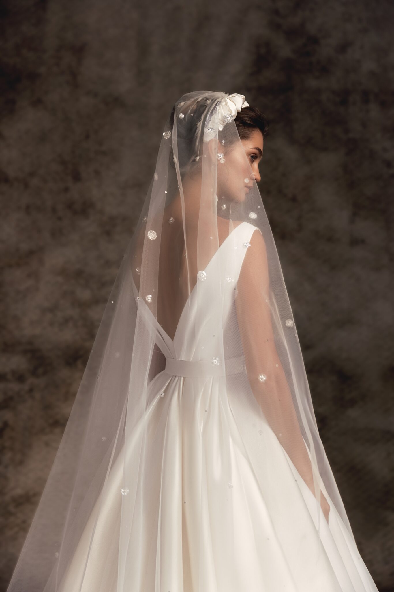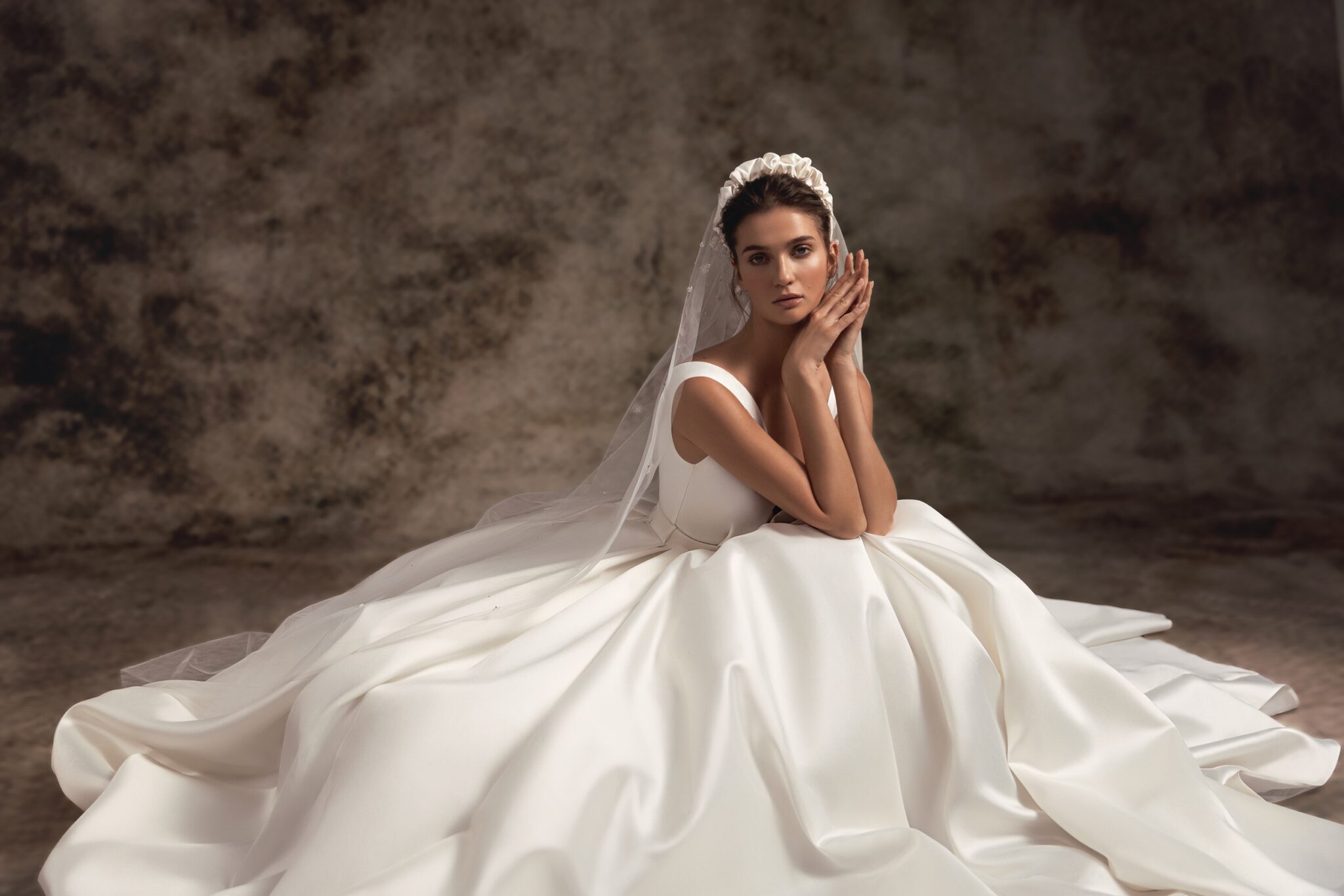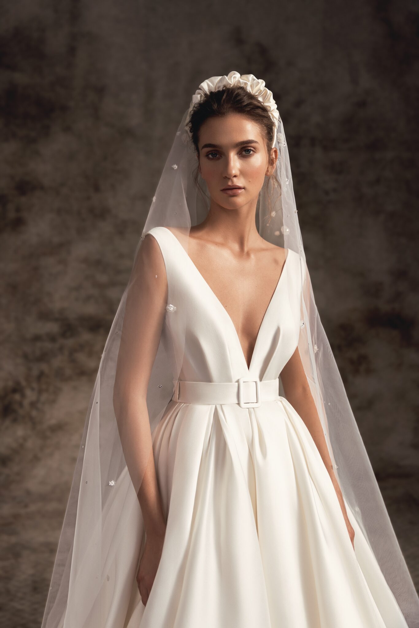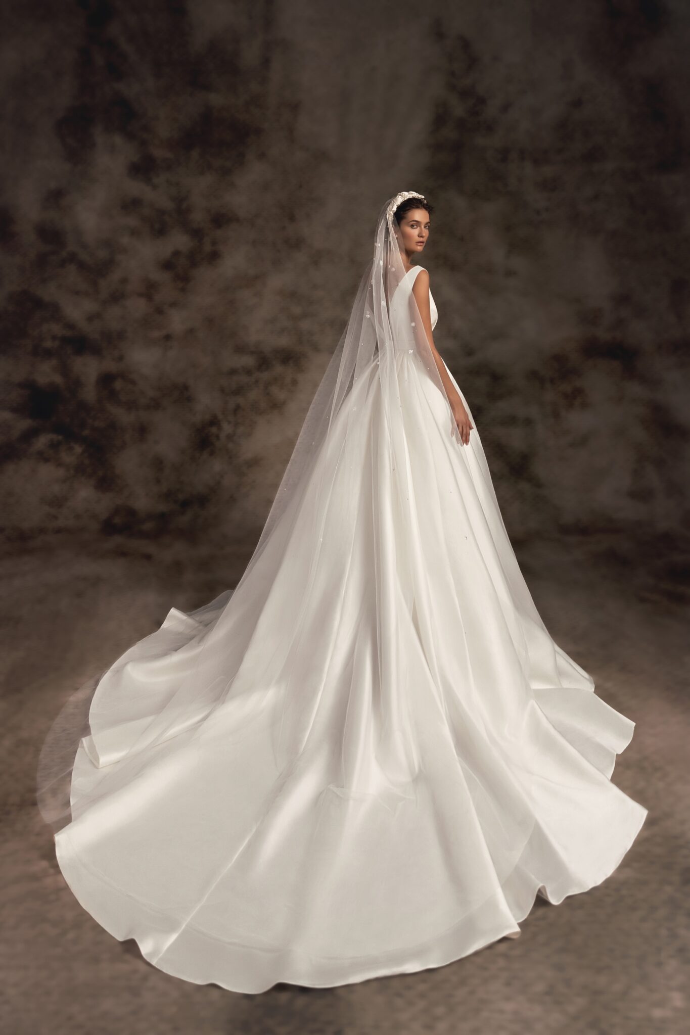 Сукня “Rosemary” – це спокуслива і романтична атласна бальна сукня з глибоким V-подібним вирізом на корсеті і акуратними атласними бретелями. Лінія талії прикрашена складками і поясом з пряжкою, що підкреслює фігуру нареченої. Об’ємна спідниця з гладкого атласу м’яко спадає в довгий розкішний шлейф.