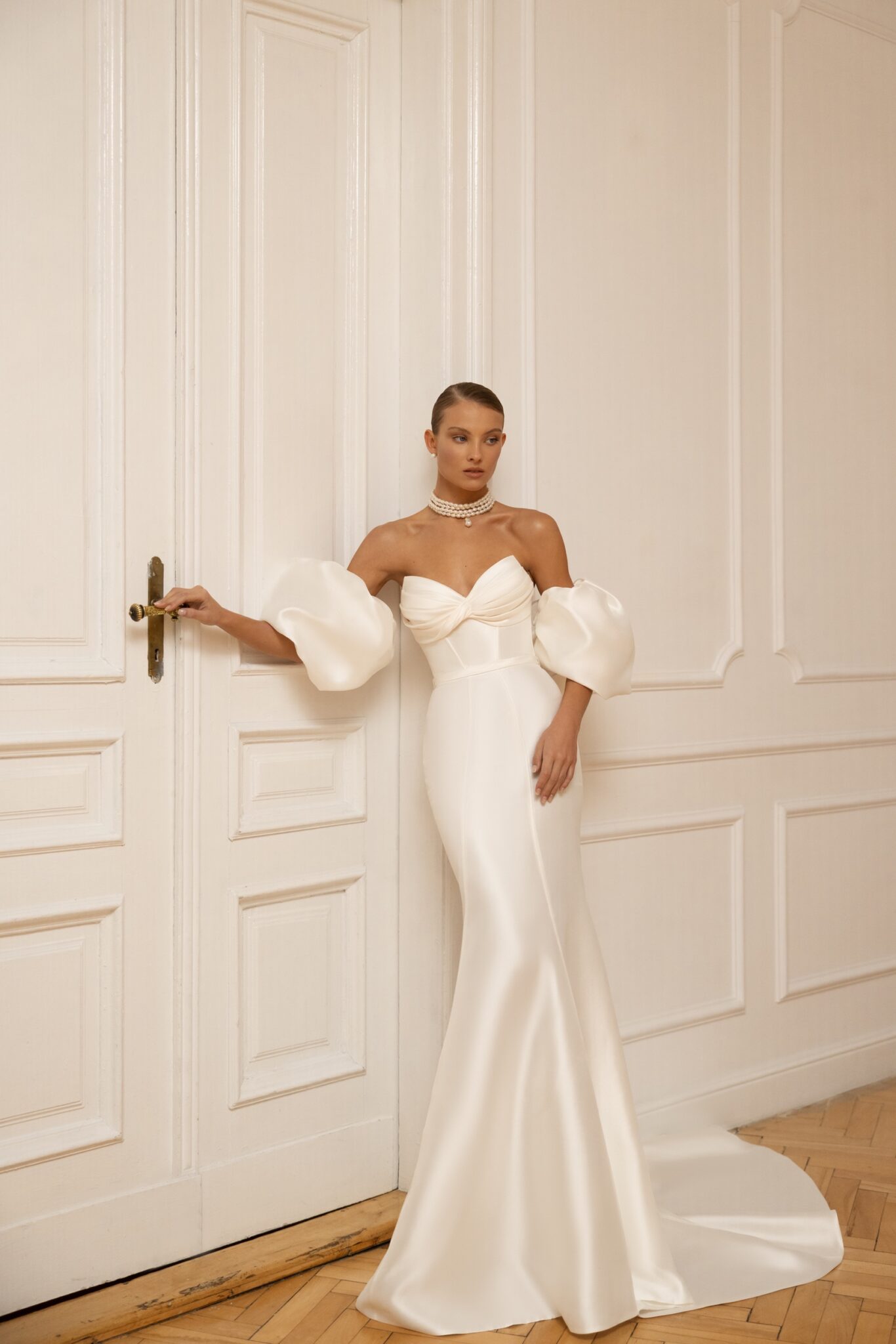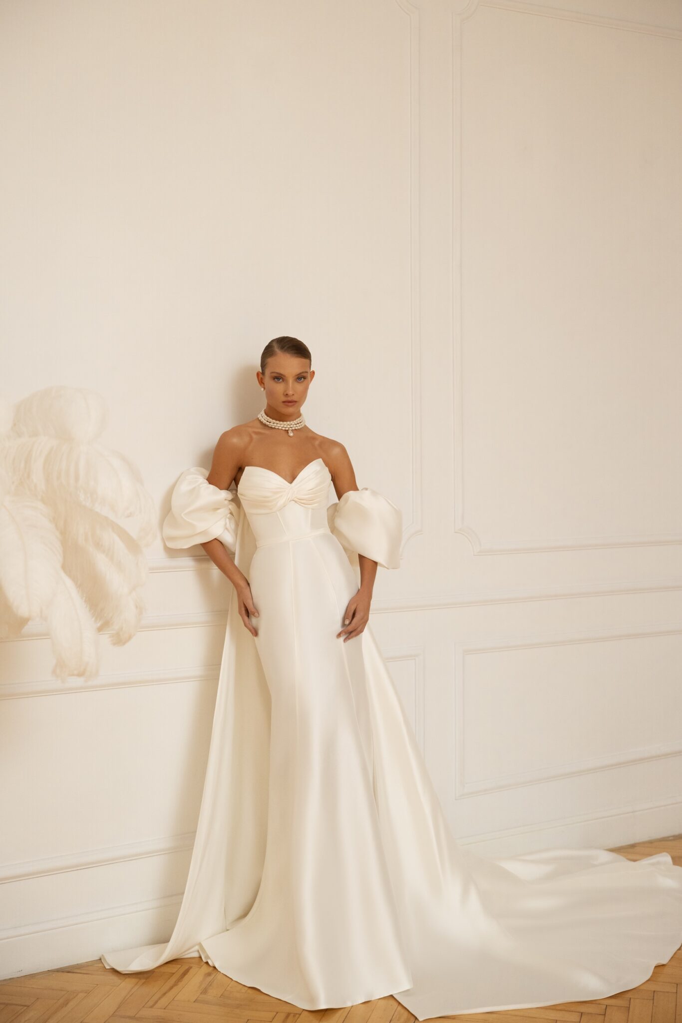 Весільна сукня Sahara вражає своєю витонченою простотою. Викроєна з нашого підписного Mikado, вона підкреслює жіночі форми, маючи сильно структурований відкритий грудний виріз у формі літери “V”, прикрашений драпіруванням і гладким класичним мереживним корсетом. Творчі панельні лінії пролягають через стегна, створюючи розкішний капелюх з традиційним шлейфом, і додатковий накидка на спині надає ще більш драматичний вигляд. Сукня прикрашена пухкавими об’ємними рукавами, які можна відстібнути.