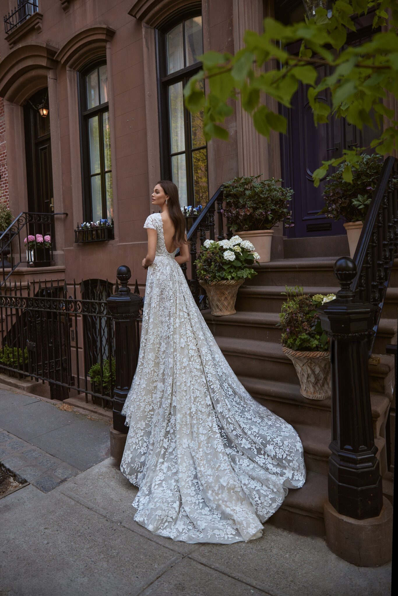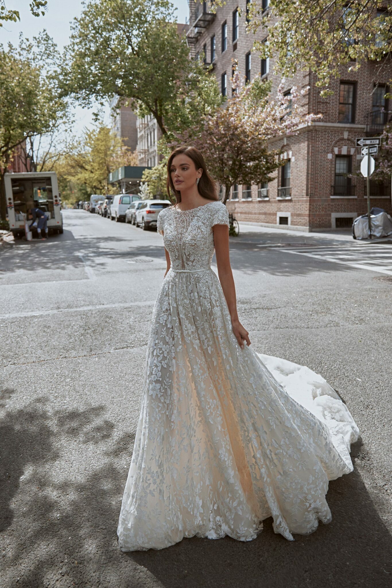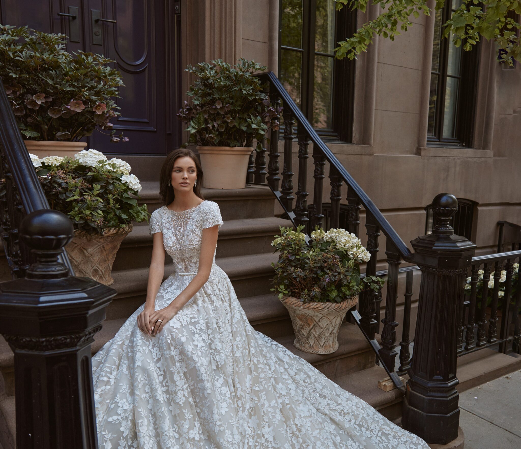 Сукня А-силуету Sasha підкреслює фігуру нареченої та її природну красу. Весільна сукня по всій довжині прикрашена мереживом з квітковим візерунком з намистин та кристалів. Глибокий V-подібний виріз, покритий прозорим мереживом, переходить у високу стійку на шиї. Короткі рукави і спідниця вільного крою з квітковим візерунком та фантастичним шлейфом довершують образ та додають жіночності.