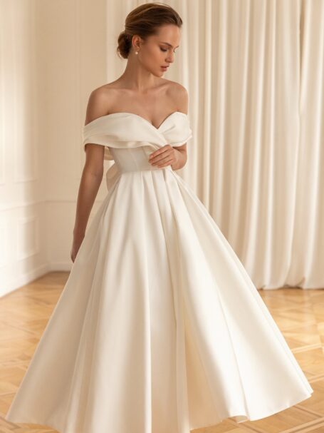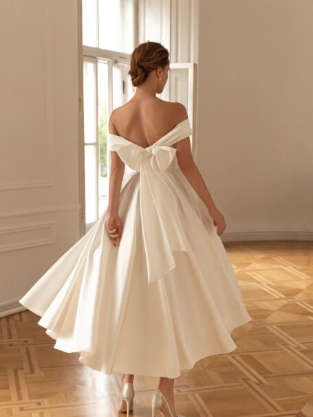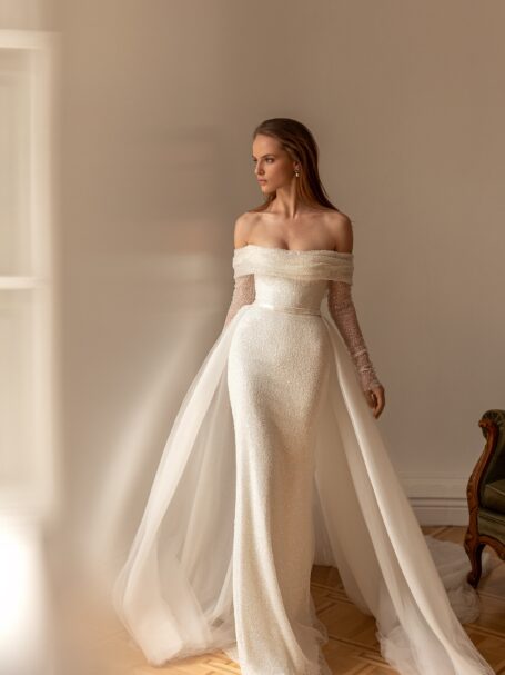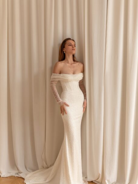 Sigrid – весільна сукня, яка дозволить створити справжній королівський образ. Верх сукні повністю прикрашений вишивкою з мережива, бісером і блискітками. Верх має V-подібний виріз на плечі ззаду та ззаду. Півпрозорі довгі рукава прикрашені тим же мереживом, що додає розкіші. Красива спідниця в формі літери “A”, виготовлена з блискучого атласу, переходить у довгий шлейф.