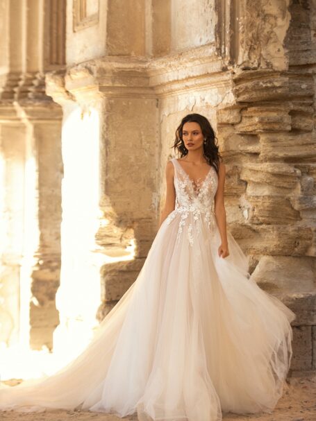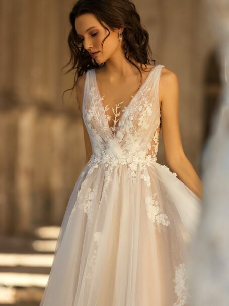 Сукня Simona з A-подібним силуетом і V-подібним вирізом повністю зроблена з блискучих тканин. Гарні банти на рукавах роблять сукню ще більш ніжною.