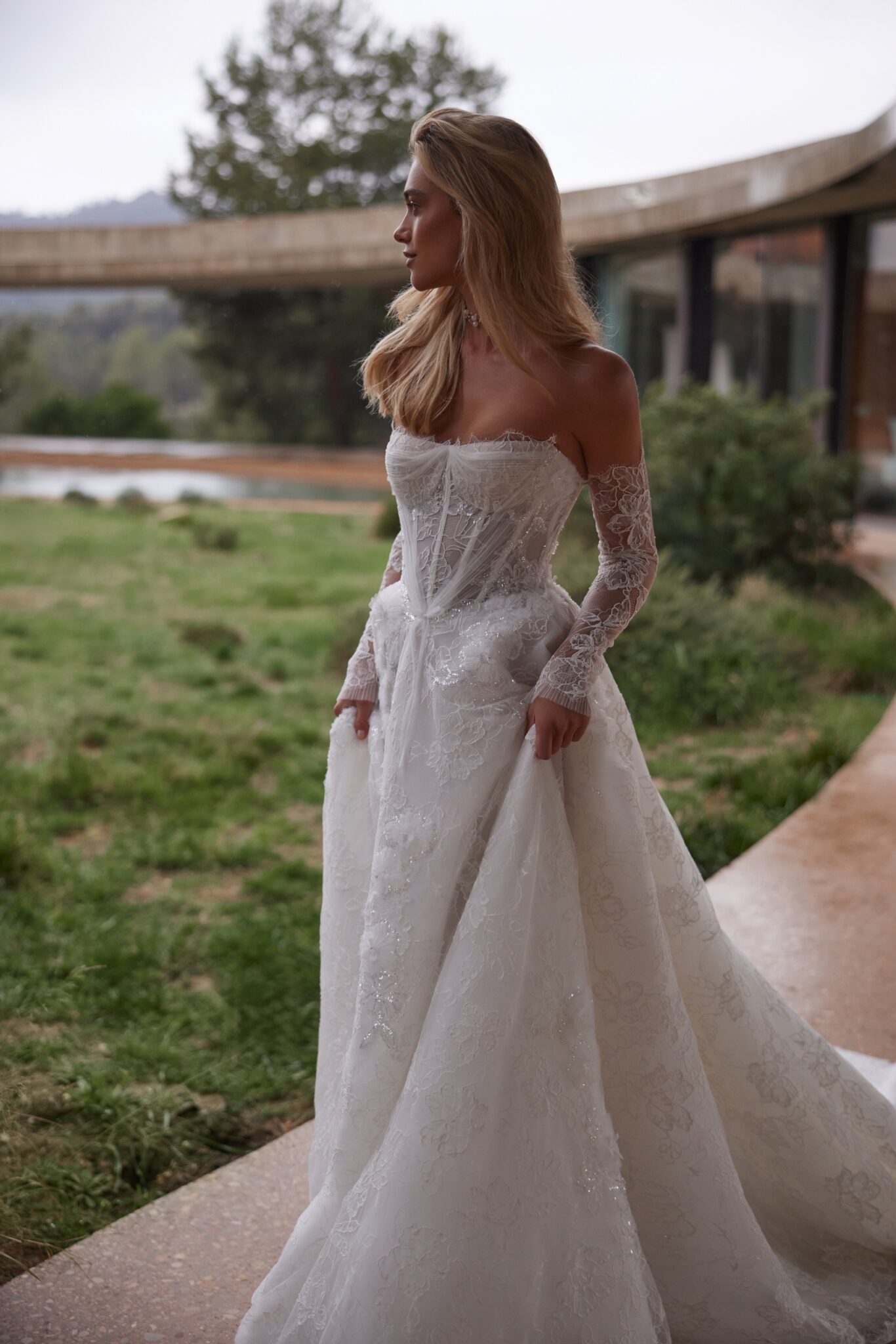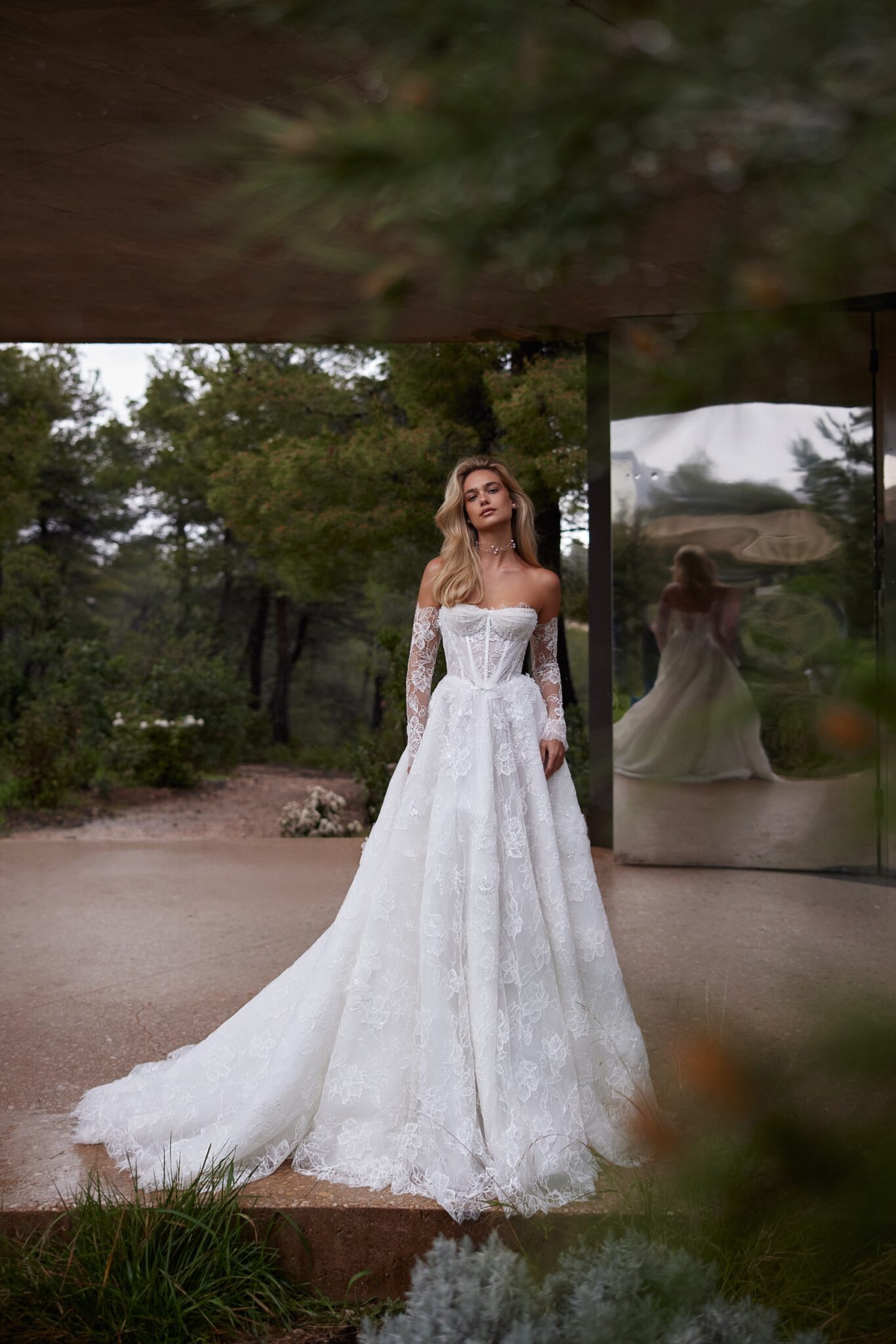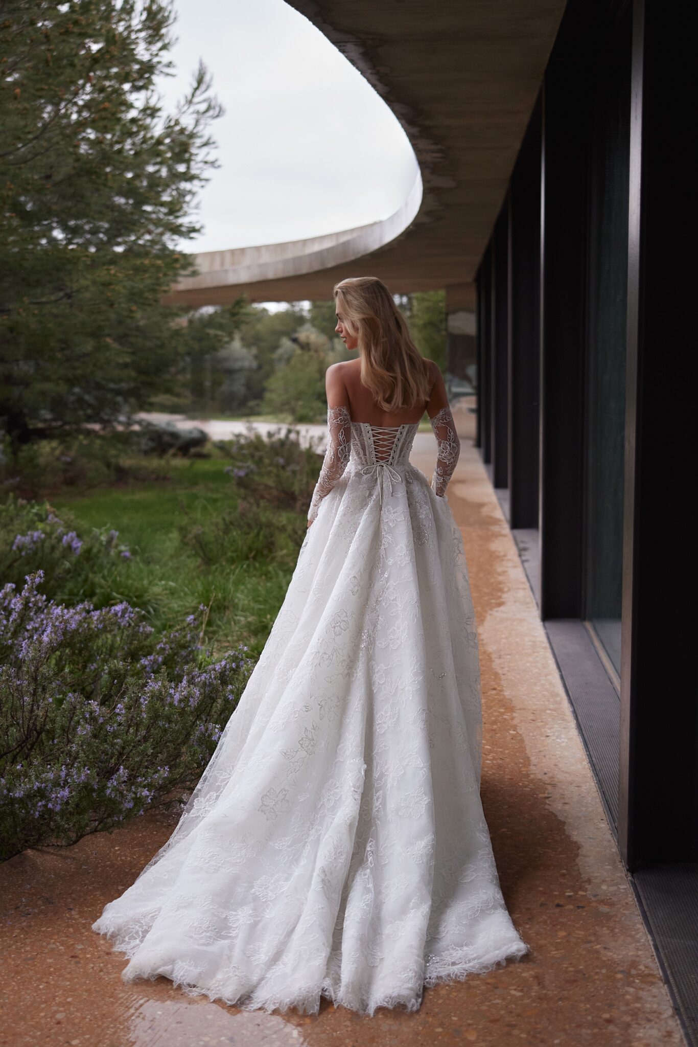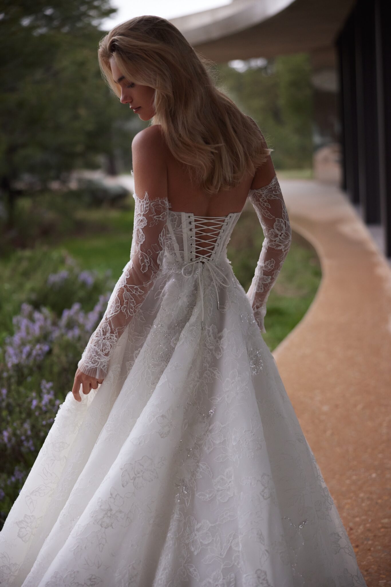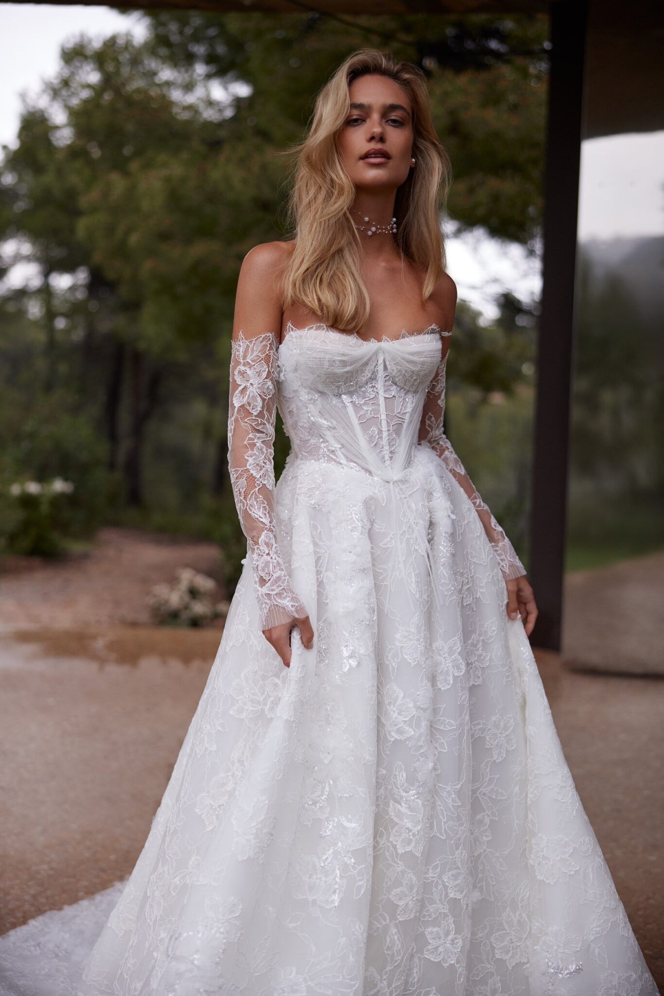 Пориньте в атмосферу чарівності та романтики у нашій весільній сукні А-силуету. Вишукано виготовлена з мережива, прикрашеного мерехтливими квітковими деталями, вона зачаровує глибоким декольте та корсетом на шнурівці, що підкреслює твої вигини.