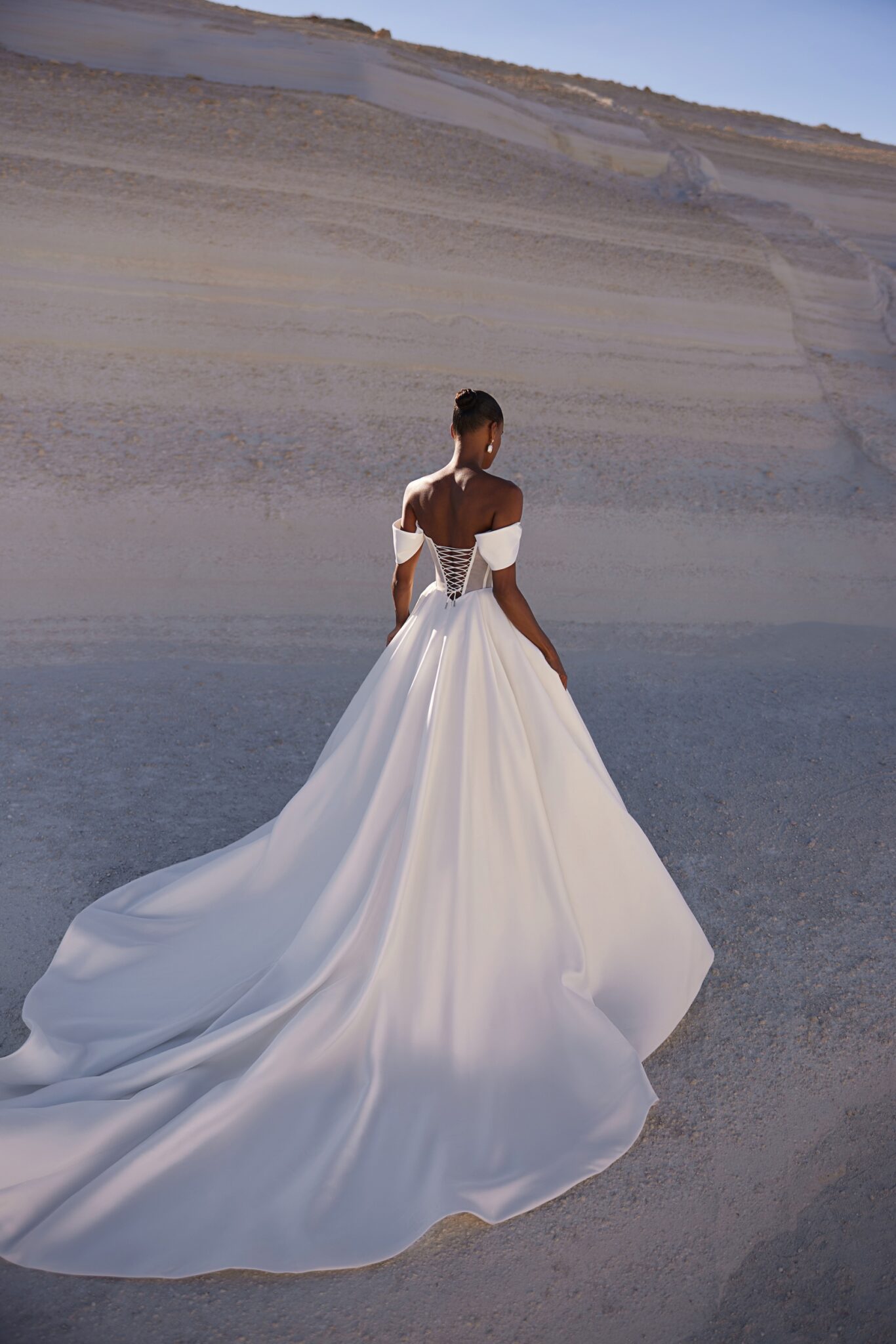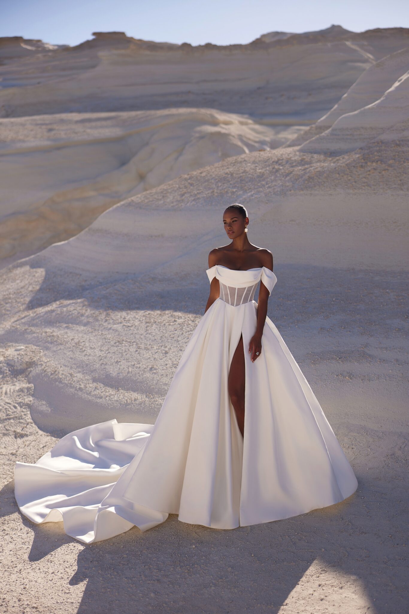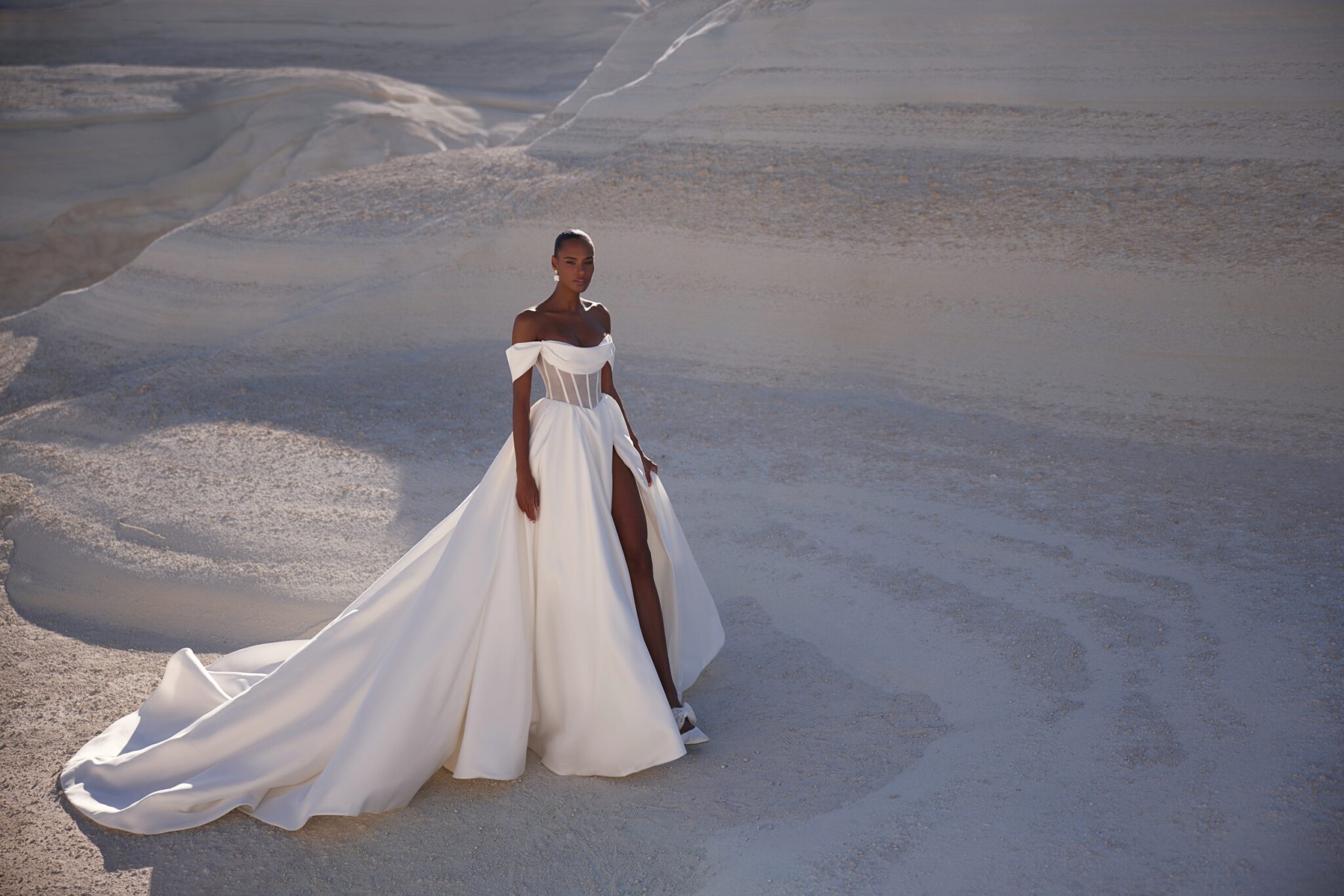 Вишукана сукня з щільним корсетом з прозорими панелями та м’яко задрапірованими декольте і рукавами. Спідниця залишається гладкою та класичною, а розріз на всю довжину з лівого боку додає вбранню нотку спокусливості.