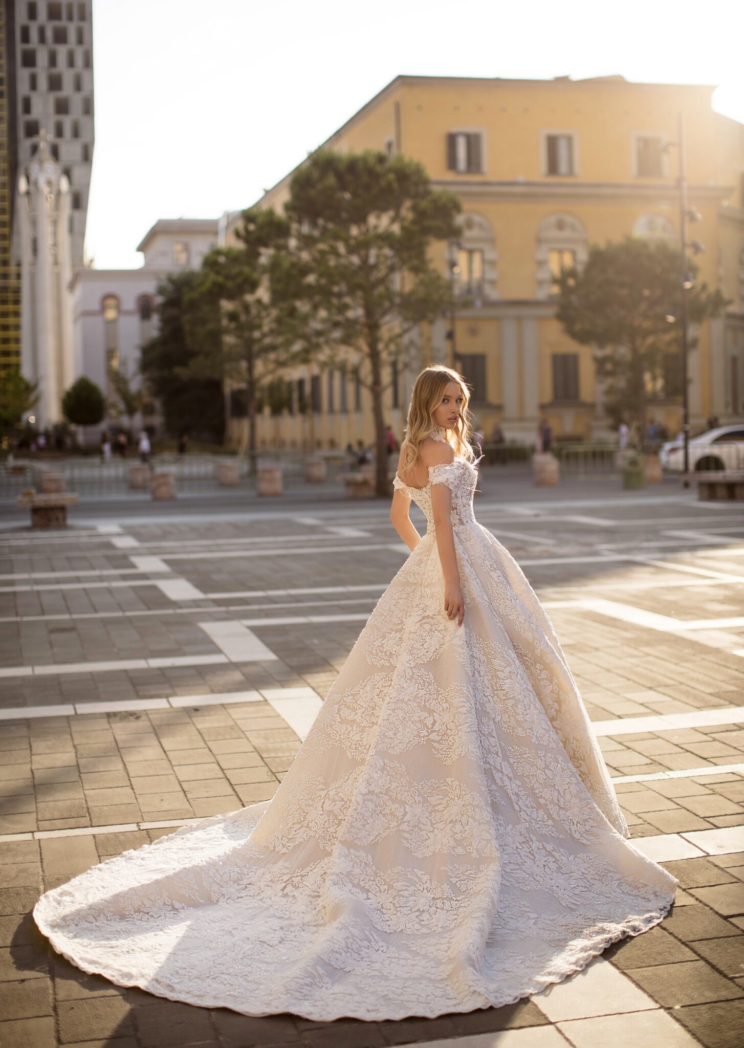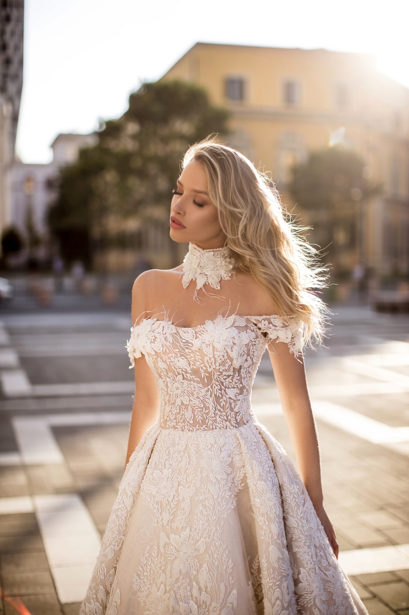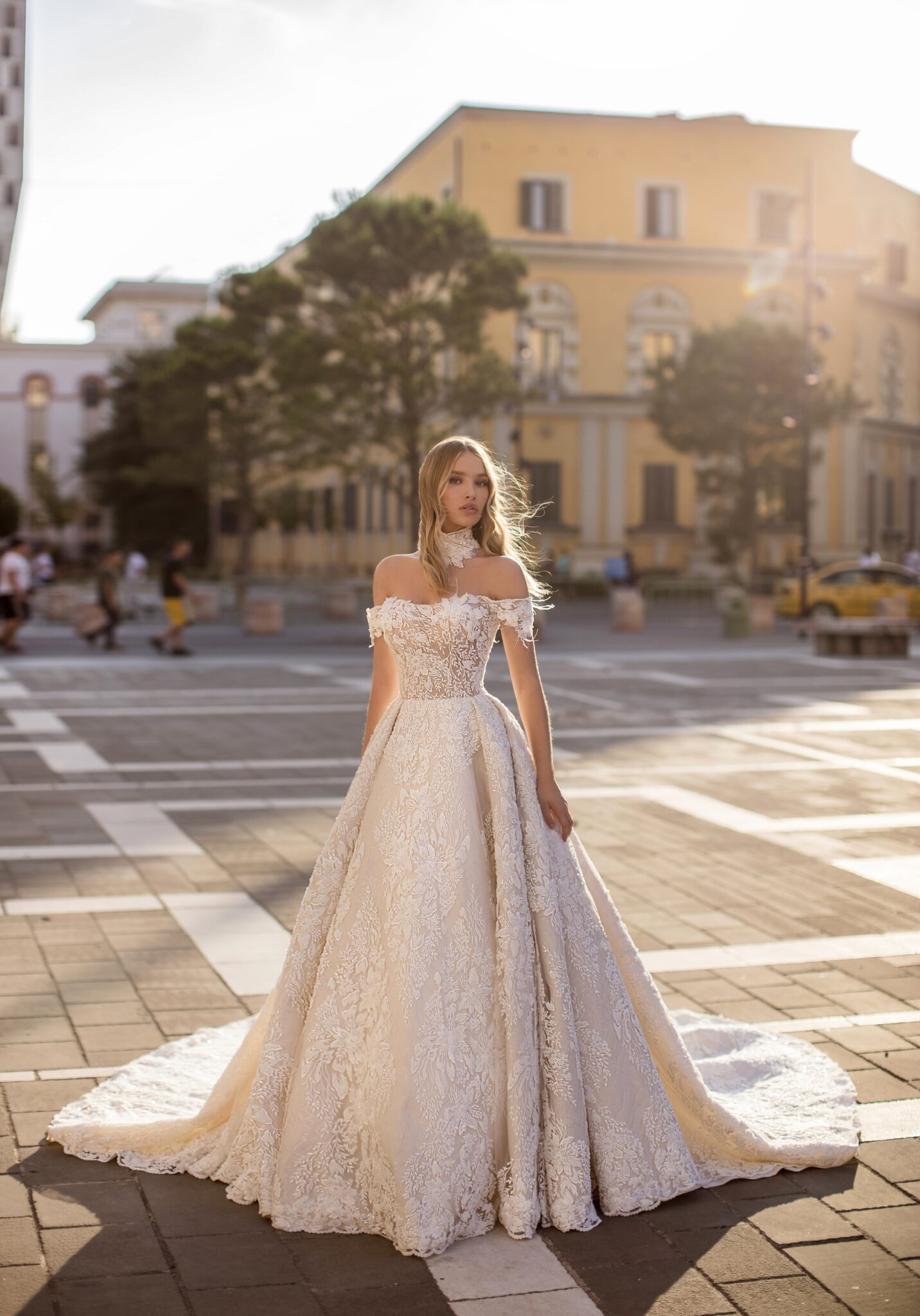 Unicue – це весільна сукня у стилі “А-силует”, яка поєднує бежеву основу та білі мереживні квіти. Корсет прикрашений різними мереживними візерунками, які переходять в великі квіткові мотиви на спідниці. Короткі рукава та довгий шлейф додають жіночності цьому весільному образу.