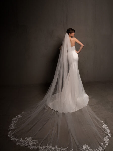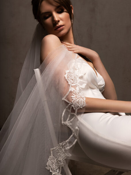 Чарівна і лаконічна фата для нареченої, виготовлена з гладкого тюлю та прикрашена великими аплікаціями у вигляді квіткових мотивів. Доступна у катедральній довжині.