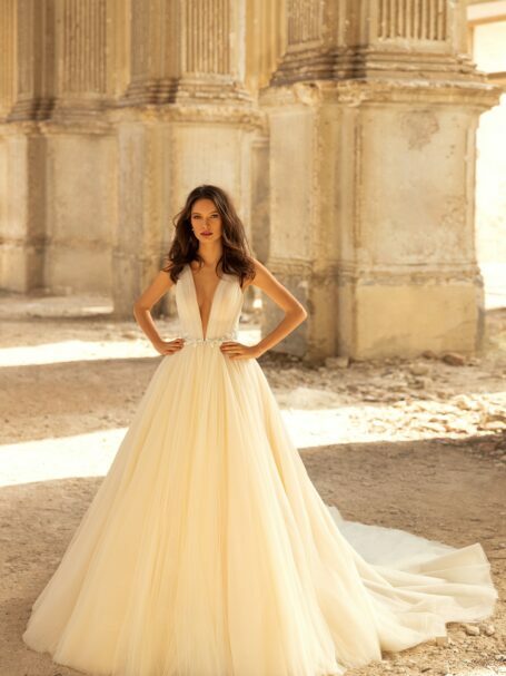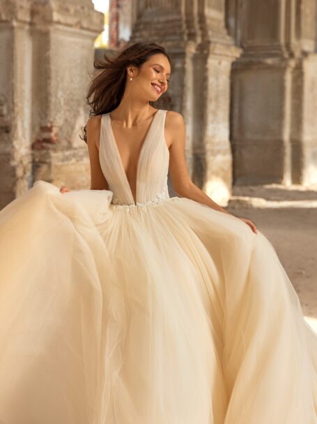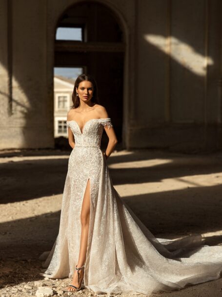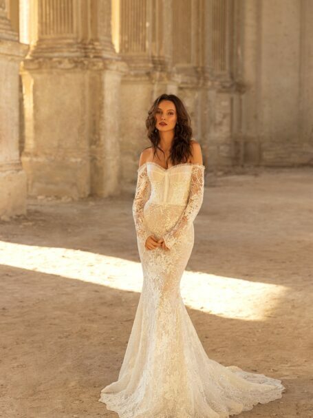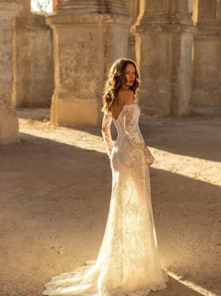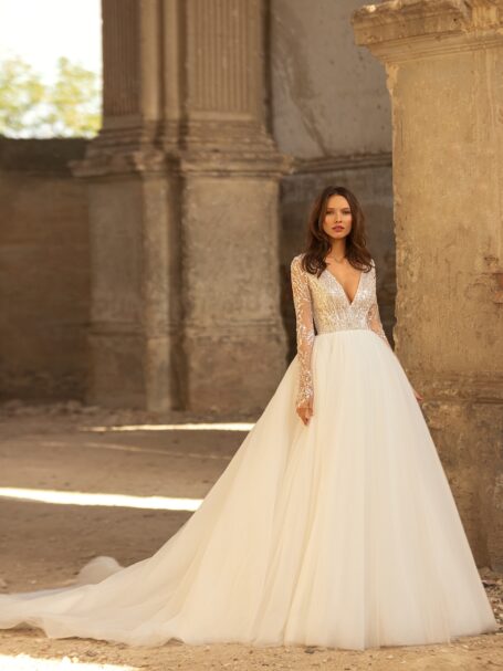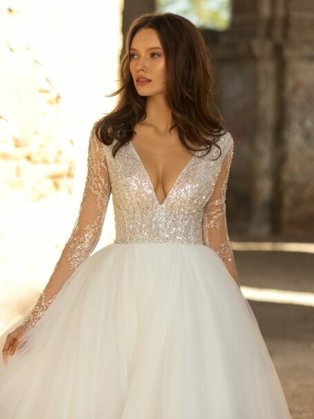 Victoria – це сукня з сердечкоподібним вирізом і довгими рукавами. Корсет і рукави прикрашені блискучими намистинами. Чарівний романтичний образ створений поєднанням простої спідниці з тюлем і корсету.