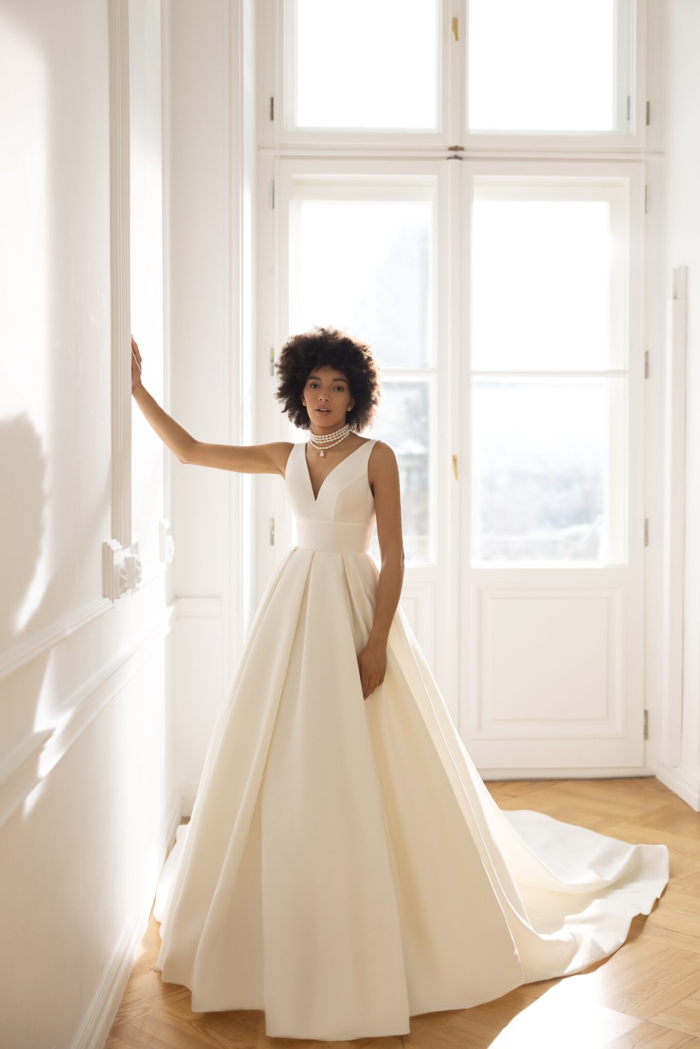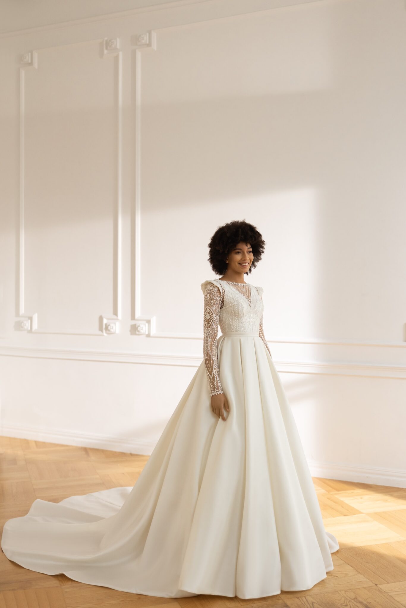 Відчуйте особливість, носячи це унікальне плаття у свою весільний день. Виконане з нашого чудового мікадо шовку, воно поєднується з нестандартним мереживом із прозорими пайетками, намистинами та перлами на знімному болеро. Ілюзійний V-подібний виріз на грудях додає чарівності до корсету, який прикрашений вишивкою з бісером. Довгі рукава із сітки з підкресленими плечима прикривають руки. Ілюзійна V-подібна спинка завершується охайними ґудзиками. Чудова спідниця з мікадо шовку спадає з ніжними складками, а кафедральний шлейф додає платтю остаточний штрих королівства.