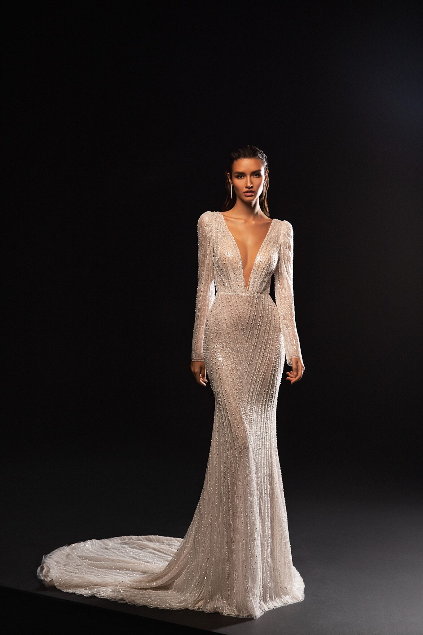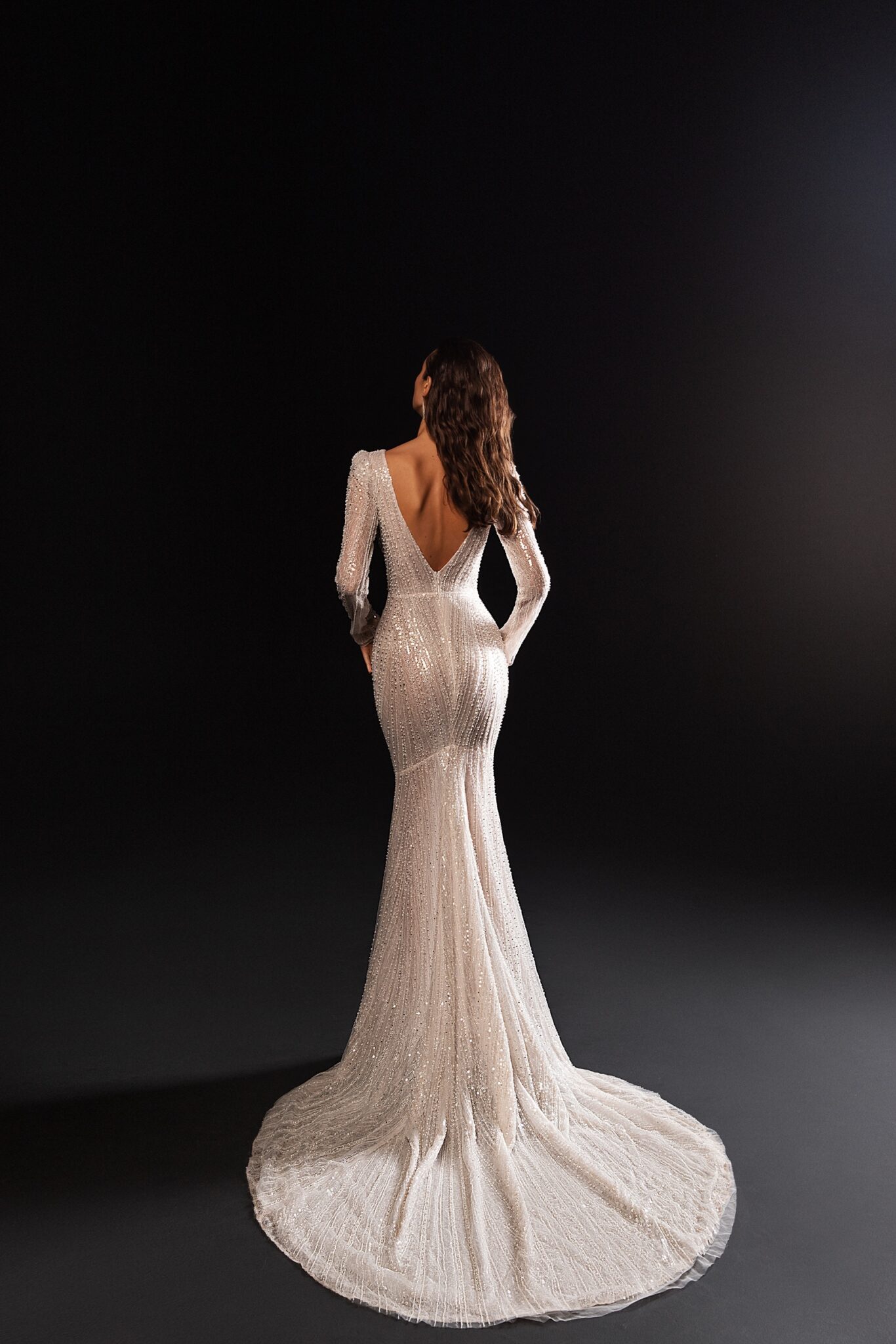 Сяюча та блискуча сукня Winoma – це величезна весільна сукня. V-подібний виріз знизу та глибока вирізка на спині виглядають фантастично.