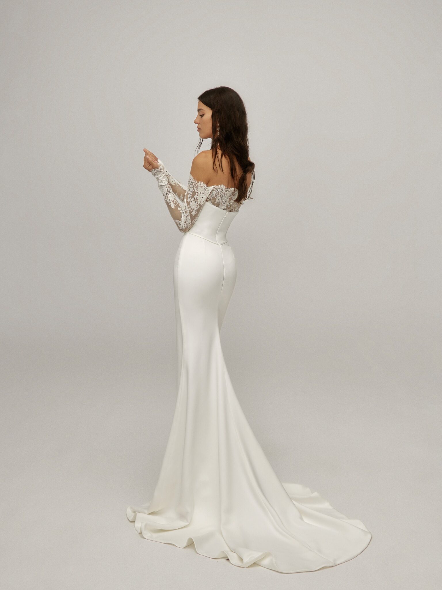 Образ доповнений знімним болеро з довгими рукавами, виконаним із ніжного мережива шантильї. Болеро спущене з плечей, а рукави застібаються на акуратні блискавки, забезпечуючи ідеальну посадку.