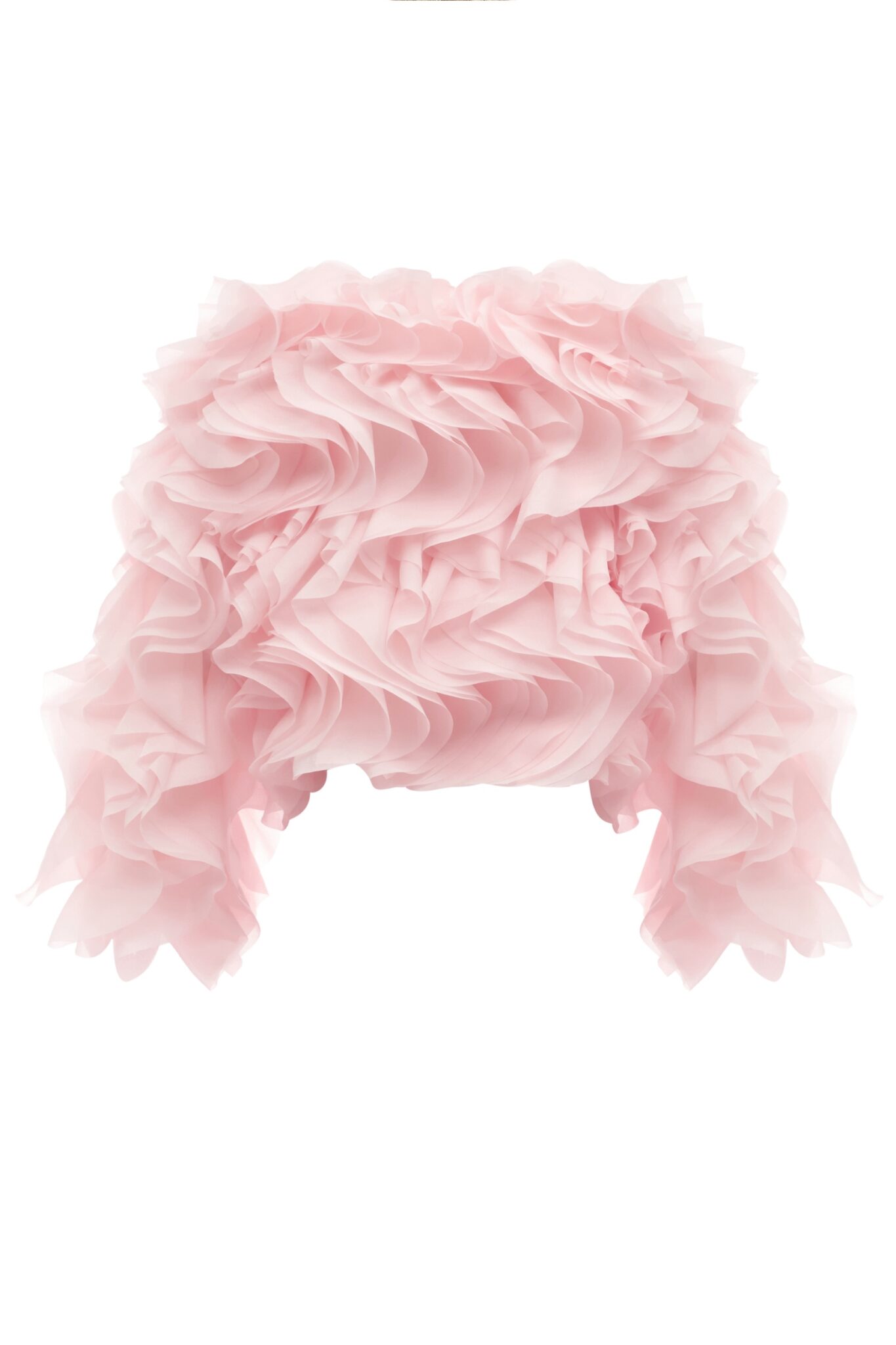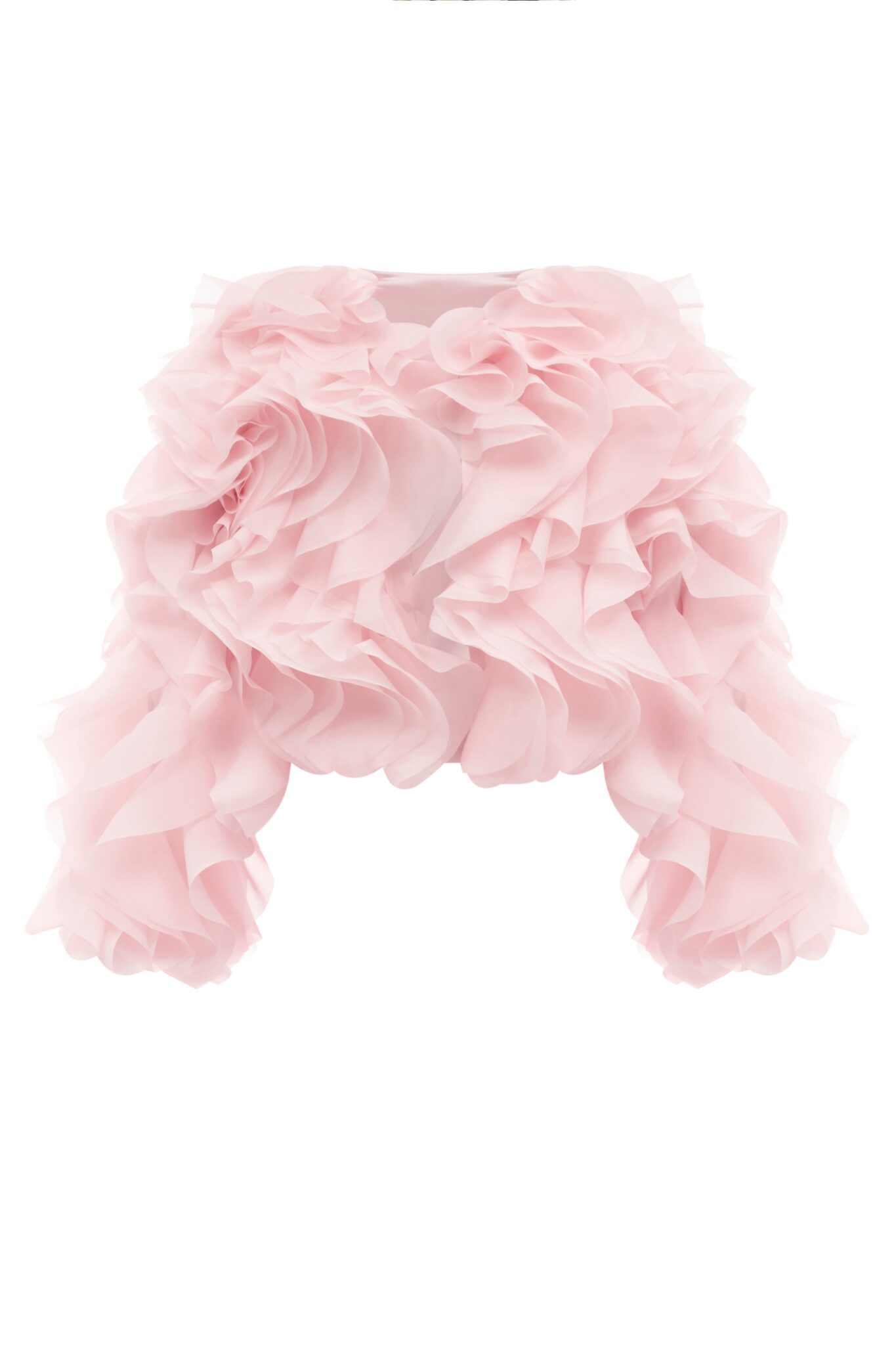 Обʼємний жакет на застібці, декорований хвилеподібними рюшами. Доступний в трьох кольорах: рожевому, молочному та чорному.