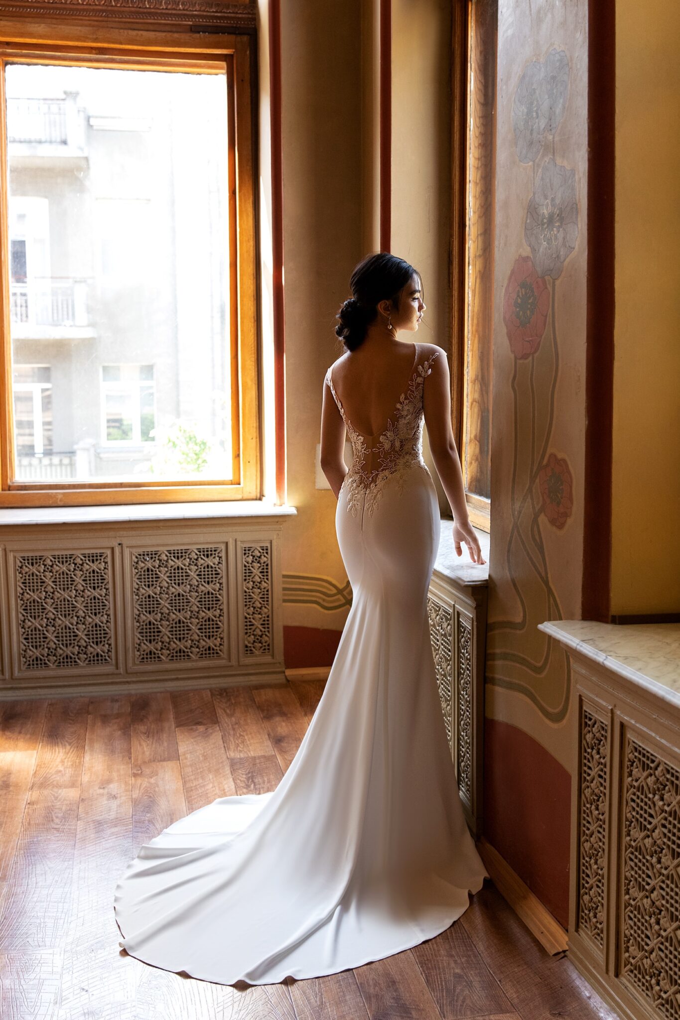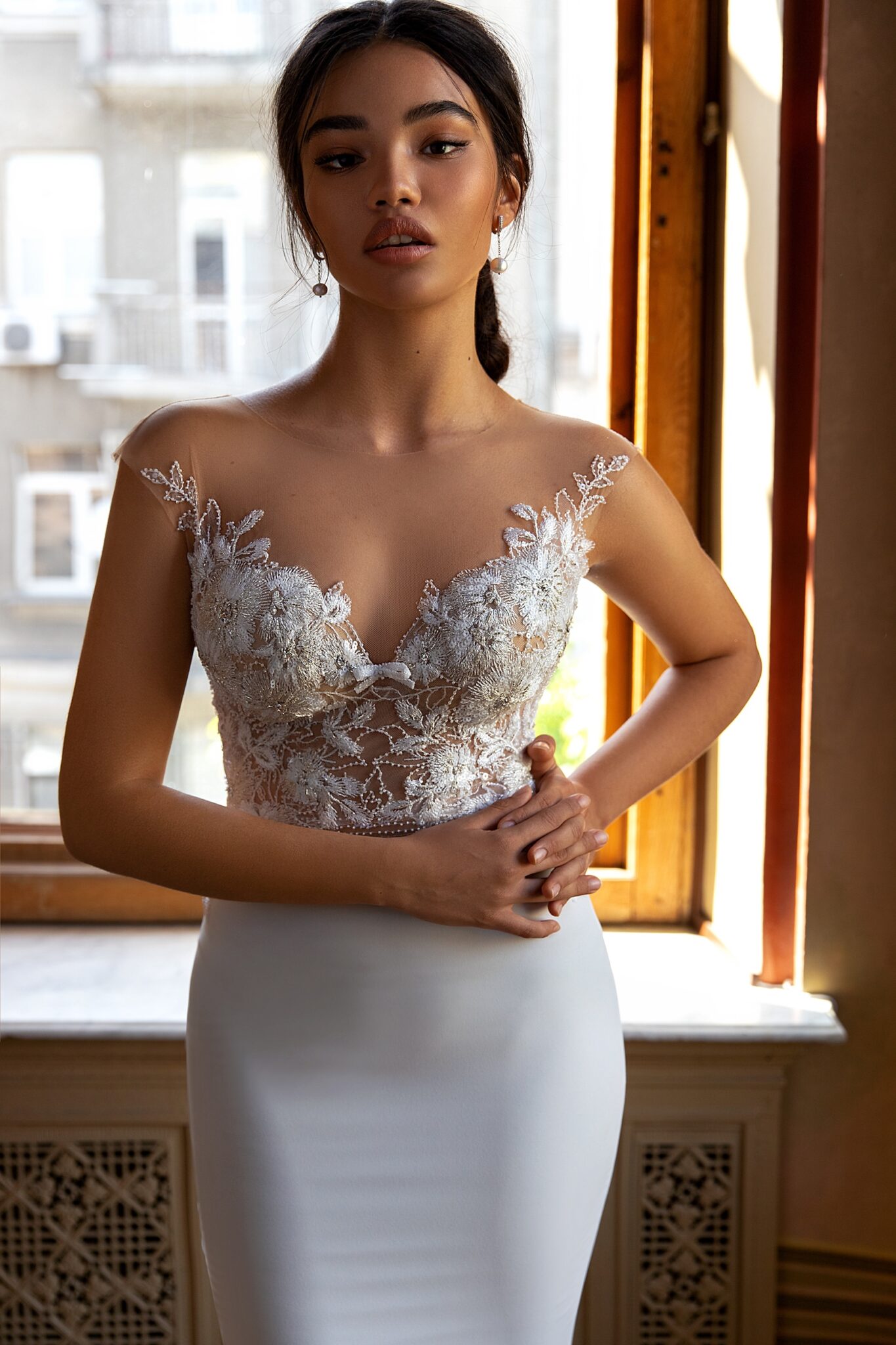 Zoila – це жіноча весільна сукня у стилі “чайка” з верхом з мережива. Лаконічна і мінімалістична весільна сукня з фантастичним шлейфом. Вона зроблена з мережива та креп-сатина. Сукня з силуетом у стилі “А-лінія” має глибокий виріз у формі серця, зроблений з тюлю та прикрашений мереживними елементами. Бідьє сукні цілком зроблено з мережива. Головний акцент припадає на спинку сукні. Верх прикрашений маленькими намистинами та перлами. Пряма спідниця підкреслює фігуру нареченої і переходить у короткий шлейф.